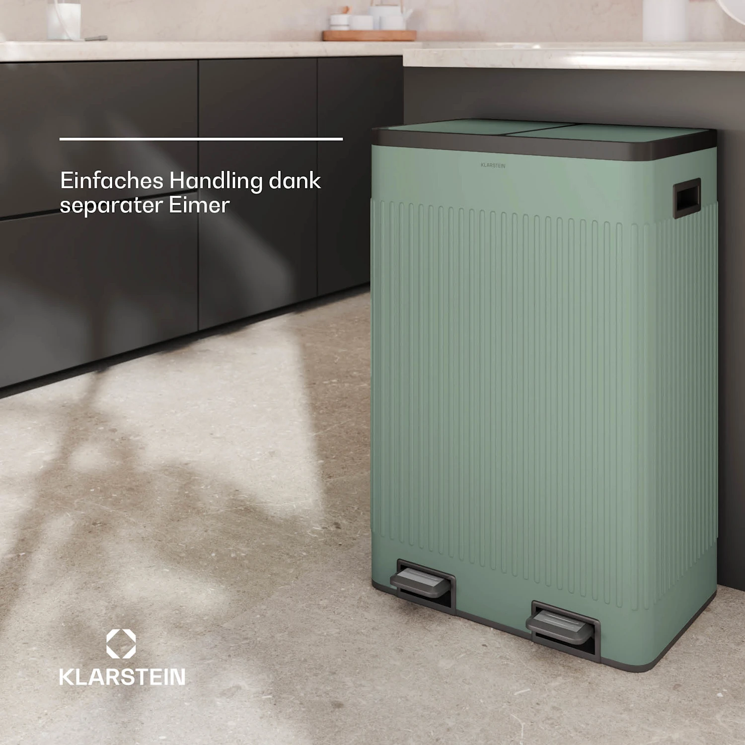 جداسازی آسان زباله، به خاطر محیط زیست: سطل زباله Klarstein Grama 40 تمام زبالهها را بدون دردسر میبلعد و آنها را به طور جداگانه در فضای داخلی دو قسمتی خود ذخیره میکند. این امر جداسازی مواد قابل بازیافت از زبالههای معمولی را آسان میکند.