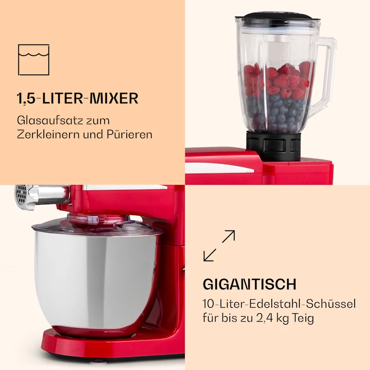 Renata Rossa Küchenmaschine 3-in-1 2000W 2,7PS 5Ltr Edelstahl BPA-frei Rot