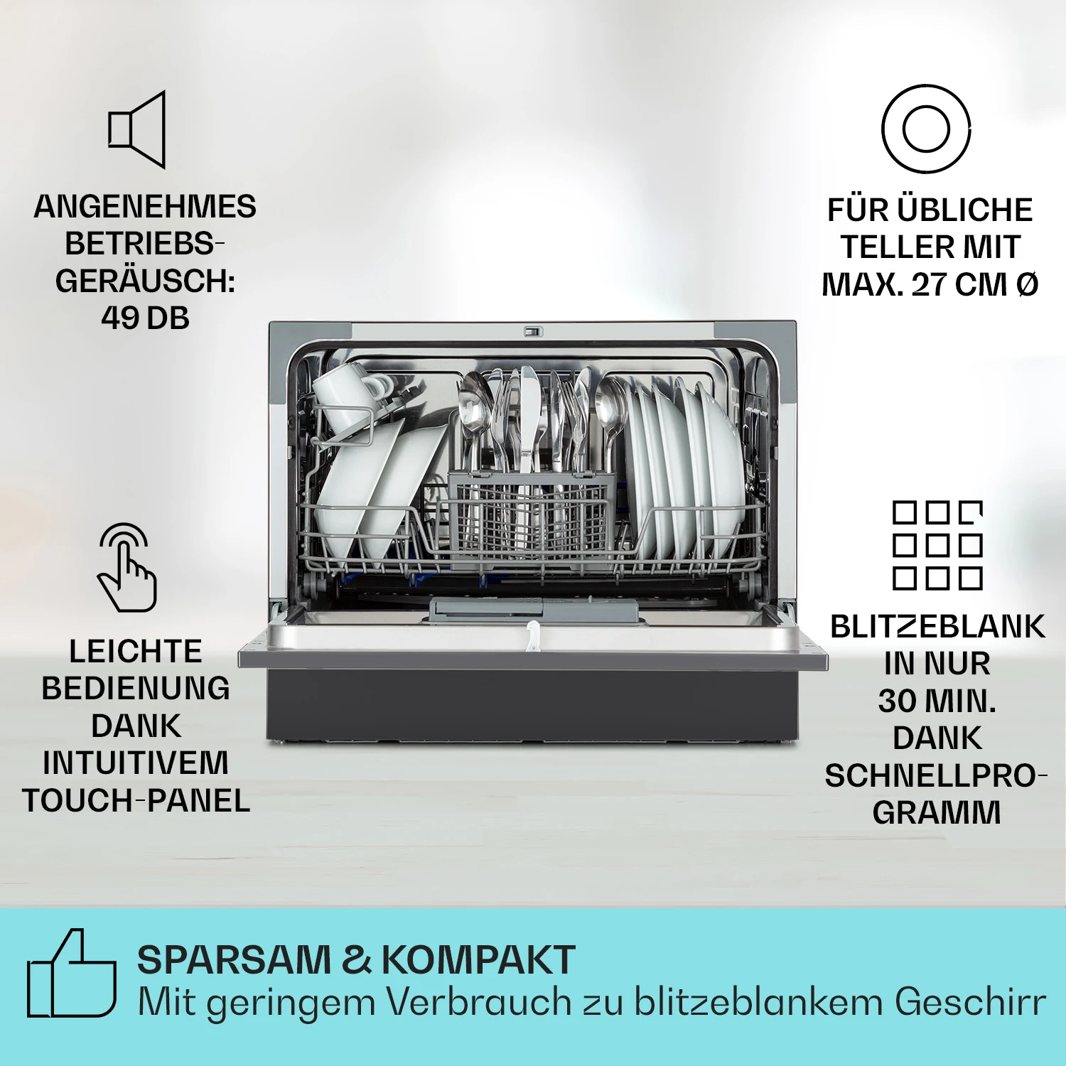 ماشین ظرفشویی Klarstein Amazonia 6 کمک تمیز کننده جدیدی در خانه شماست! در داخل اتاق برای حداکثر 6 تنظیمات مکان وجود دارد. آمازونیا 6 با توان 1380 وات و 6 برنامه مختلف به مقابله با ظروف کثیف می پردازد. همه برنامه ها را می توان به سرعت و به راحتی با استفاده از کنترل پنل مرتب با سه دکمه تنظیم کرد. نگهدارنده داخلی نیز امکان تمیز کردن آسان لیوان های شراب یا شامپاین را فراهم می کند. آمازونیا 6 را می توان به عنوان ماشین ظرفشویی توکار یا رومیزی استفاده کرد.