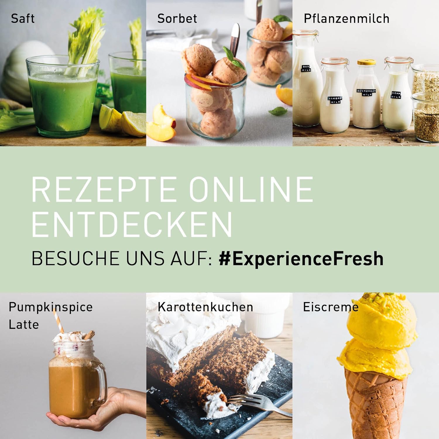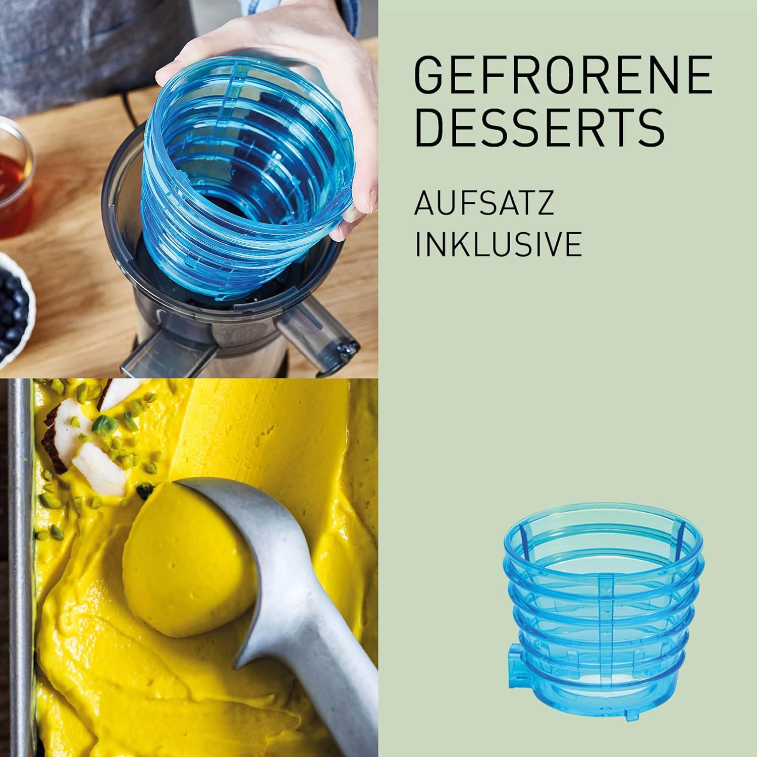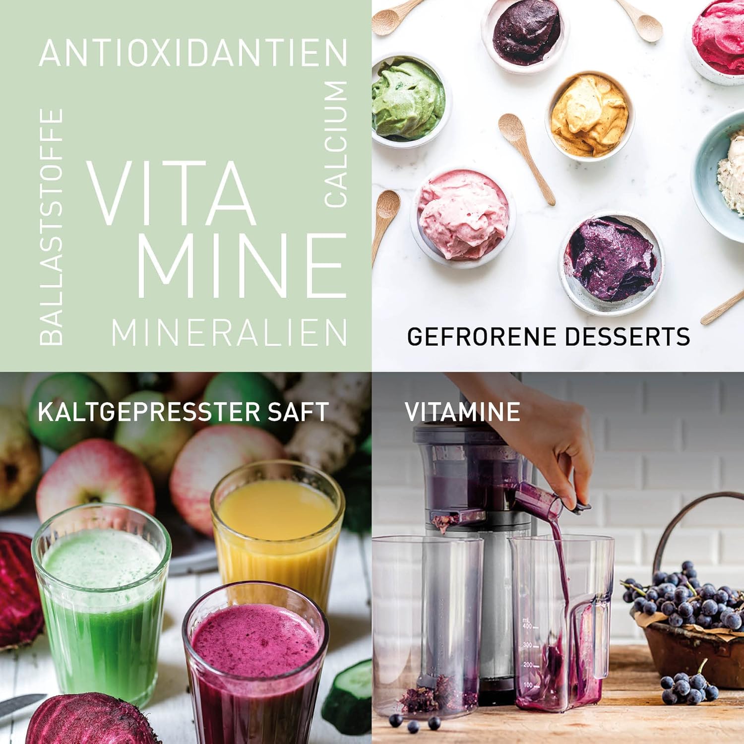 Gesund: Schonendes Entsaften dank geringer Drehzahl, wodurch weniger Wärme erzeugt wird und somit lebenswichtige Vitamine und Mineralstoffe erhalten bleiben Leise: Geringe Umdrehungszahl erzeugt wenig Motorgeräusche Einsatz für tiefgefrorene Früchte zur Herstellung von eisgekühlten Desserts Hohe Saftausbeute dank edelstahlverstärkter Press-Schnecke & leistungsstarkem Motor Zubehör: 980ml Saftbehälter mit Tropf-Stopp, Tresterbehälter mit großem Fassungsvermögen (1,3L) | قیمت یورویی : 139.99€