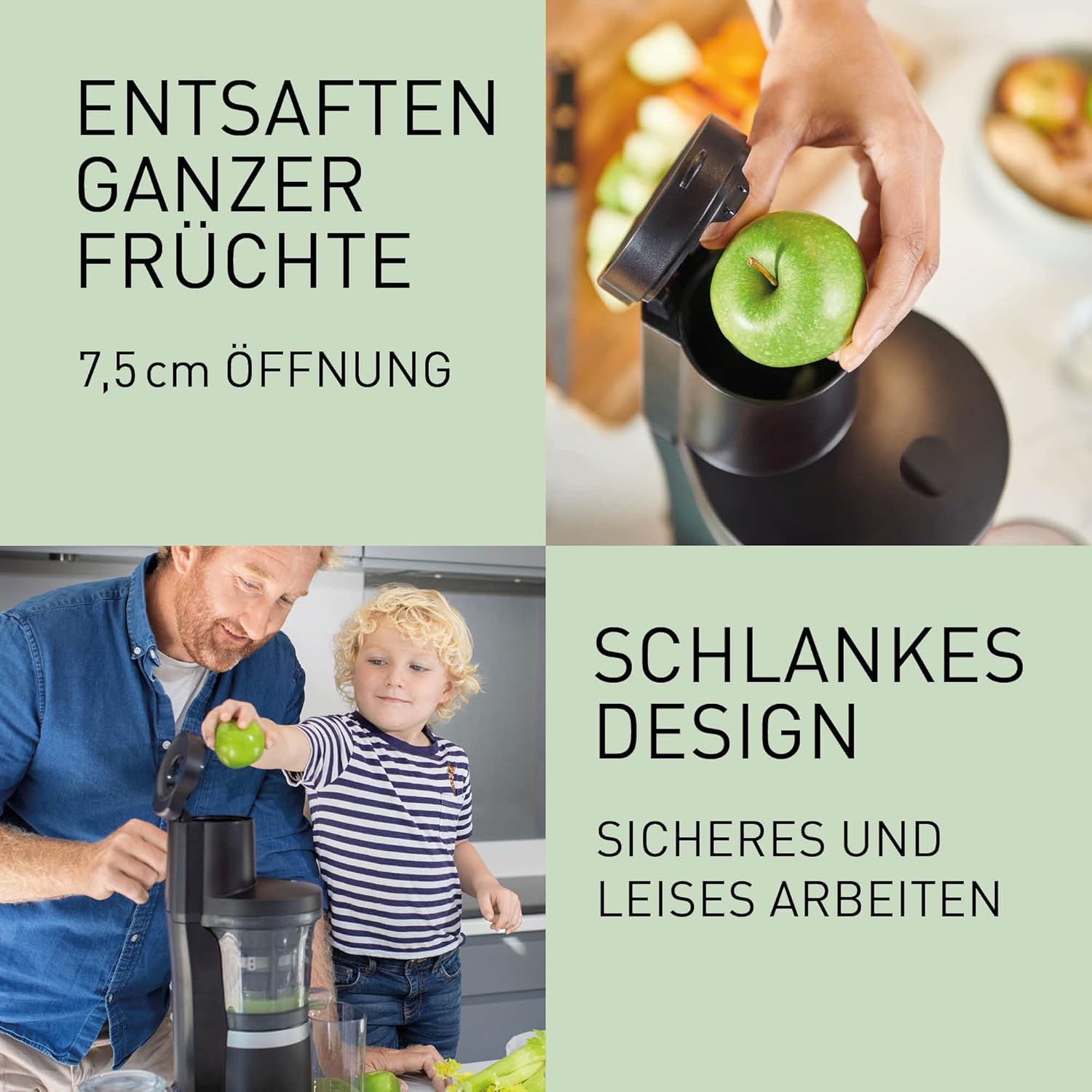 GANZE FRÜCHTE ENTSAFTEN: Dieser elektrische Slow Juicer hat eine weite Öffnung von 75 mm, sodass Sie ganze Früchte und Gemüse wie Äpfel, Birnen und Kiwis einfach hinzufügen können. Der langsame Pressvorgang liefert mehr Geschmack und Nährstoffe LEISTUNGSFÄHIGE ZERKLEINERUNG UND ENTSAFTUNG: Diese Fruchtpresse verfügt über einen langlebigen, effizienten und effektiven Zerkleinerungsmechanismus, der selbst harte Zutaten wie Karotten leicht verarbeitet SCHLANKES DESIGN: Die hochwertige schwarze, matte Oberfläche dieses Entsafters und die BPA-freie und bruchsichere Tritan-Schüssel machen den Entsafter zum perfekten Geschenk und Küchenaccessoire GESUNDE SÄFTE OHNE TRENNUNG: Der langsame Entsaftungsprozess dieser Entsaftermaschine mit edelstahlverstärkter Schnecke sorgt für einen höheren Nährstoffgehalt ohne Safttrennung VOLLER GESCHMACK: Dieser leicht zu reinigende Gemüseentsafter trennt das Fruchtfleisch und den Saft fein voneinander und verleiht Ihnen jedes Mal einen vollen und natürlichen Geschmack SICHER, BEQUEM & LEICHT ZU REINIGEN: Dieser Entsafter schaltet sich automatisch aus, wenn der Deckel geöffnet wird, während Sie durch die kleine Deckelöffnung Zutaten während des Betriebs hinzufügen können. Einfache Demontage erleichtert die Reinigung | قیمت یورویی : 199€