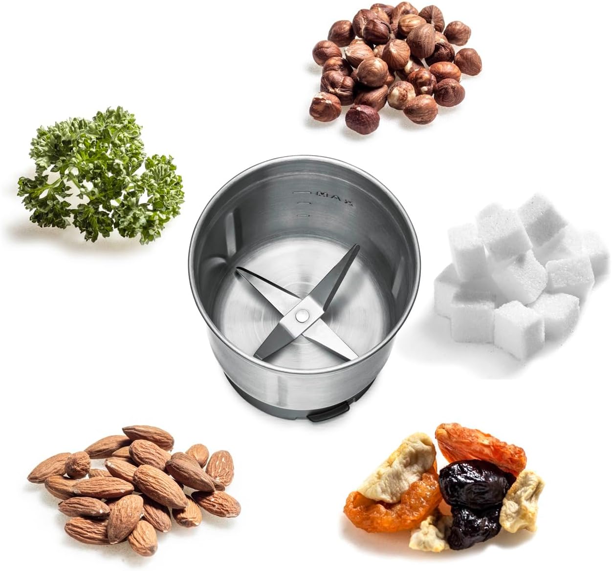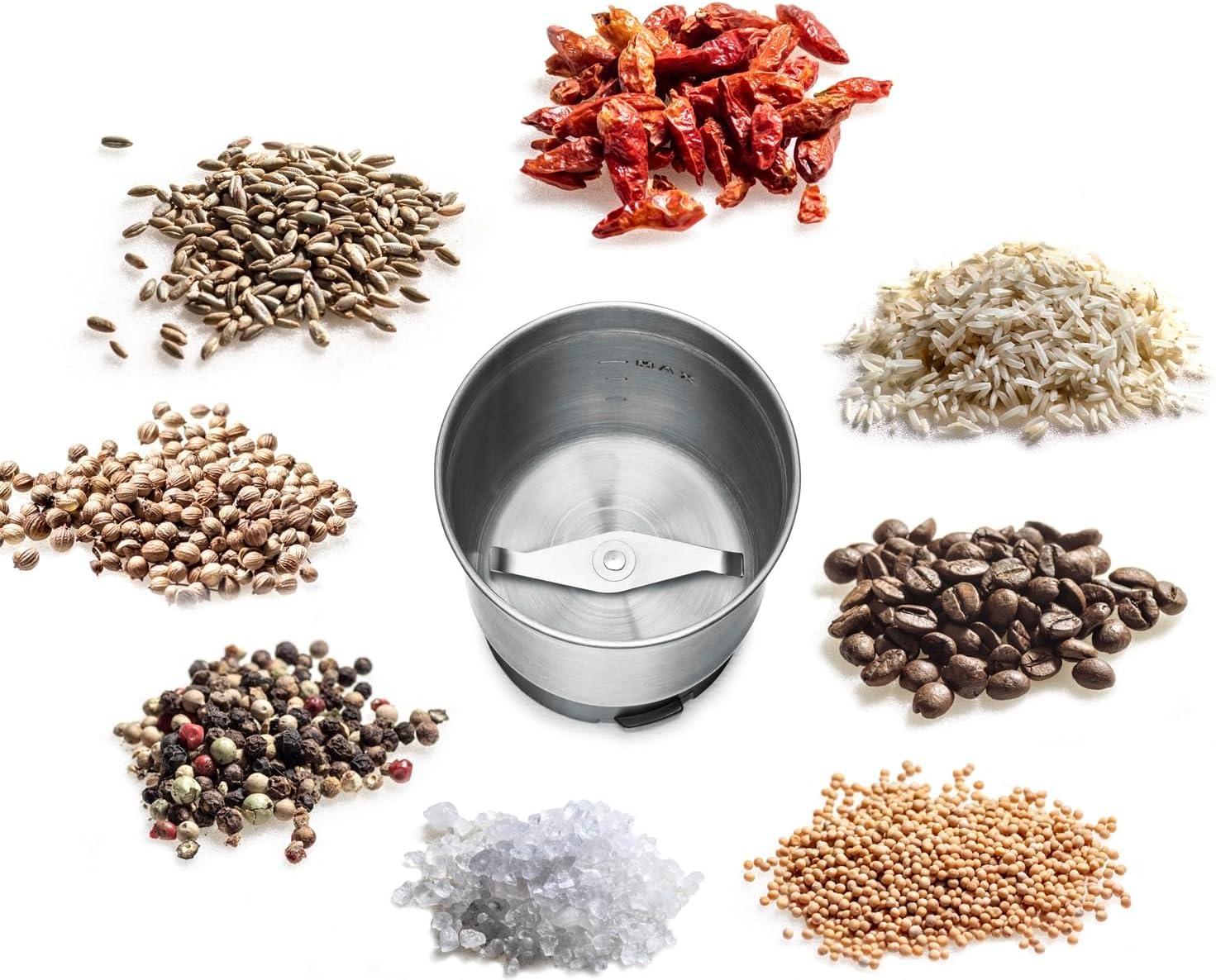 leistungsstarker Motor, leise im Betrieb, hochwertiges, pflegeleichtes Gehäuse aus gebürstetem Edelstahl robustes Schlagwerk, Mahlgrad über die Mahldauer individuell einstellbar Ein/Ausschalten per Druck auf Gehäusedeckel, einfache Bedienung und sichere Handhabung abnehmbare Teile spülmaschinengeeignet, abnehmbarer, transparenter Deckel, integrierte Kabelaufwicklung Inklusive: 2 auswechselbare Behälter aus Edelstahl, extra große Füllmenge: 70 Gramm: Mahlbehälter mit 2-flügeligem Edelstahl Schlagmesser, Universalbehälter mit 4-flügeligem Edelstahl Spezialmesser; Kaffeelot mit Reinigungsbürste | قیمت یورویی : 34.98€