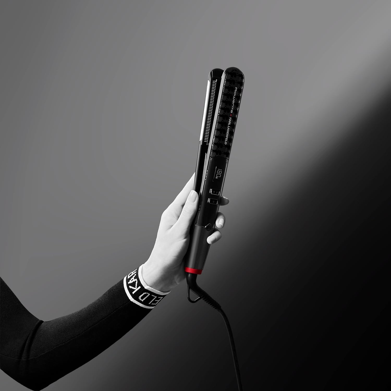 اتو مو روونتا آلمان Rowenta Karl Lagerfeld SF467L K/Pro Stylist، پوشش کراتین و براق کننده، عملکرد یونی، صفحات صاف کننده فنری، 140 تا 210 درجه سانتیگراد، شانه یکپارچه، مشکی/قرمز