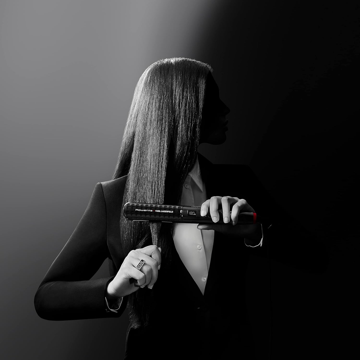 Rowenta x Karl Lagerfeld SF467L K/Pro Stylist Haarglätter, Keratin & Glow-Beschichtung, Ionen-Funktion, Federnd gelagerte Glättplatten, von 140°C bis 210°C, integrierter Kamm, Schwarz/Rot