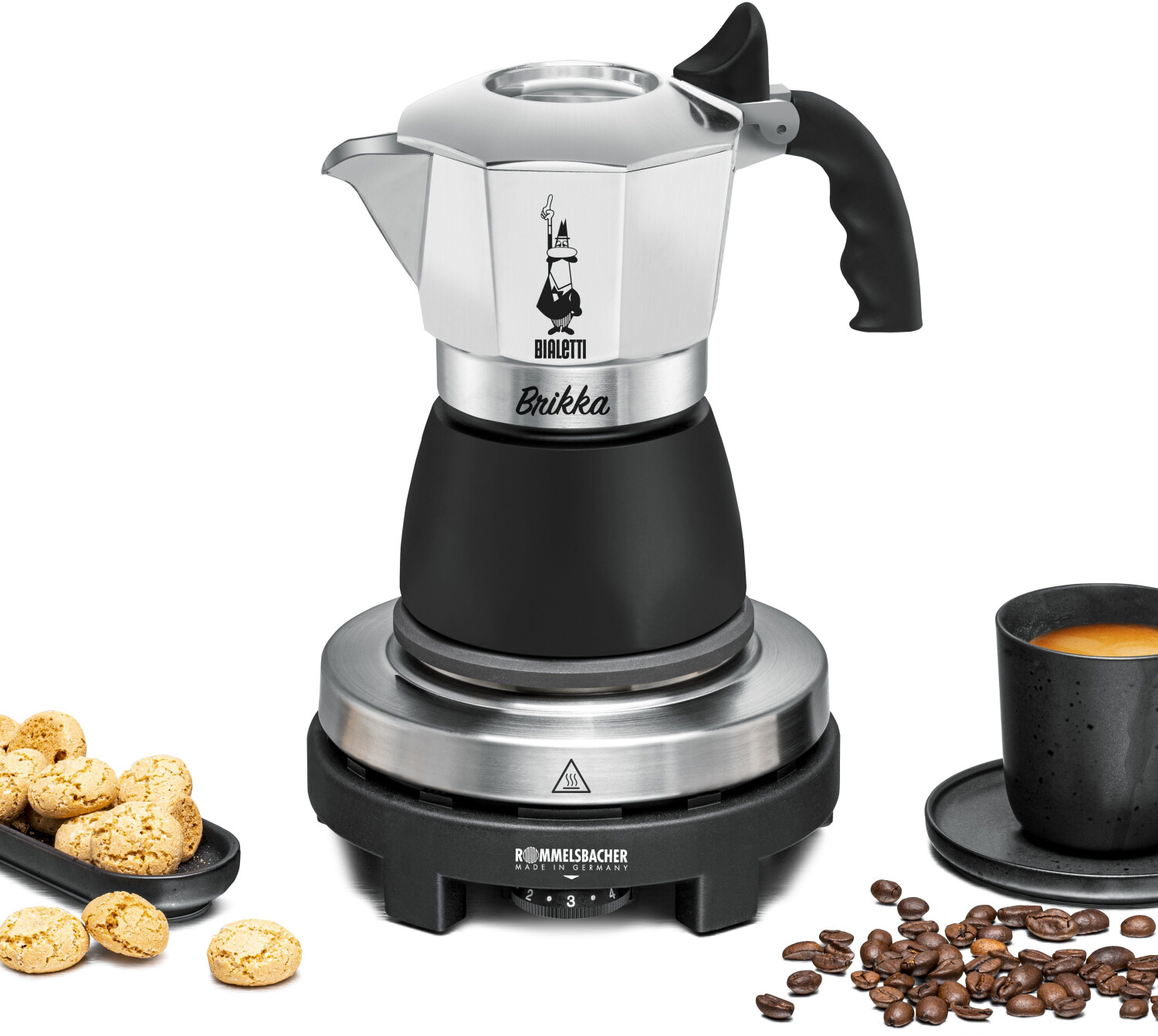 ست کادو اسپرسو روملزباخر Espresso Geschenkset RK 505/K شامل یک صفحهگرمکن برقی رومیزی RK 501 و یک قوری موکا اصلی Bialetti Brikka برای تهیه قهوه اسپرسو/موکا با کرمای واقعی است.