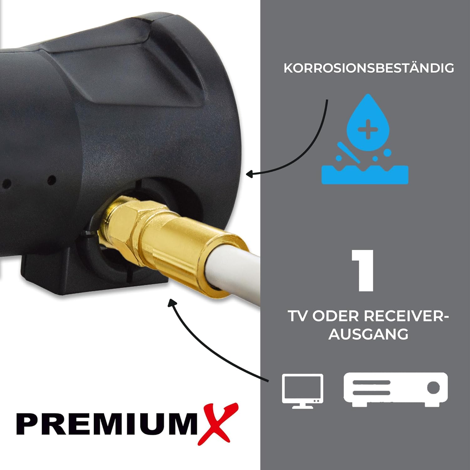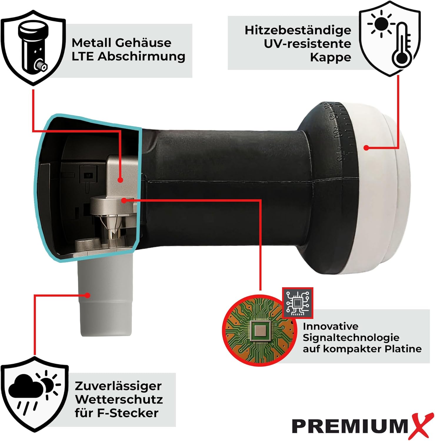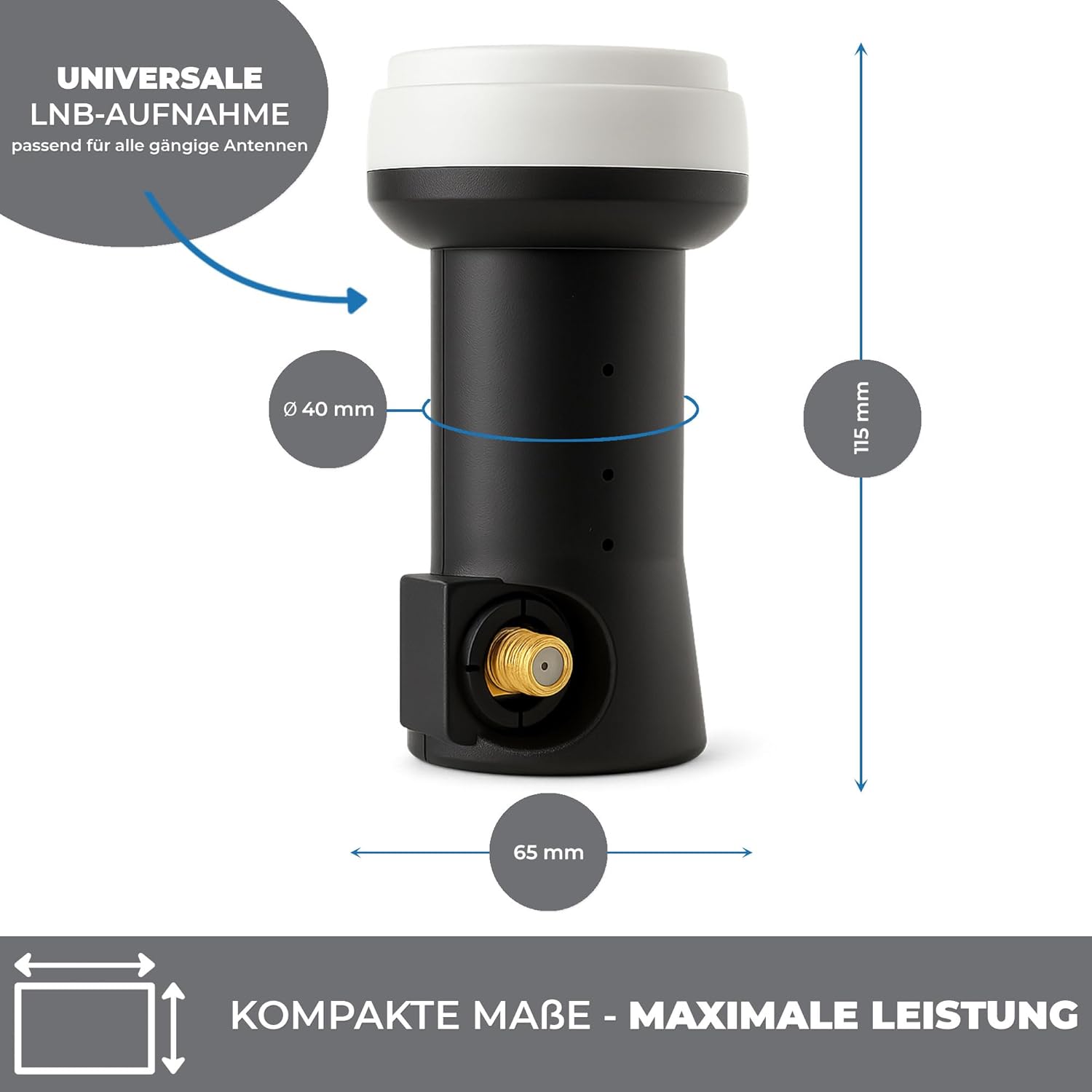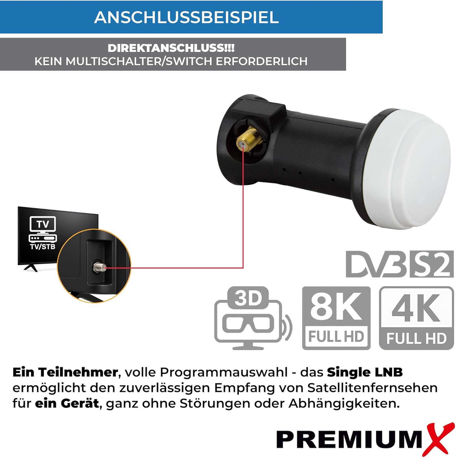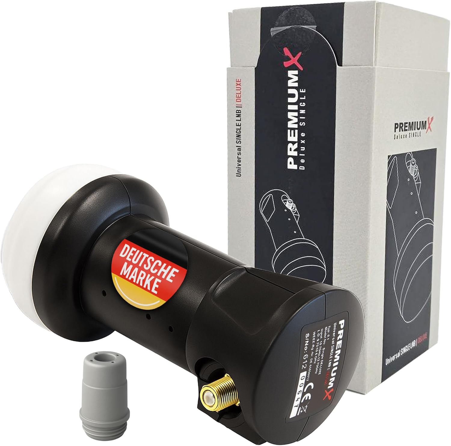 Premium X Deluxe Single LNB – 1-Fach LNC Kopf mit LTE-Filter – SAT PLL Technik – 1 Teilnehmer – Digital UHD 4K 8K Full HD 3D – vergoldete Kontakte - Wetterschutz – Schwarz Single LNB - 1 Teilnehmer | قیمت یورویی 19.95€