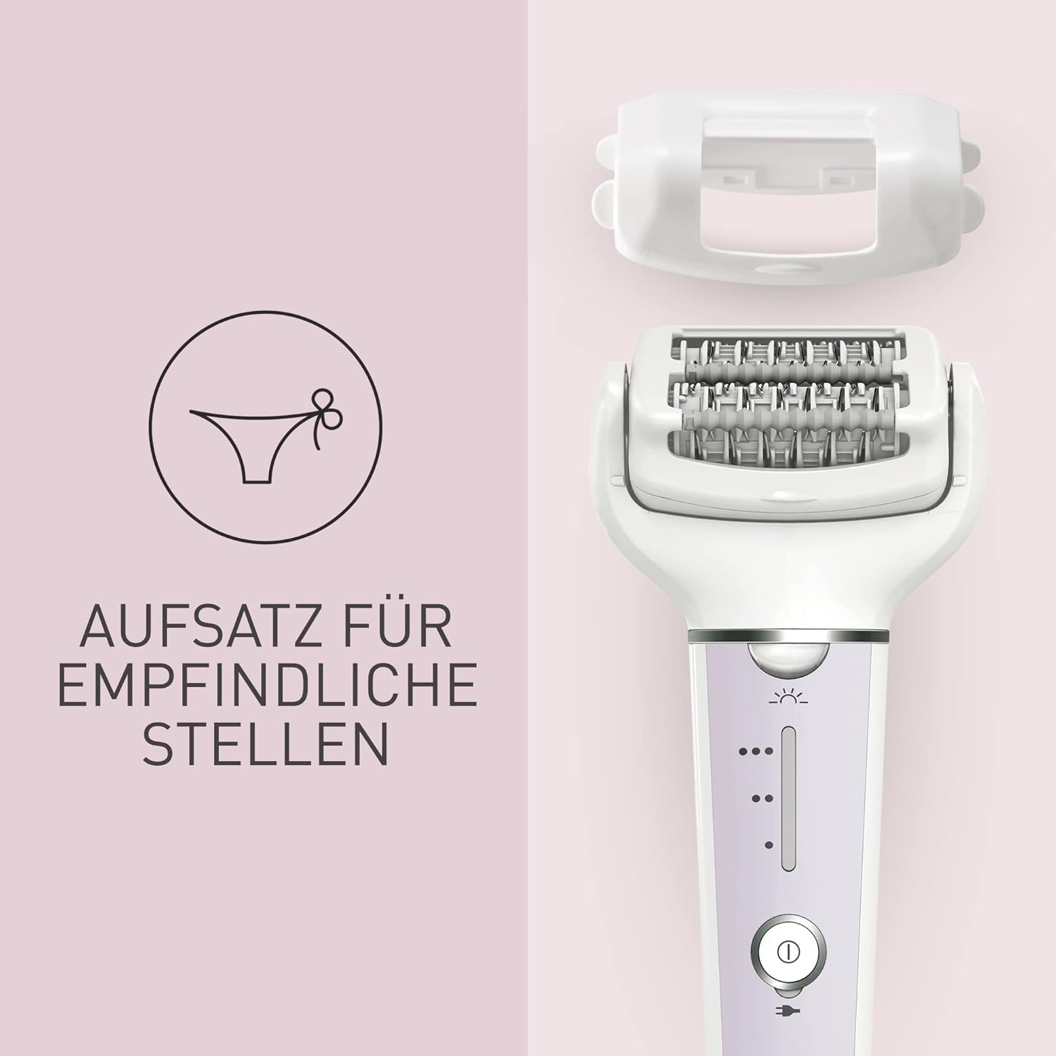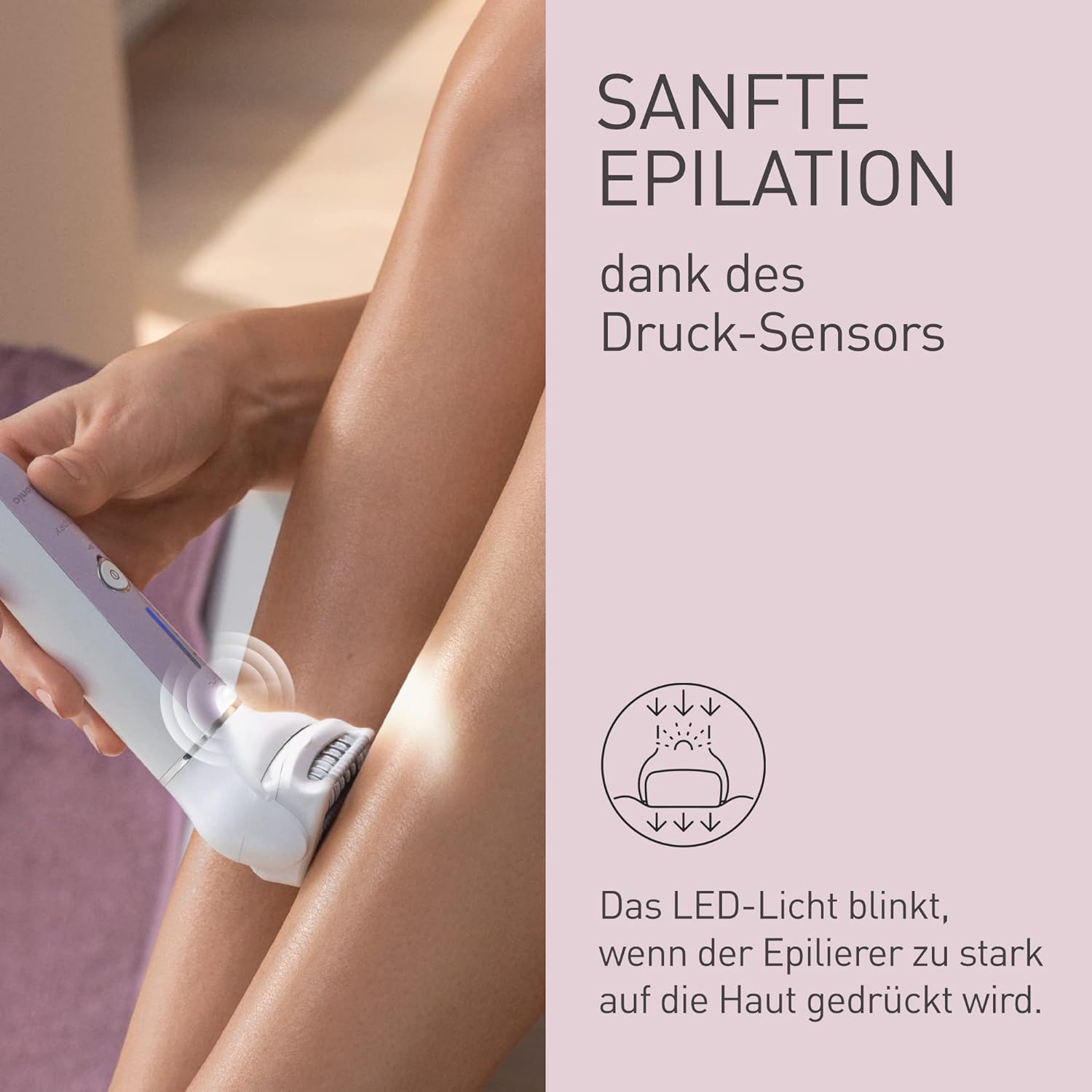 EXTRA BREITER 90° FLEXIBLER KOPF: Der 90° flexible Kopf gleitet mühelos über die Haut und folgt sogar schwer zugänglichen Stellen, während dank extra breitem Kopf mehr Haare in einem Zug entfernt werden, für eine schnellere, glattere Epilation. DUAL DISC MIT 60 PINZETTEN: Der Doppelscheibenkopf sorgt dafür, dass übrig gebliebenes Haar aufgefangen wird, während 60 Pinzetten mehr Haare erfassen und die Epilation beschleunigen. NASS-/TROCKENBETRIEB & SANFTE AUFLAGE: Das wasserdichte Design dieses Haarentferners ermöglicht den Gebrauch in der Badewanne für mehr Komfort, während Duschgel für die Schaumepilation verwendet werden kann. Minimale Irritationen mit sanftem Aufsatz. 3 GESCHWINDIGKEITSEINSTELLUNGEN & LED-LICHT: Dieser Epilierer für Frauen gibt Ihnen die Kontrolle mit Soft-, Normal- und Power-Modus, während das LED-Licht schwer sichtbare Bereiche beleuchtet, damit Sie keine Haare übersehen. BREITE AUSWAHL AN ZUBEHÖR: Das Zubehörsortiment dieses Epilierers, darunter ein Epilationskopf, ein kleiner Epilationskopf, eine sanfte Kappe, ein Beutel und eine Bürste, machen ihn zum perfekten Geschenk. EINFACH AUFZULADEN UND ZU REINIGEN: Dieser kabellose Epilierer lässt sich schnell aufladen, mit einer Ladedauer von einer Stunde für bis zu 30 Minuten Nutzung – ideal für unterwegs. Das wasserdichte Design lässt sich unter fließendem Wasser säubern. H: 16.5cm, W: 6.9cm, D: 4.9cm, Weight: 175g. | قیمت یورویی : 59.49€