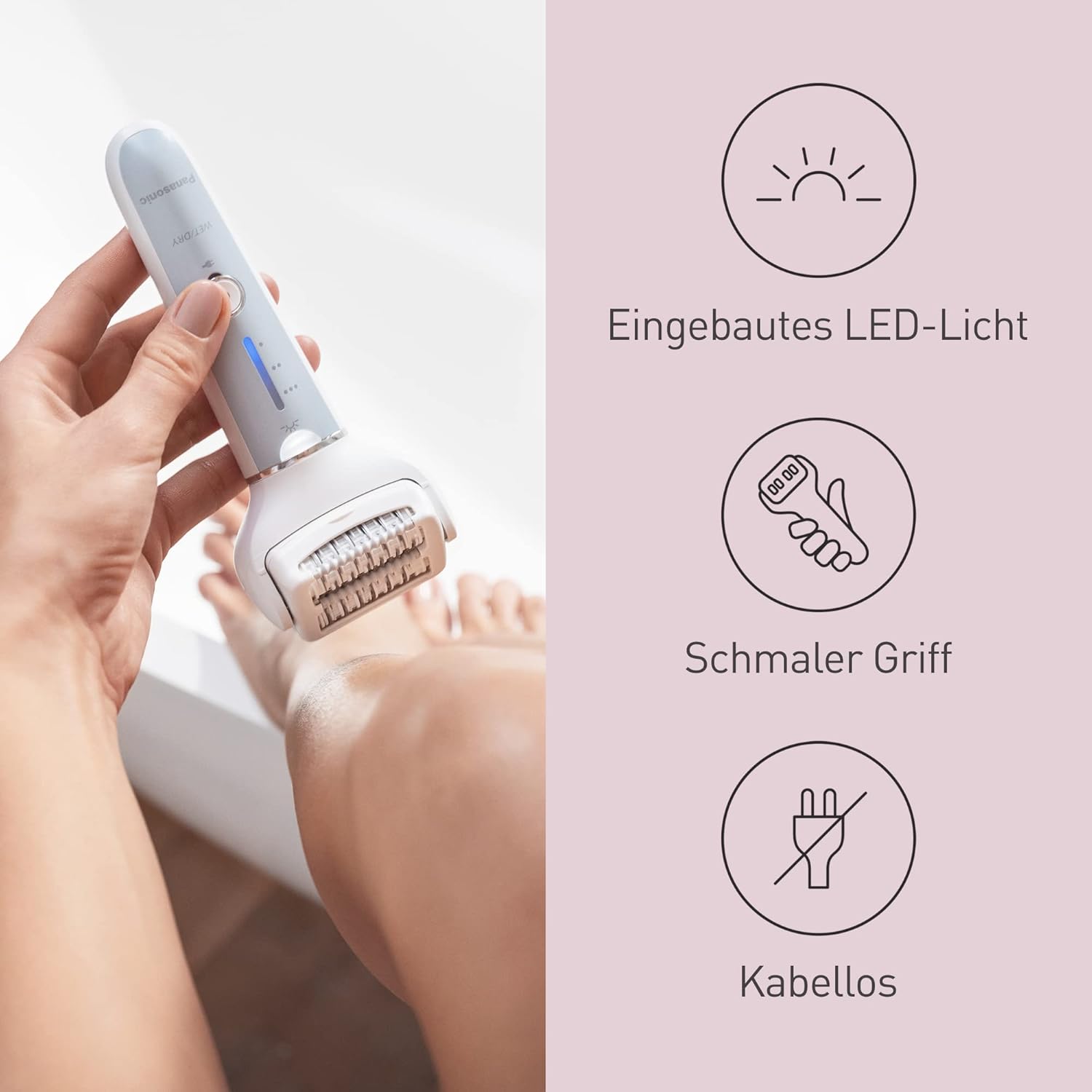 Panasonic ES-EY90 Nass/Trockenepilierer Damen, Dual Disc mit 60 Pinzetten, 90° schwenkbarer Kopf, 3 Geschwindigkeiten & LED-Licht, 30 Min. Betrieb, kabellos, Haarentferner, Scher- und Fußpflegekopf 7-in-1 Nass-/Trocken-Epilierer