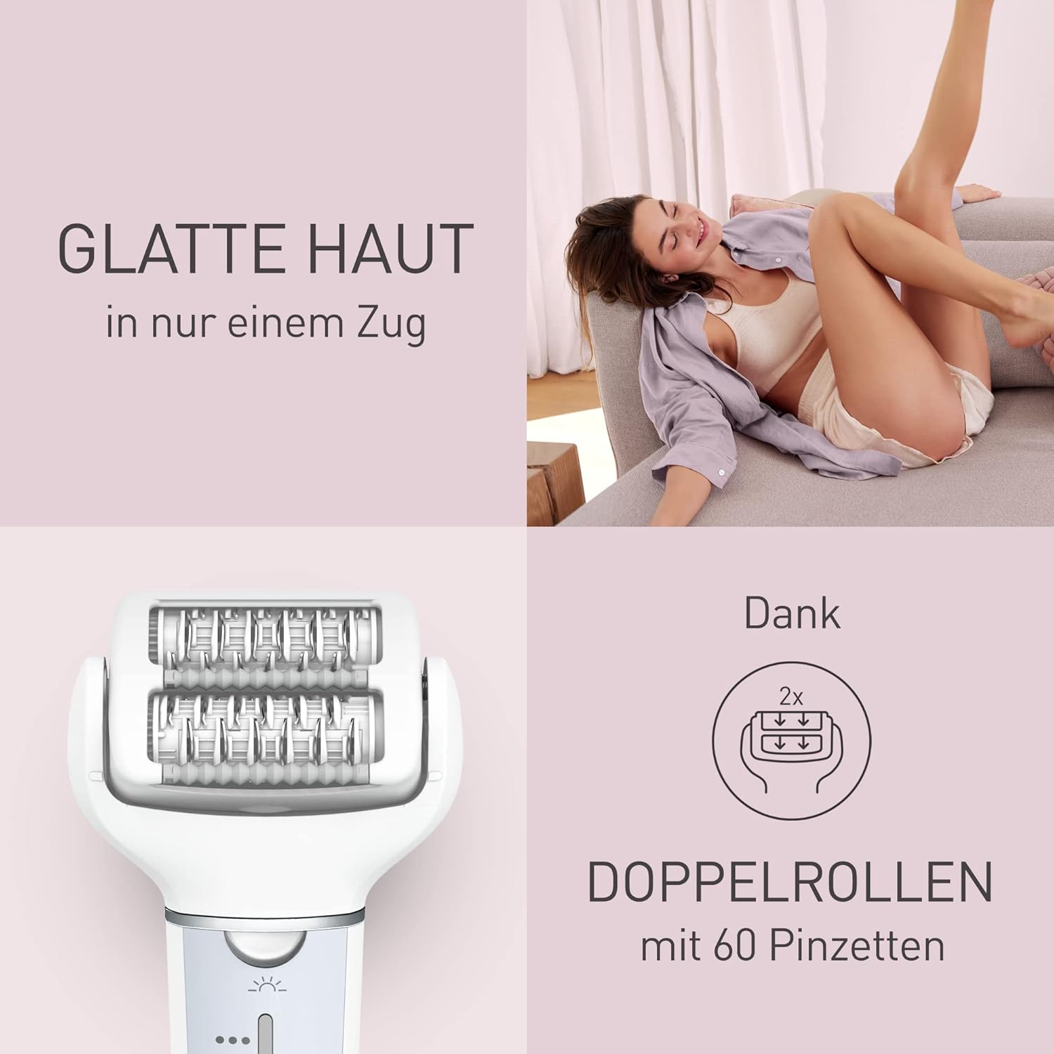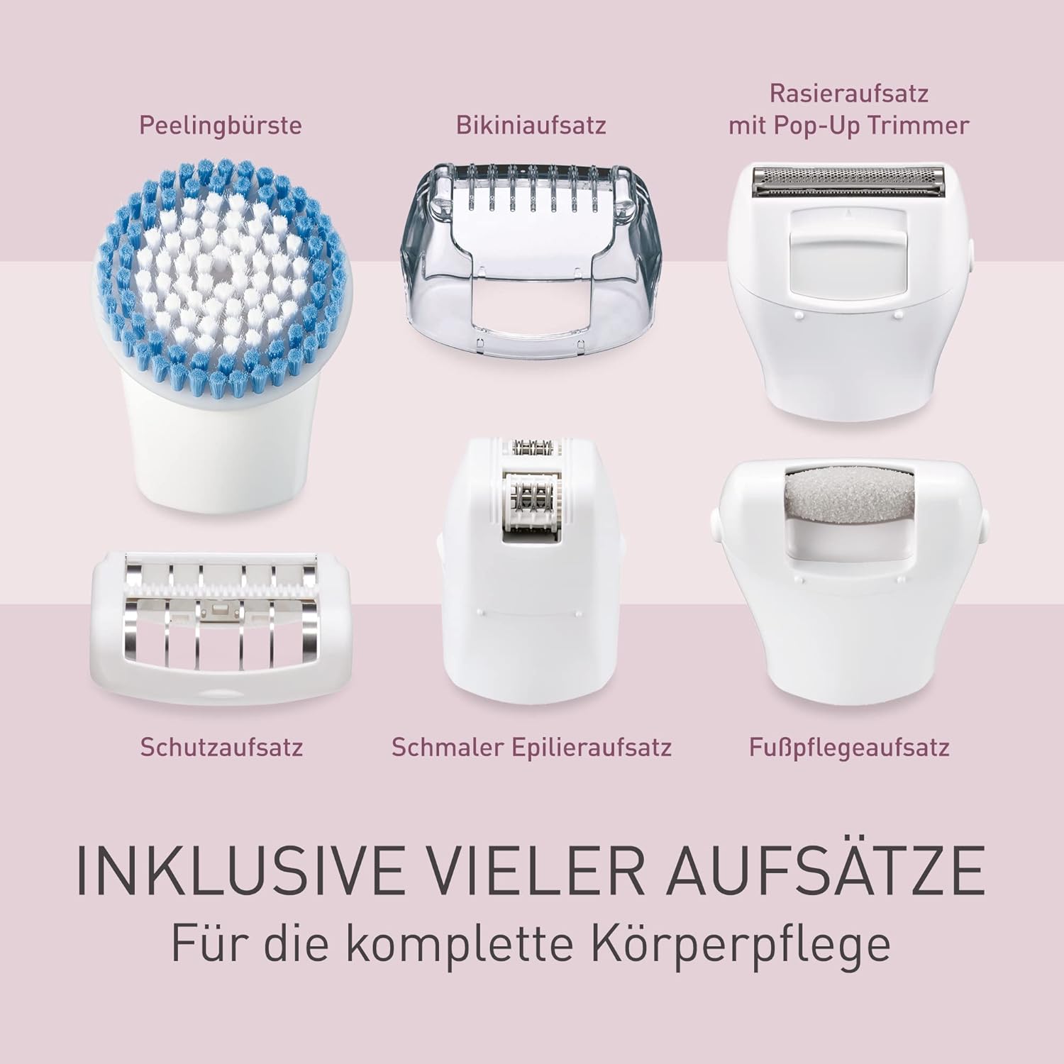 EXTRA BREITER 90° FLEXIBLER KOPF: Der 90° flexible Kopf gleitet mühelos über die Haut und folgt sogar schwer zugänglichen Stellen, während dank extra breitem Kopf mehr Haare in einem Zug entfernt werden, für eine schnellere, glattere Epilation DUAL DISC MIT 60 PINZETTEN: Der Doppelscheibenkopf sorgt dafür, dass übrig gebliebenes Haar aufgefangen wird, während 60 Pinzetten mehr Haare erfassen und die Epilation beschleunigen NASS-/TROCKENBETRIEB & SANFTE AUFLAGE: Das wasserdichte Design dieses Haarentferners ermöglicht den Gebrauch in der Badewanne für mehr Komfort, während Duschgel für die Schaumepilation verwendet werden kann. Minimale Irritationen mit sanftem Aufsatz 3 GESCHWINDIGKEITSEINSTELLUNGEN & LED-LICHT: Dieser Epilierer für Frauen gibt Ihnen die Kontrolle mit Soft-, Normal- und Power-Modus, während das LED-Licht schwer sichtbare Bereiche beleuchtet, damit Sie keine Haare übersehen BREITE AUSWAHL AN ZUBEHÖR: Vielseitiges Zubehörsortiment, darunter Epilierkopf, kleiner Epilierkopf, sanfter Aufsatz, Scherkopf, Pop-Up-Trimmer, Bikinikamm, Fußpflegekopf, Sonic Scrub Bürste, Beutel und Bürste – das gute Geschenk EINFACH AUFZULADEN UND ZU REINIGEN: Dieser kabellose Epilierer lässt sich schnell aufladen, mit einer Ladedauer von einer Stunde für bis zu 30 Minuten Nutzung – optimal für unterweg;. Das wasserdichte Design lässt sich unter fließendem Wasser säubern | قیمت یورویی : 99.89€