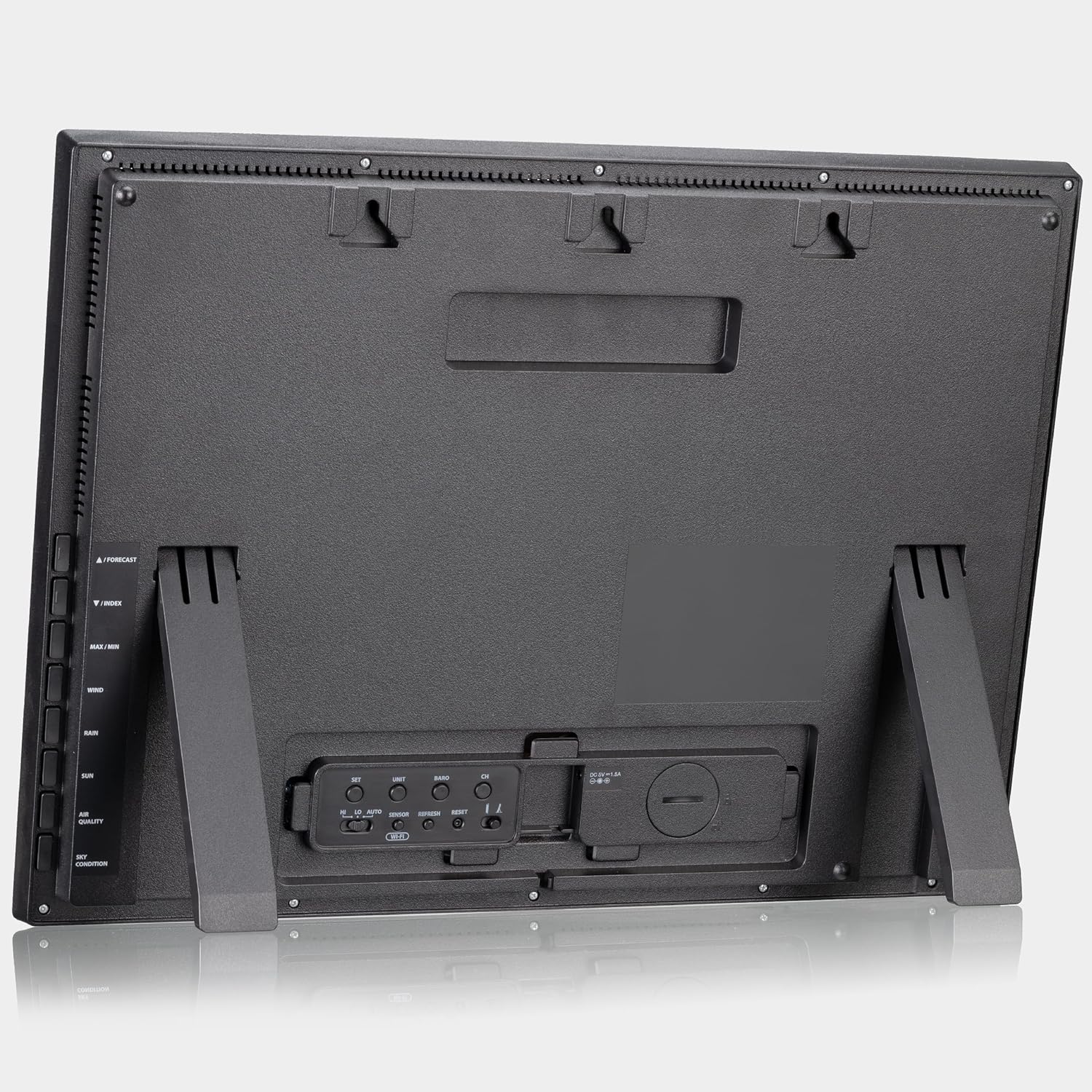 Diese Wetterstation zeigt echte Größe – mit dem riesigen 48,3-cm-Display, der umfassenden 8-Tage-Wettervorhersage und dem umweltfreundlichen Solar-Multisensor Misst Temperatur sowie Luftfeuchtigkeit innen und außen, Luftdruck, Niederschlag, Windgeschwindigkeit und -richtung, automatische Einstellung und Anzeige von Uhrzeit und Datum, Wecker mit Schlummerfunktion, Eis-/Frostwarnung Extra-großes 48,3-cm-(19'')-Farbdisplay mit schmalem Rand, Weitwinkel-Display für bequemes Ablesen der Daten bei Wandmontage, WLAN-Verbindung zur Veröffentlichung lokaler Wetterdaten auf Portalen wie AWEKAS oder Weather Underground und weitere Maße: Basis: 419 x 308 x 30 mm, Sensor: 390 x 174 x 465 mm; Stromzufuhr Basisstation: Netzstecker (enthalten); CR2032 Back-up-Batterie (nicht enthalten); Stromzufuhr Außensensor: Solarpaneel + integrierter wiederaufladbarer Akku (enthalten) Lieferumfang: Wetterstation, solar-Außensensor, Netzstecker, Anleitung | قیمت یورویی : 399€