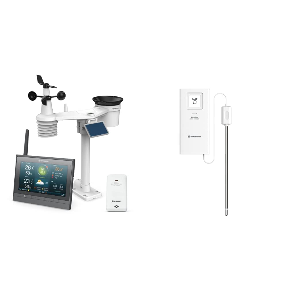 ایستگاه هواشناسی بیسیم Bresser با سنسور فضای باز - با انرژی خورشیدی - و سنسور حرارتی-رطوبتی بیسیم MeteoChamp HD، مرکز هواشناسی Wi-Fi 7 در 1 و دماسنج خاک و رطوبت سنج به عنوان سنسورهای اضافی، بسته ایستگاه هواشناسی 7 در 1 Bresser با دماسنج خاک