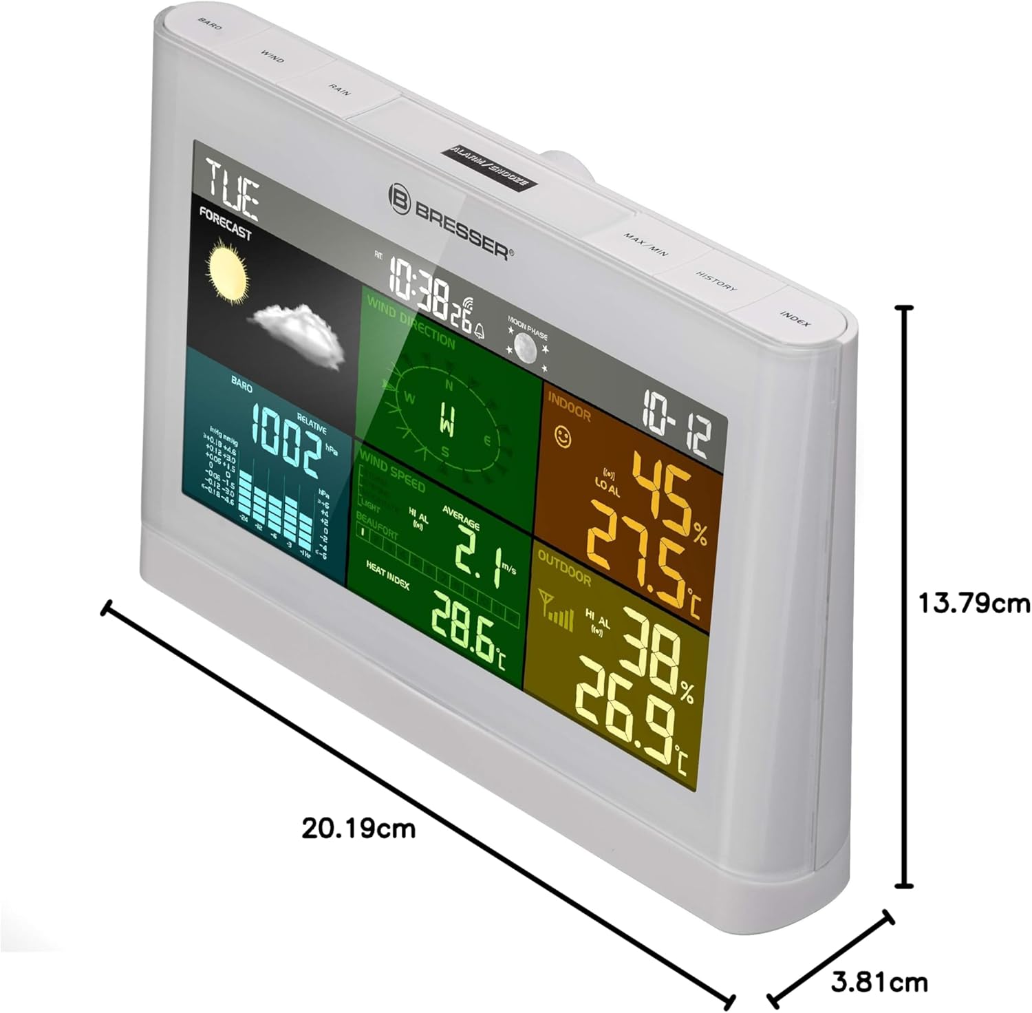 Bresser Wetterstation Funk mit Außensensor Wetter Center mit 5-in-1 Außensensor (Temperatur, Luftdruck, Luftfeuchtigkeit, Windmesser, Regenmesser), weiß weiß Single لینک آمازون : https://www.amazon.de/dp/B085FPVCF5?th=1&psc=1 صفحه نمایش بزرگ - صفحه نمایش رنگی بزرگ ۷.۳ اینچی ایستگاه هواشناسی بیسیم ۵ در ۱، نمای کلی واضحی از تمام عملکردهای مهم را به شما ارائه میدهد. شش بخش با رنگهای مختلف، دید صفحه نمایش را که از قبل هم خوانا بود، بهبود میبخشند. صفحه نمایش LCD با کیفیت بالا به طور مداوم دارای نور پس زمینه است (هنگامی که با برق شهری تغذیه میشود) و به صورت اختیاری میتوان آن را از طریق حسگر نور یکپارچه کنترل کرد. سنسور فضای باز ۵ کاره - سنسور فضای باز ۵ کاره اطلاعات فعلی دما، رطوبت، فشار هوا، سرعت و جهت باد و میزان بارندگی را نمایش میدهد. حافظه تاریخچه به شما امکان میدهد مقادیر قبلی چند ساعت گذشته را بازیابی کنید. عملکردهای فراوان - علاوه بر اندازهگیریها، ایستگاه هواشناسی بیسیم ۵ کاره، ساعت زنگدار، هشدار یخبندان، تنظیم زمان و تاریخ با کنترل رادیویی (DCF)، نمایش فاز ماه فعلی، شاخص بوفورت، شاخص گرما، نقطه شبنم و پیشبینی آب و هوای ۱۲ ساعته را ارائه میدهد. مشخصات فنی — ایستگاه: 202x138x38 میلیمتر / واحد حسگر فضای باز: 344x394x136 میلیمتر؛ وزن: 682 گرم / برای کار به 6 باتری قلمی نیاز دارد (شامل نمیشود) محتویات بسته — ایستگاه پایه، حسگر چندگانه ۵ در ۱ به همراه سختافزار نصب، آداپتور برق، دفترچه راهنما