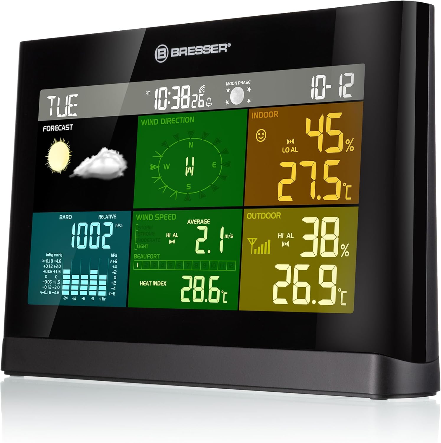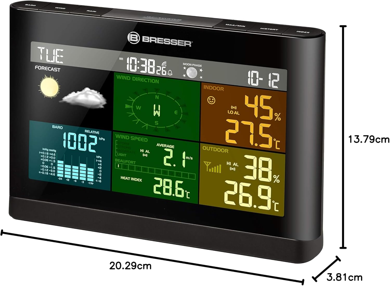 Bresser Wetterstation Funk mit Außensensor Wetter Center mit 5-in-1 Außensensor (Temperatur, Luftdruck, Luftfeuchtigkeit, Windmesser, Regenmesser), Schwarz, 20.2x13.8x3.8 cm schwarz Single لینک آمازون : https://www.amazon.de/dp/B075GQX5QY?th=1&psc=1 صفحه نمایش بزرگ - صفحه نمایش رنگی بزرگ ۷.۳ اینچی ایستگاه هواشناسی بیسیم ۵ در ۱، نمای کلی واضحی از تمام عملکردهای مهم را به شما ارائه میدهد. شش بخش با رنگهای مختلف، دید صفحه نمایش را که از قبل هم خوانا بود، بهبود میبخشند. صفحه نمایش LCD با کیفیت بالا به طور مداوم دارای نور پس زمینه است (هنگامی که با برق شهری تغذیه میشود) و به صورت اختیاری میتوان آن را از طریق حسگر نور یکپارچه کنترل کرد. سنسور فضای باز ۵ کاره - سنسور فضای باز ۵ کاره اطلاعات فعلی دما، رطوبت، فشار هوا، سرعت و جهت باد و میزان بارندگی را نمایش میدهد. حافظه تاریخچه به شما امکان میدهد مقادیر قبلی چند ساعت گذشته را بازیابی کنید. عملکردهای فراوان - علاوه بر اندازهگیریها، ایستگاه هواشناسی بیسیم ۵ کاره، ساعت زنگدار، هشدار یخبندان، تنظیم زمان و تاریخ با کنترل رادیویی (DCF)، نمایش فاز ماه فعلی، شاخص بوفورت، شاخص گرما، نقطه شبنم و پیشبینی آب و هوای ۱۲ ساعته را ارائه میدهد. مشخصات فنی — ایستگاه: 202x138x38 میلیمتر / واحد حسگر فضای باز: 344x394x136 میلیمتر؛ وزن: 682 گرم / برای کار به 6 باتری قلمی نیاز دارد (شامل نمیشود) محتویات بسته — ایستگاه پایه، حسگر چندگانه ۵ در ۱ به همراه سختافزار نصب، آداپتور برق، دفترچه راهنما
