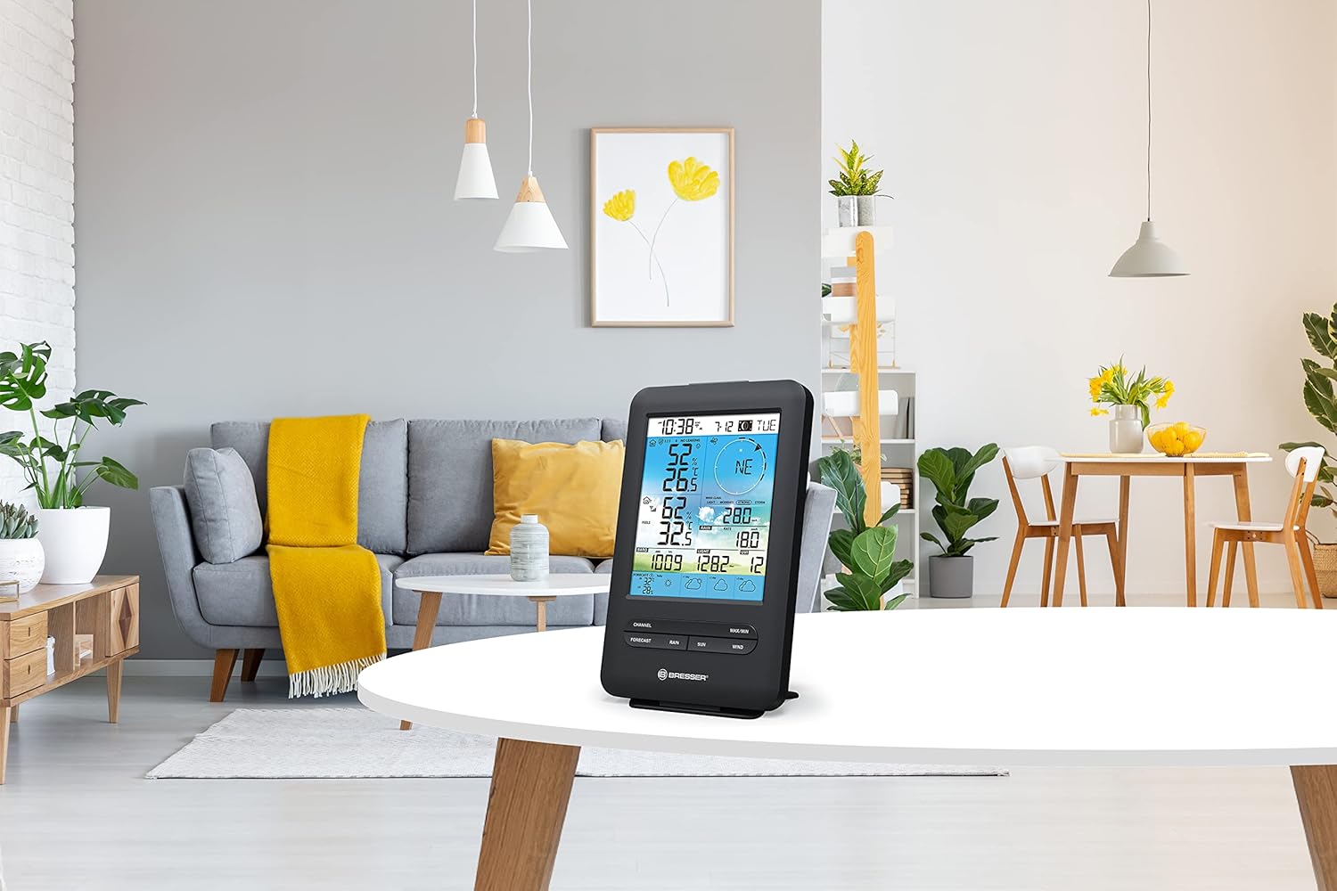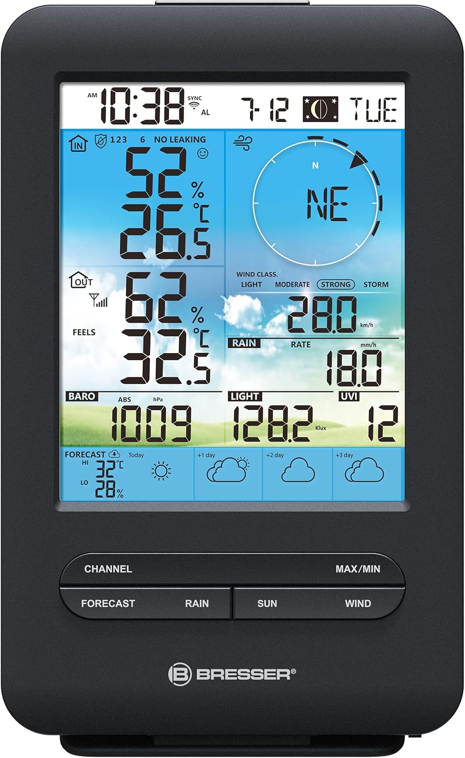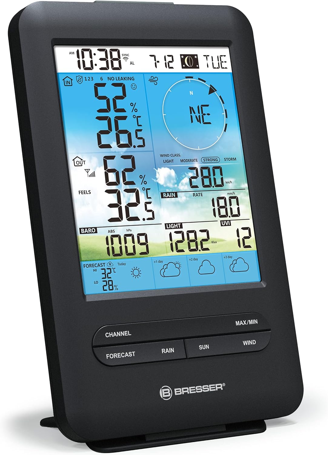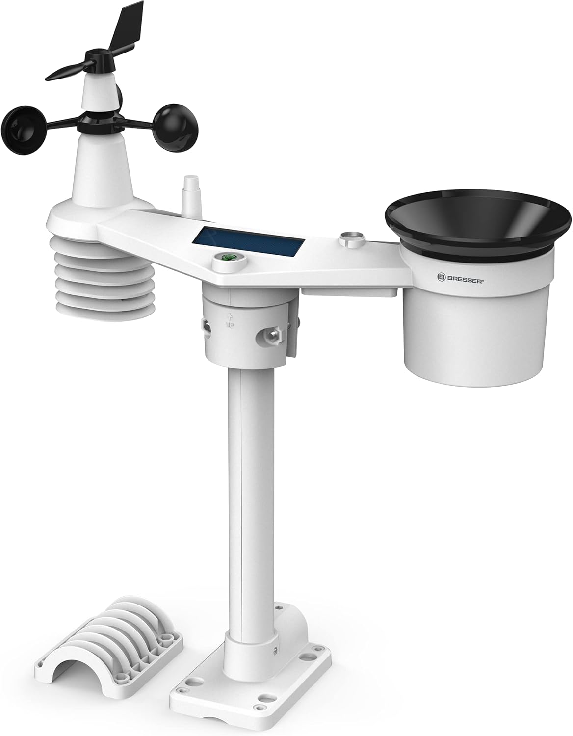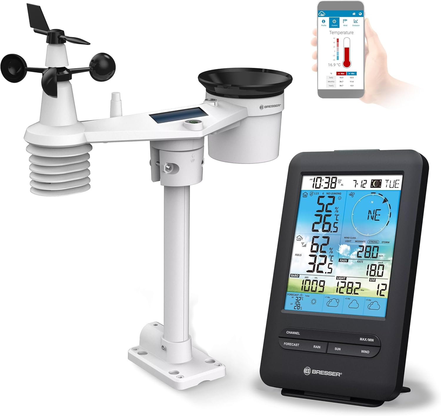 Bresser Wetterstation Funk mit Außensensor 7-in-1 WLAN 4CAST inkl. 4-Tages-Wettervorhersage, Windmesser und Regenmesser sowie UV-Level und Lichtintensität, Schwarz Single لینک آمازون : https://www.amazon.de/dp/B097LYSZNZ?th=1&psc=1 این ایستگاه هواشناسی وایفای، پیشبینی آب و هوای ۴ روزه، شامل پیشبینی ۴ روزه با حداکثر و حداقل دما و احتمال بارندگی، و همچنین زمان آفتابسوختگی و یک ساعت زنگدار با هشدار یخبندان را ارائه میدهد. اندازهگیری دما، رطوبت (داخل و خارج از منزل)، سرعت باد، جهت باد، بارندگی، سطح اشعه ماوراء بنفش، شدت نور و فشار هوا؛ صفحه نمایش رنگی برای نمایش واضح دادهها. وایفای برای انتشار دادههای اندازهگیری آب و هوا در پورتالهای عمومی؛ اطلاعات کاربردی آب و هوا: دمای مشاهده شده، نقطه شبنم، ضریب سرمای باد، شاخص گرما و شاخص بوفورت (مقیاس نیروی باد) دارای نشانگر دمای مطلوب داخل ساختمان و حافظه حداکثر/حداقل مقدار؛ هشدار آب و هوا قابل تنظیم؛ همگامسازی زمان اینترنتی با زمان، تاریخ، روز هفته و فاز ماه؛ برد انتقال چند حسگر: تا ۱۵۰ متر پایه: ۱۱۸ × ۱۸ × ۱۸۷ میلیمتر، وزن: ۲۵۹ گرم؛ حسگر: ۳۹۰ × ۴۶۵ × ۱۷۴ میلیمتر، وزن: ۵۴۵ گرم؛ محدوده تحویل: پایه، حسگر، آداپتور برق؛ باتریهای مورد نیاز: ۳ عدد باتری قلمی، ۱ عدد باتری پشتیبان CR2032 (شامل نمیشود)