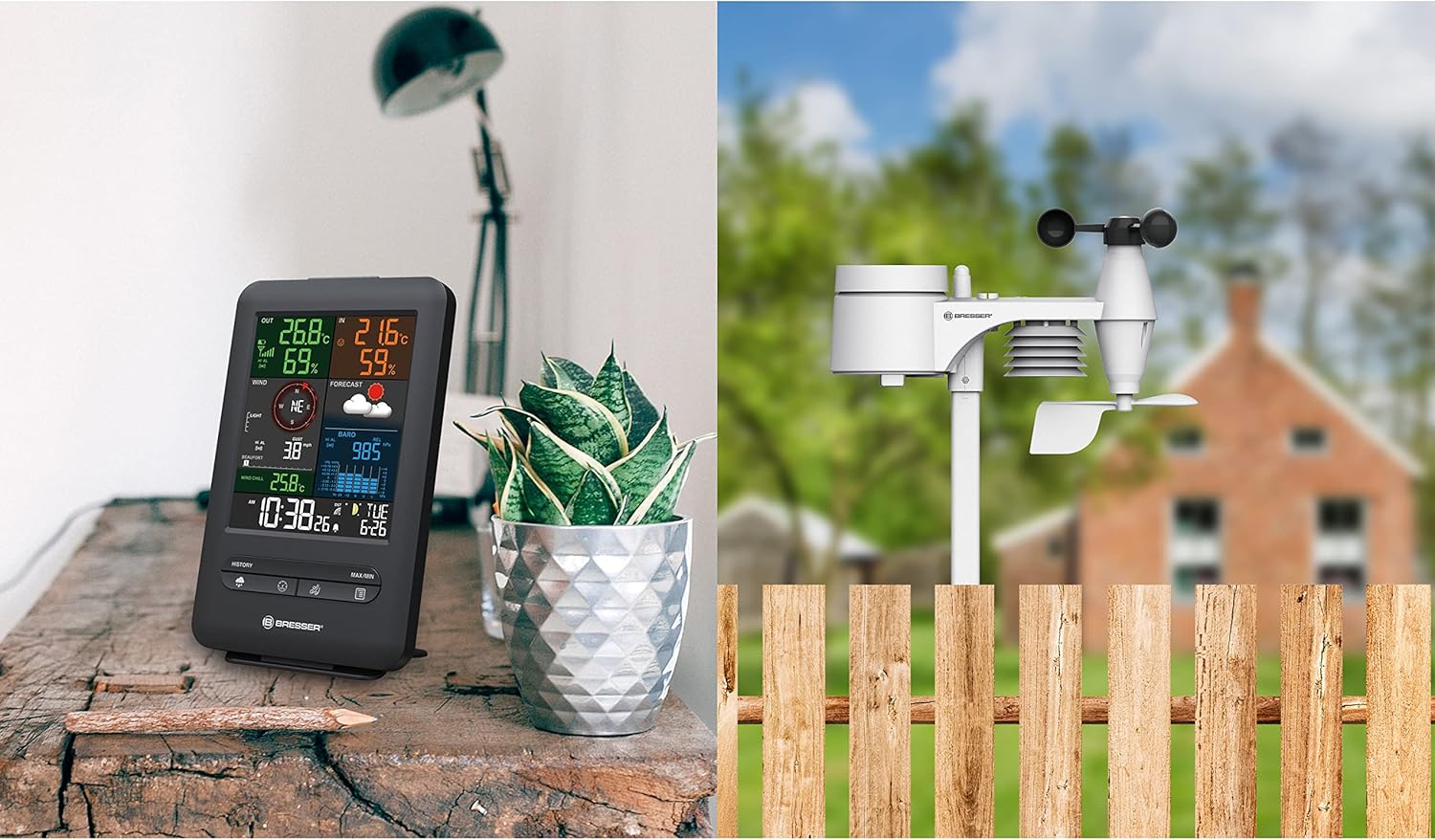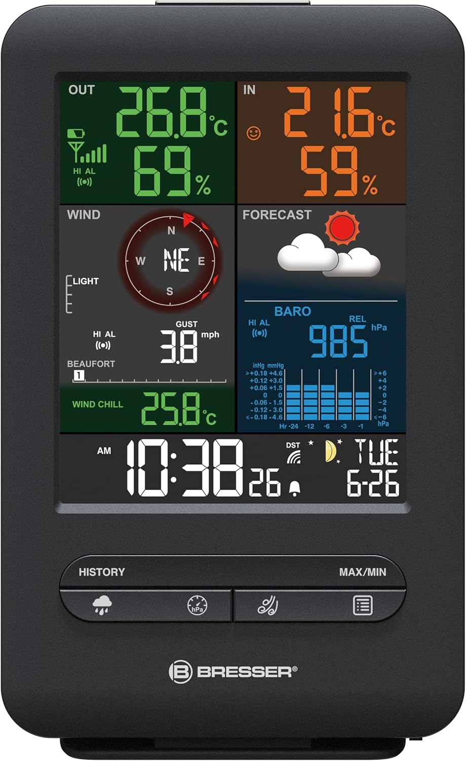 Bresser 7002525 Wetterstation Funk mit Außensensor 5-in-1 Beaufort mit großem Farbdisplay, Sensor für Temperatur, Luftfeuchtigkeit, Luftdruck, Windrichtung und Regenmesser, Schwarz, Einzigartig 5-in-1 Wetterstation, schwarz | قیمت یورویی 129.99€