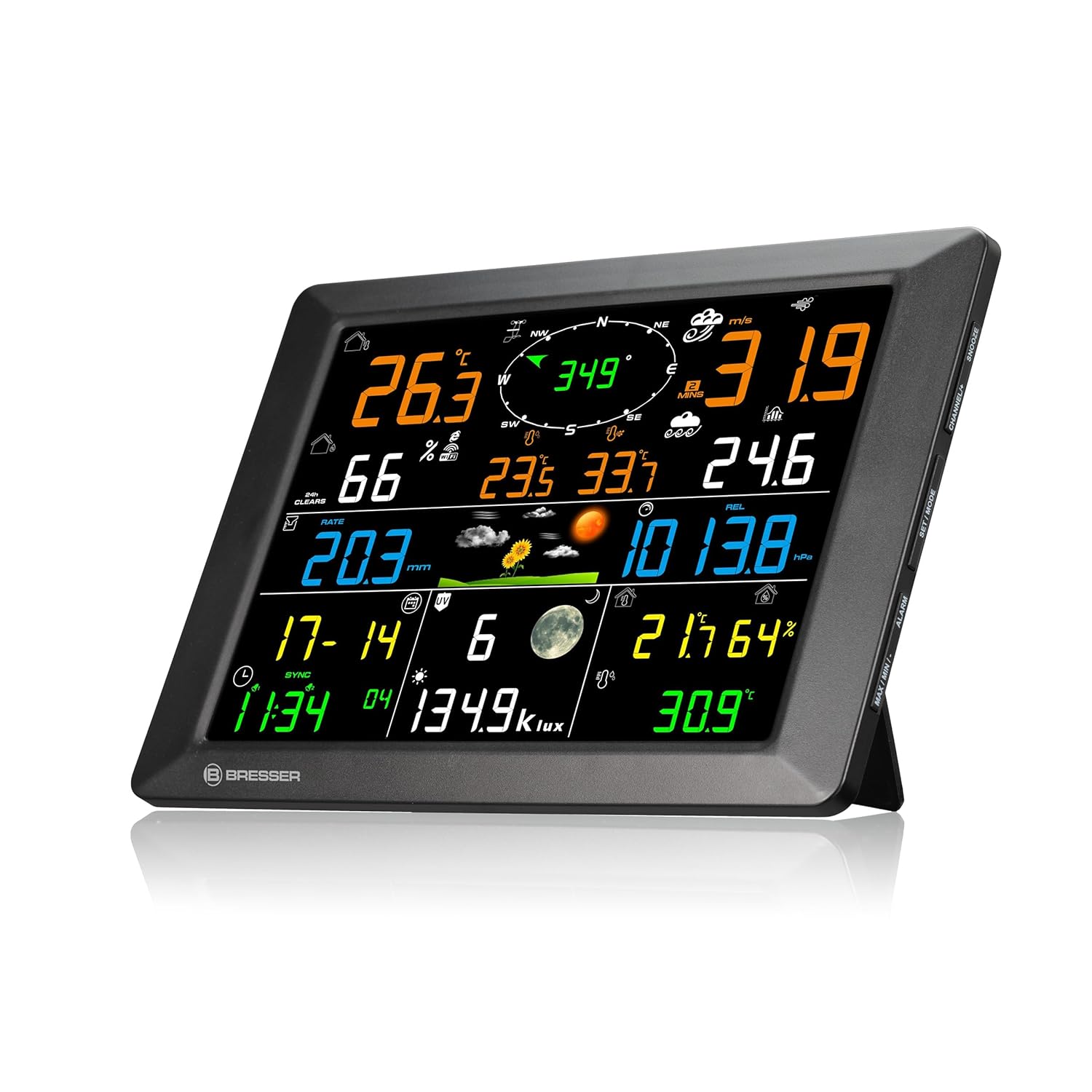 ایستگاه هواشناسی Bresser با برد ۱.۵ کیلومتر، وایفای، حسگر فضای باز ۷ کاره، حسگر خورشیدی، فرابنفش، باد، باران، آپلود وایفای، زنگ هشدار، نمایش آب و هوای داخل و خارج از منزل