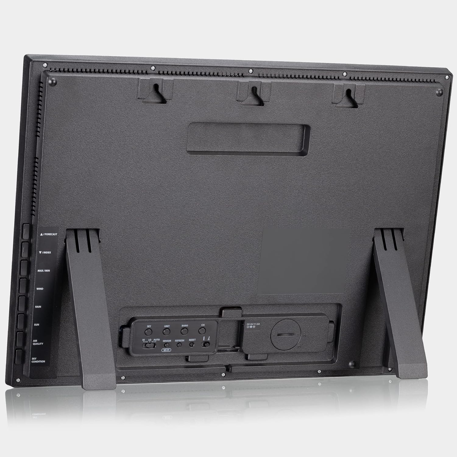 Großartige Aussichten: Mit der Zusatzbasisstation mit extra-großem Farbdisplay holen Sie Ihre lokalen Wetter-Daten sowie Infos zum Raumklima in ein weiteres Zimmer oder einen zusätzlichen Haushalt Umfangreiche Wiedergabe von Wettermessdaten des kompatiblen Multi-Sensors (nicht enthalten): Temperatur, Luftfeuchtigkeit, Niederschlagsmenge, Windgeschwindigkeit/-richtung, UV-Level, Lichtintensität Anzeige von 8-Tage-Wettervorhersage mit Höchst-,Tiefsttemperatur und Regenwahrscheinlichkeit sowie von lokalen Sichtverhältnissen und Bewölkung, WLAN-Verbindung zur Veröffentlichung der Messdaten Integrierter Thermo-Hygrosensor zur Messung von Luftfeuchtigkeit und Temperatur, Luftdruckmessung, Max.-/Min.-Werte-Speicherung, Anzeige Sonnenbrandzeit (Min.), Beaufort-Index, Wetteralarm-Einstellung Funktioniert nur mit kompatiblem Sensor (nicht enthalten); Maße: 419 x 308 x 30 mm; Lieferumfang: Basis, Netzteil; benötigte Batterien: CR2032 Back-up-Batterie (nicht enthalten) | قیمت یورویی : 419.09€