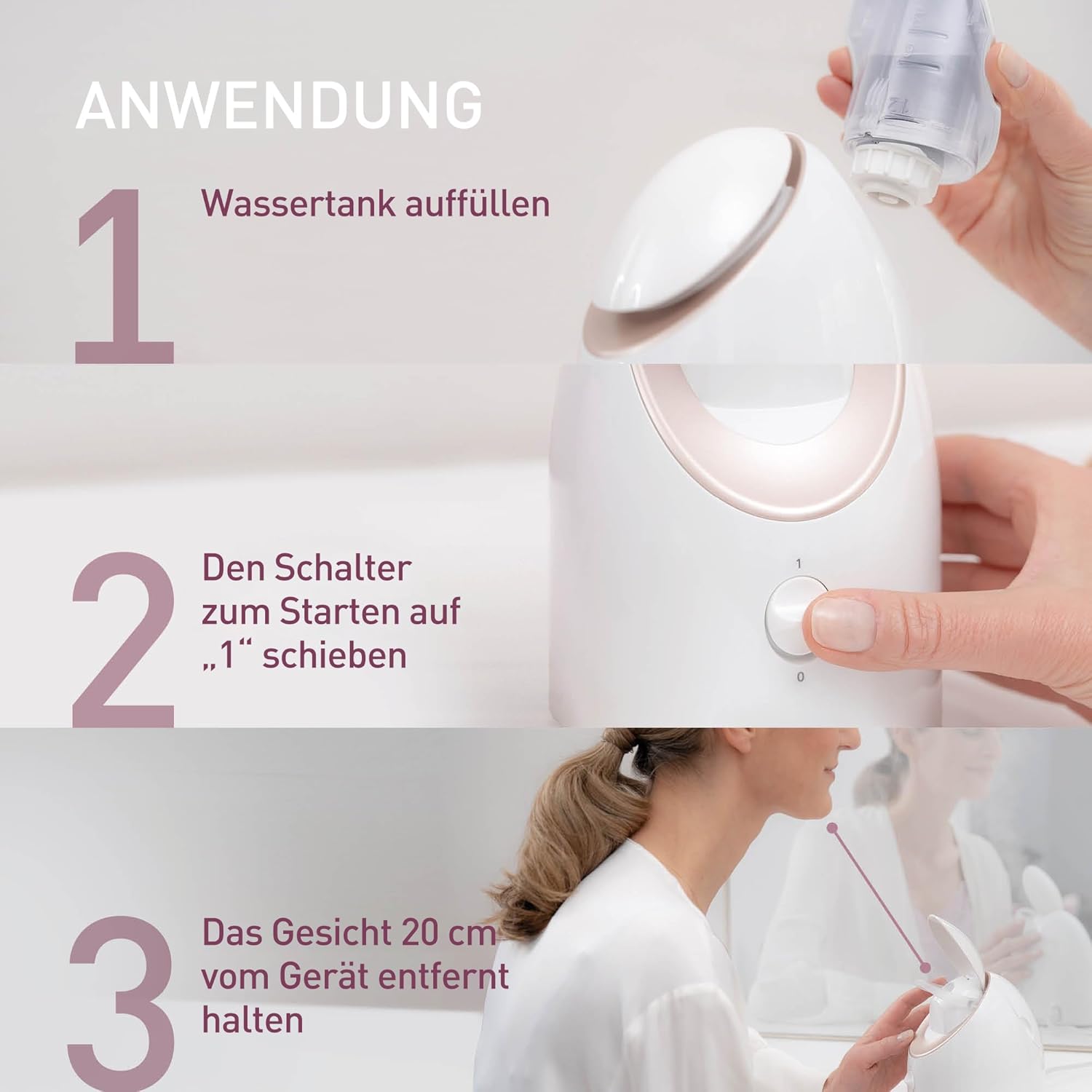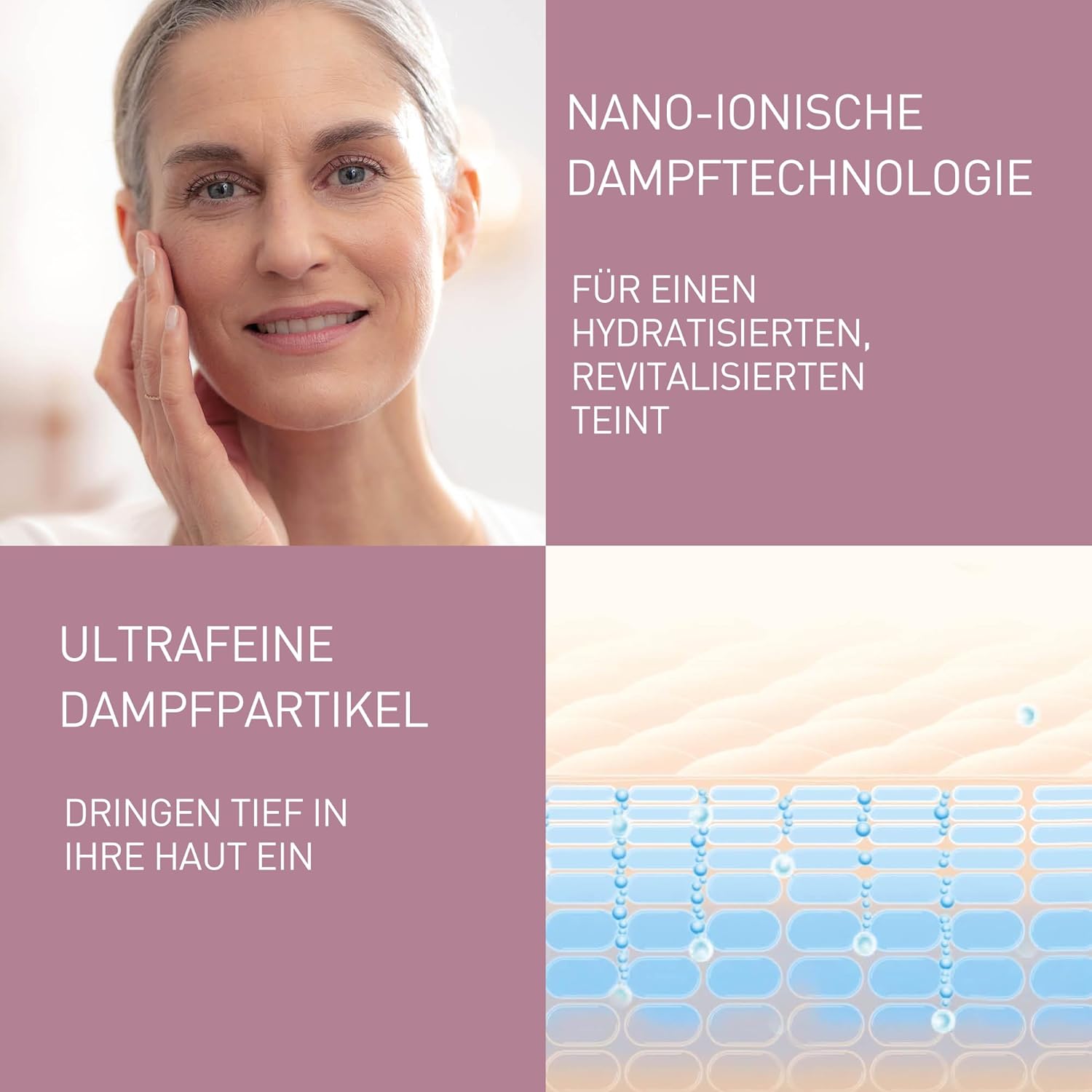 Ionen-Steamer mit Nano-Ionen-Technologie für Gesichtsbehandlungen zu Hause: Durch sanfte und tiefe Reinigung der Poren wird die Haut revitalisiert und mit Feuchtigkeit versorgt. Nano-Ionen Technologie generiert ultrafeine Dampfpartikel, die 18.000mal feiner sind als normale Dampfpartikel. Die Gesichtssauna versorgt die Haut sanft und natürlich mit Feuchtigkeit bis in tiefliegende Hautschichten. Sanfte und gründliche Gesichtsreinigung: Durch die Einwirkung von Dampf vor und während der Reinigung wird die Haut sanft gewärmt und Poren werden geöffnet. So können Reste von Make-Up und Mitesser effektiv entfernt werden. Das Gesichtsreinigungsgerät reduziert das Aufkommen von feinen Linien und Falten, indem die Erzeugung von Kollagen in den Hautschichten stimuliert wird. Wellnessbehandlung zuhause - als optimale Ergänzung zur täglichen Hautpflege. Es wird lediglich destilliertes Wasser benötigt. Dank ihrer kompakten Größe lässt sich die Gesichtssauna optimal im Badezimmer unterbringen. | قیمت یورویی : 159.99€