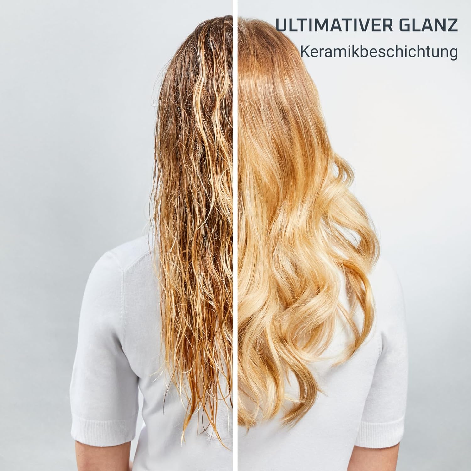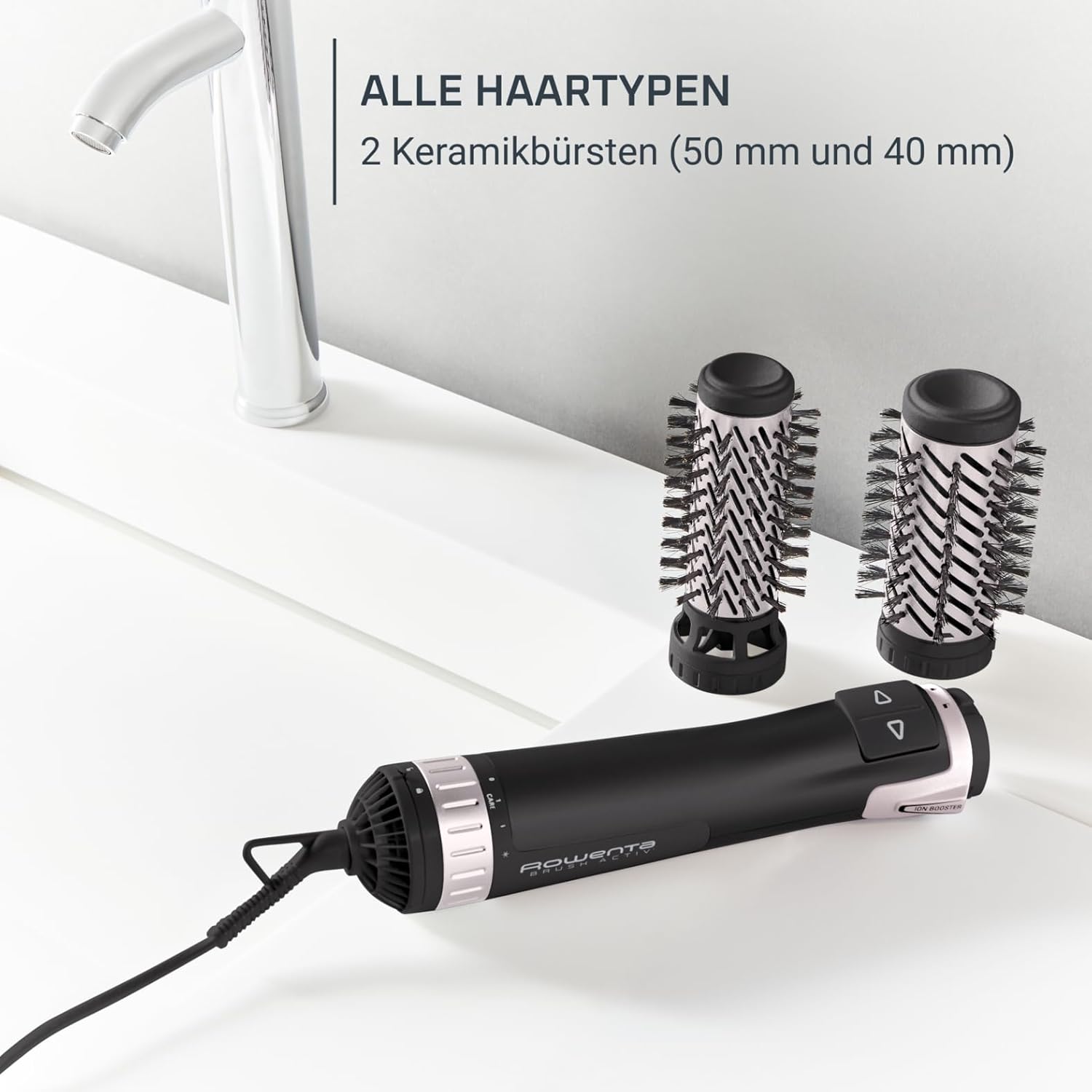 KOMPLETTE STYLING-ROUTINE: Diese automatische, rotierende Warmluftbürste ist mit einer Düse zum Vortrocknen ausgestattet, die professionelle Friseurtechniken ermöglicht und für mehr Volumen in den Haaren sorgt. Sie lässt sich in beide Richtungen drehen und sorgt für ultimativen Komfort beim Vortrocknen und Stylen – für Ergebnisse in Salonqualität zu Hause. Mit Hilfe der Kaltluftfunktion lässt sich das Stylingergebnis langanhaltend fixieren. ULTIMATIVER GLANZ: Die Keramikversiegelung der Stylingbürste sorgt für eine makellose Gleitfähigkeit auf den Haaren, während die doppelten Ionen-Booster eine statische Aufladung und Frizz reduzieren. GEEIGNET FÜR ALLE HAARTYPEN: Zwei Keramikbürsten (50 mm und 40 mm) und drei Geschwindigkeits- bzw. Temperatureinstellungen sorgen für ein maßgeschneidertes Vortrocknen der Haare, ob langes, dickes Haar oder mittleres bis kurzes Haar. SCHNELL UND KRAFTVOLL: Der im Griff verbaute 1.000 Watt starke Motor sorgt für ausreichend Hitze, ohne das Haar zu beschädigen und ermöglicht ein schnelles und effizientes Vortrocknen der Haare. MÜHELOSES VERSTAUEN: Im Lieferumfang dieser Warmluftbürste sind zwei Schutzhüllen für die Bürsten enthalten. | قیمت یورویی : 59.4€