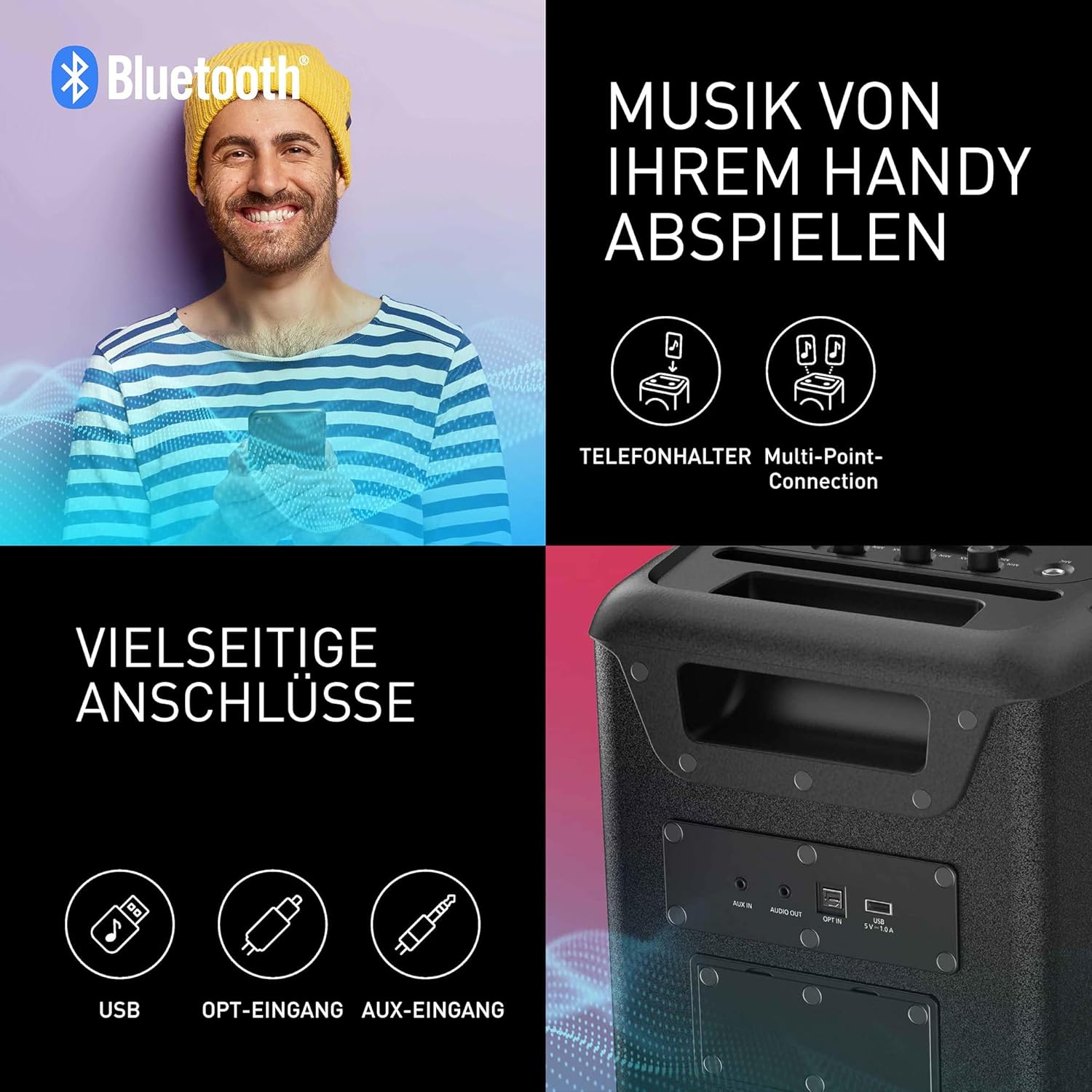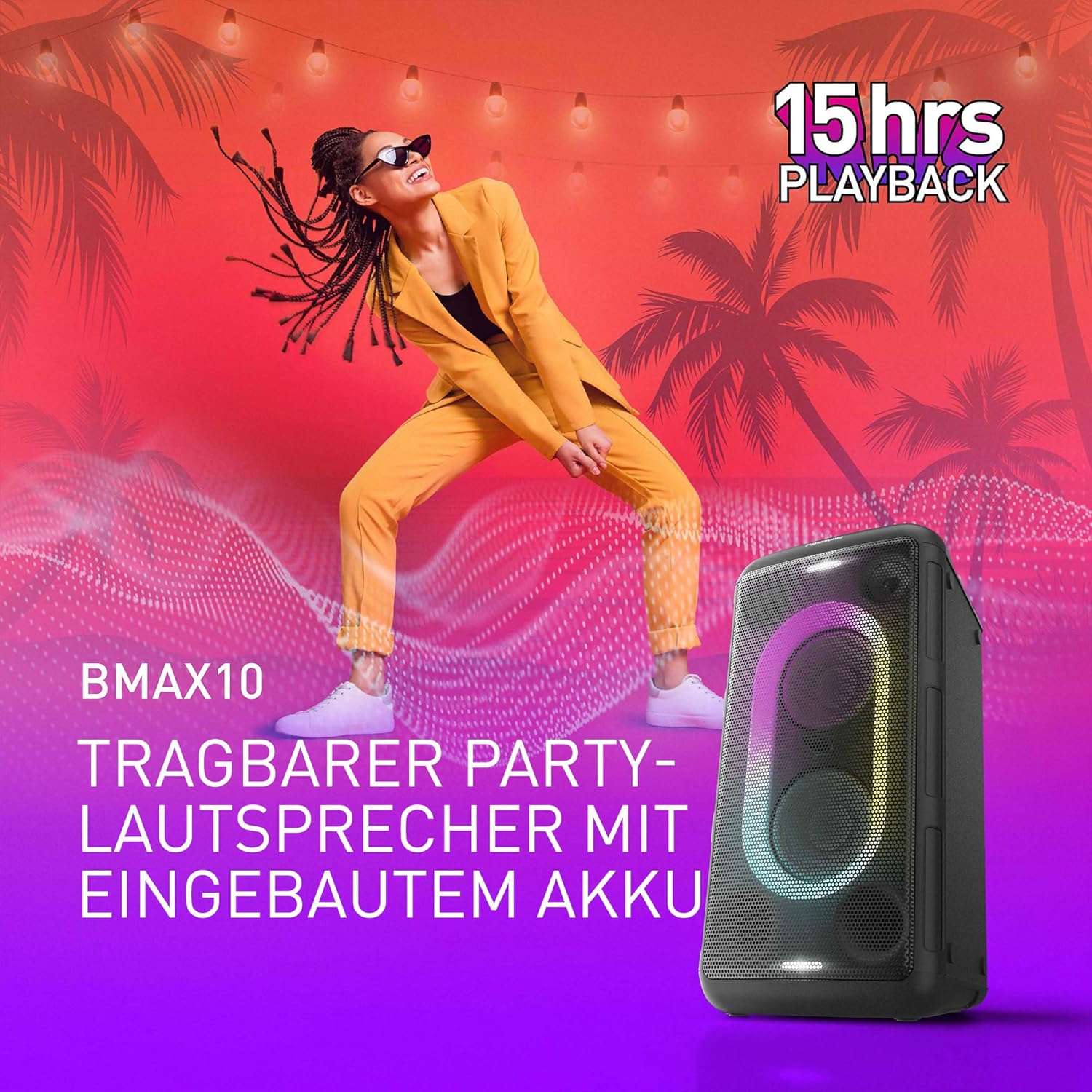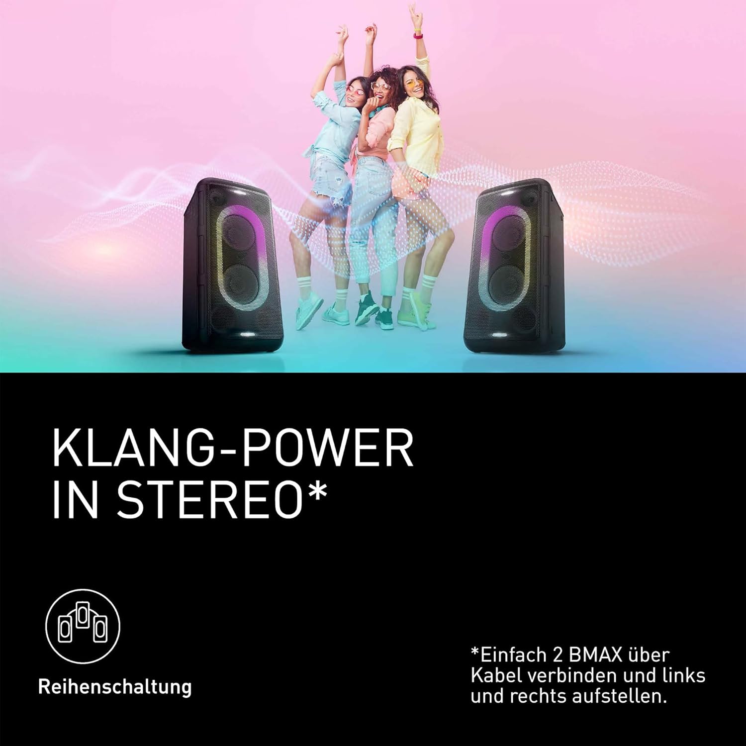 KRAFTVOLLER SOUND: Erleben Sie 150 W reine Audioleistung mit dem 14 cm Doppel-Tieftöner, 2 Hochtönern und 2 Bassreflex-Anschlüssen, für satte Bässe und kristallklare Stimmen TRAGBARER LAUTSPRECHER: Nehmen Sie die Party überall hin mit dank integriertem Tragegriff und dem 15-Stunden-Akku dieses kabellosen HiFi-Lautsprechers, perfekt für Straßentänze, Sport, Fitnessstudio und mehr LEBENDIGE BELEUCHTUNG: Erstellen Sie atemberaubende Lichtshows mit einzigartigen Lichtmustern und Stroboskoplichtern, die sich mit der Musik synchronisieren lassen VIELSEITIGE KONNEKTIVITÄT: Streamen Sie Musik über Bluetooth oder stellen Sie eine Verbindung über USB-A, AUX- und optische Eingänge her, während Gitarren- und Mikrofonbuchsen ideal für Karaoke oder spontane Musikdarbietungen sind TV-VERBINDUNG: Verbessern Sie Ihr Fernseherlebnis, indem Sie diesen Partylautsprecher über das mitgelieferte optische Kabel mit Ihrem Smart-TV verbinden, für Karaoke-Abende, Partys und Gesangswettbewerbe KETTENVERBINDUNG: Erweitern Sie Ihr Audio-Setup und verbessern Sie Ihren Sound, indem Sie mehrere BMAX-Lautsprecher über das 3,5 mm Mini-Jack-Audiokabel verbinden, ideal für größere Räume und Veranstaltungen | قیمت یورویی : 218.41€