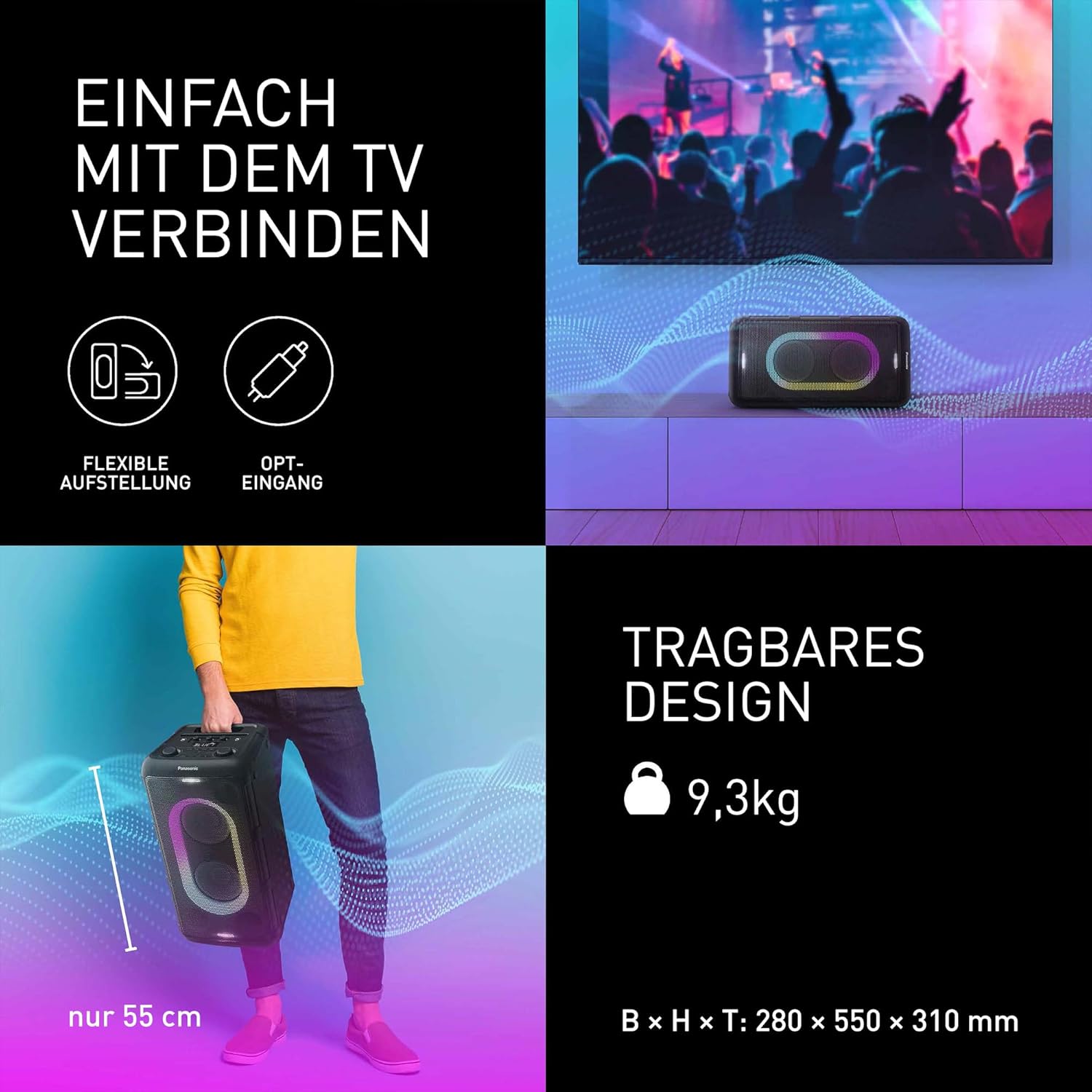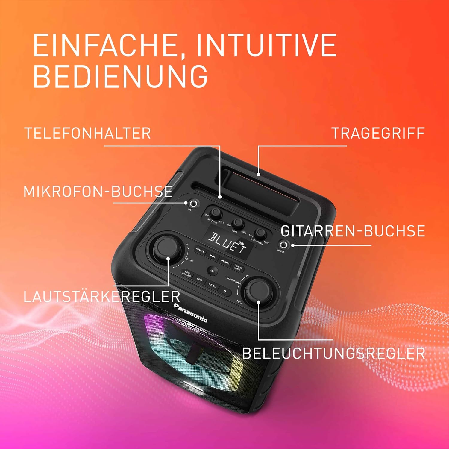 Panasonic SC-BMAX10E-K Tragbarer Party-Lautsprecher mit Bluetooth, integrierter Beleuchtung, 150 W, USB, optischem Eingang für TV, Gitarren- & Mikrofoneingängen für Karaoke, Schwarz Tragbarer Party-Lautsprecher mit Bluetooth-150 W | قیمت یورویی 218.41€