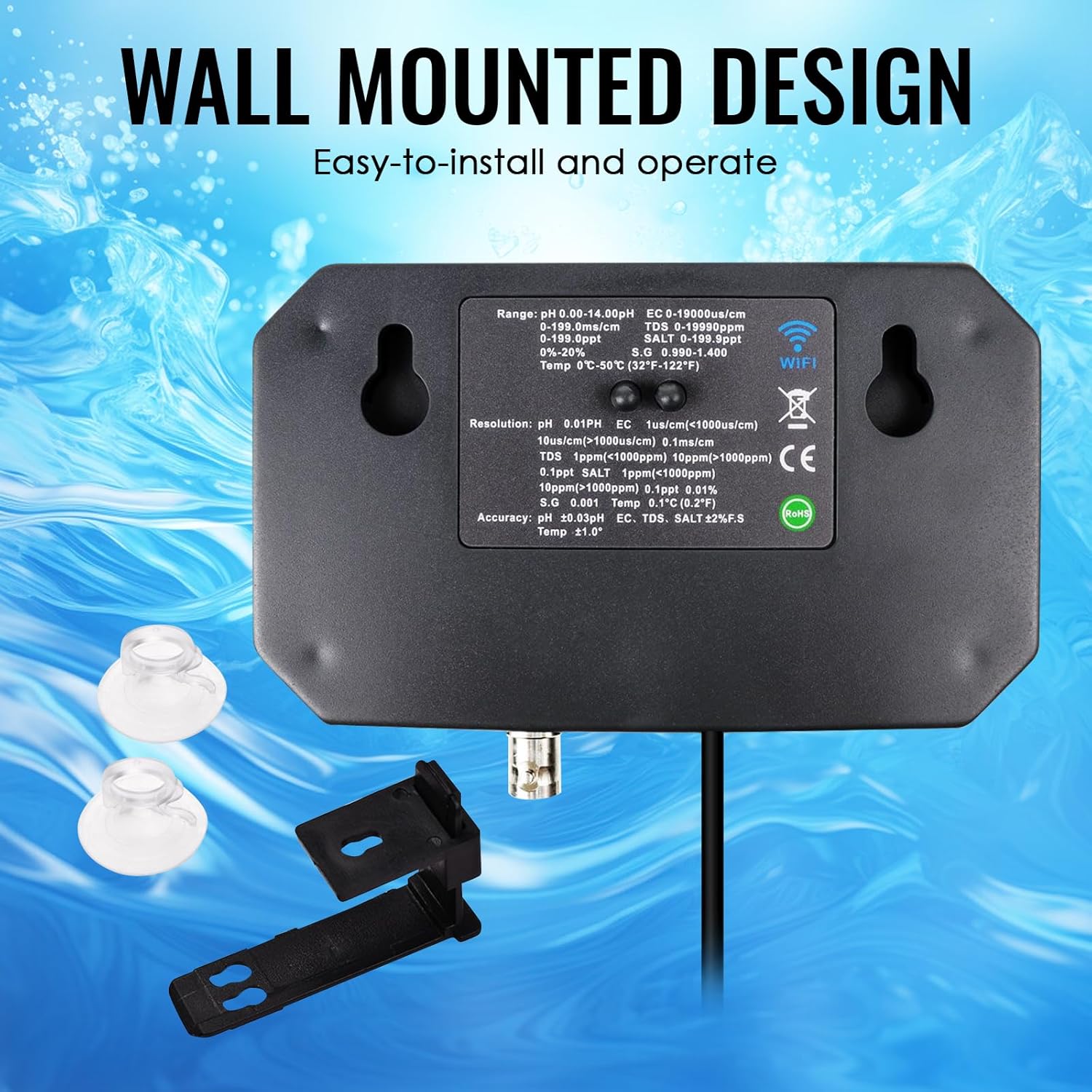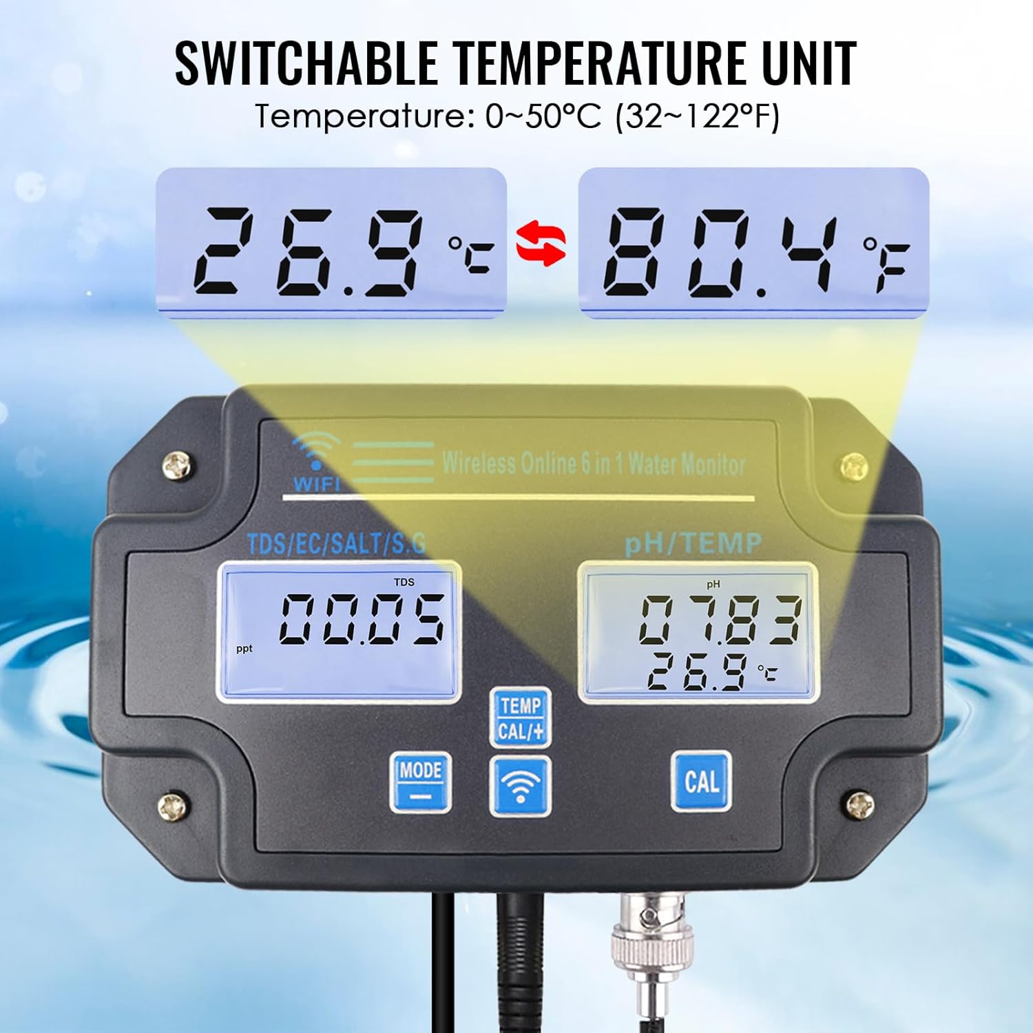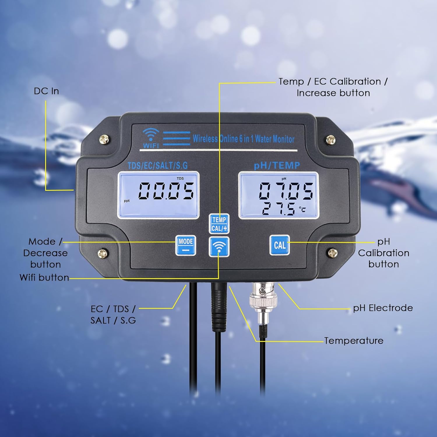 WLAN-Wasserqualitätstester, 6-in-1-pH-Monitor, misst pH/EC/TDS/Salzgehalt/spezifisches Gewicht und Temperatur, 24-Stunden-Online-App-Überwachung und Datenkurvenaufzeichnungen, wandmontiertes pH-Meter 6-in-1-ph-messgerät | قیمت یورویی 66.99€