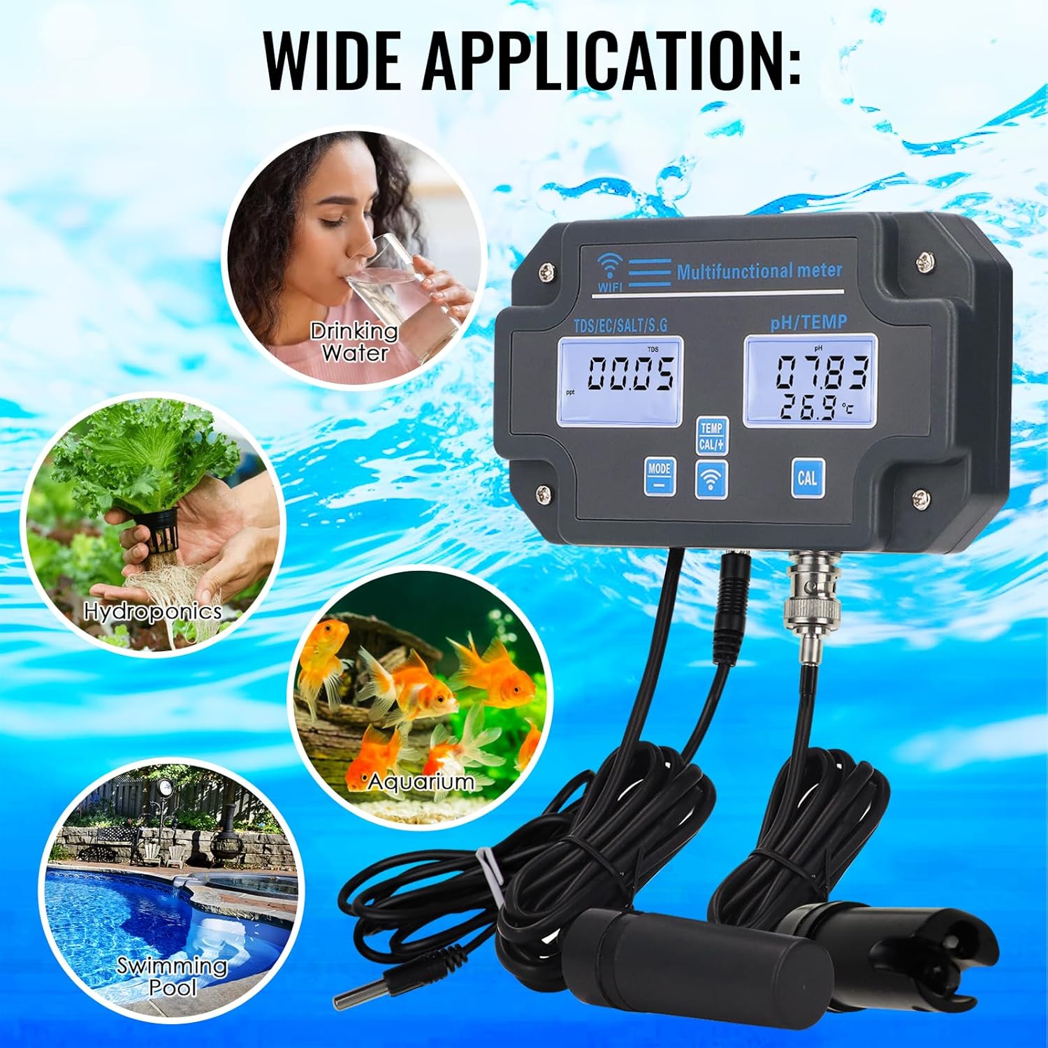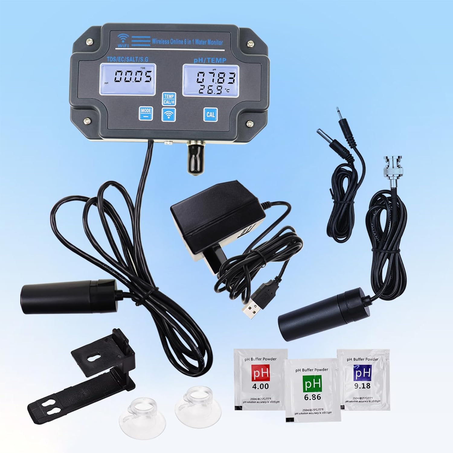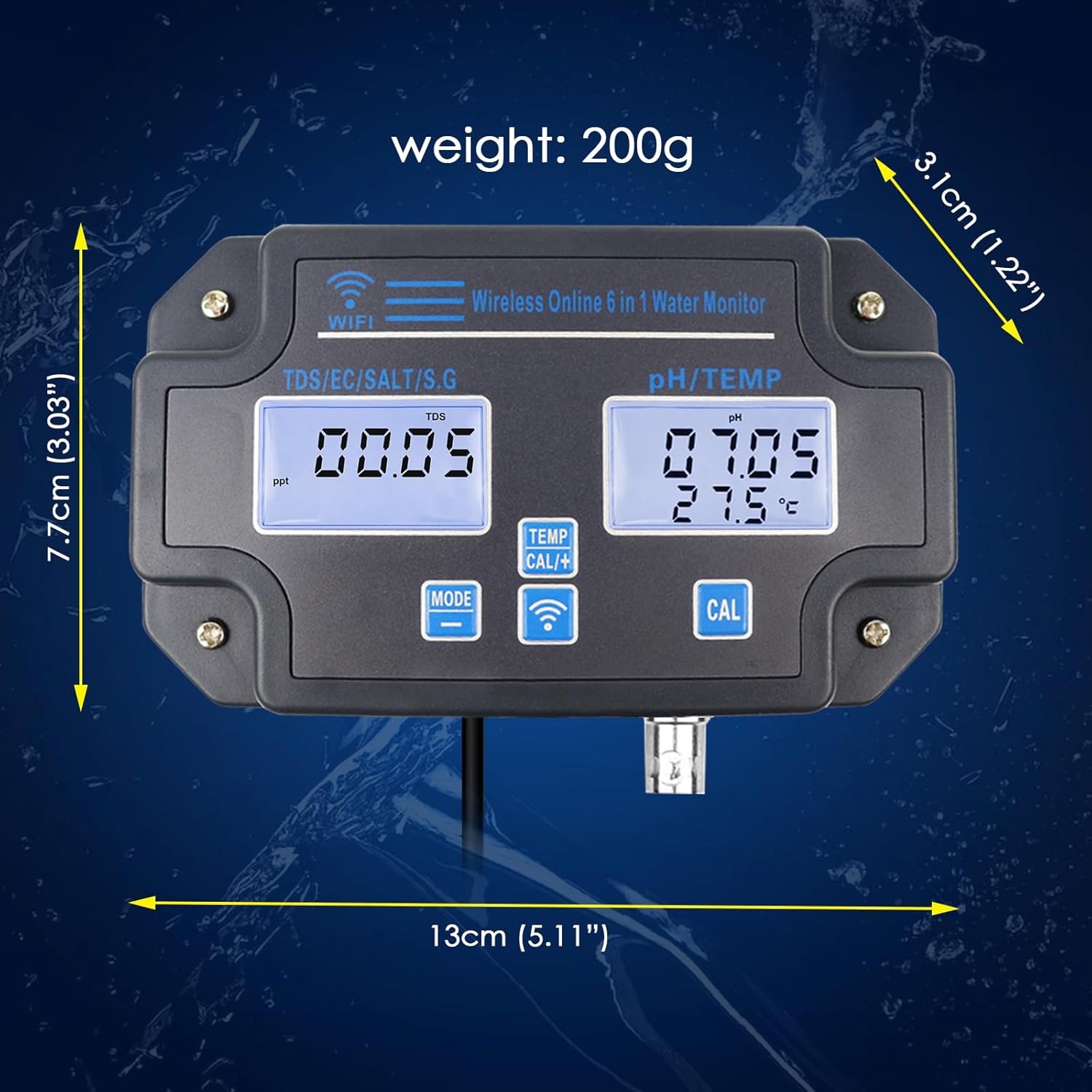 تستر کیفیت آب وای فای، مانیتور pH شش کاره، اندازهگیری pH/EC/TDS/شوری/وزن مخصوص و دما، نظارت آنلاین ۲۴ ساعته از طریق اپلیکیشن و ثبت منحنی دادهها، pH متر دیواری، pH متر شش کاره