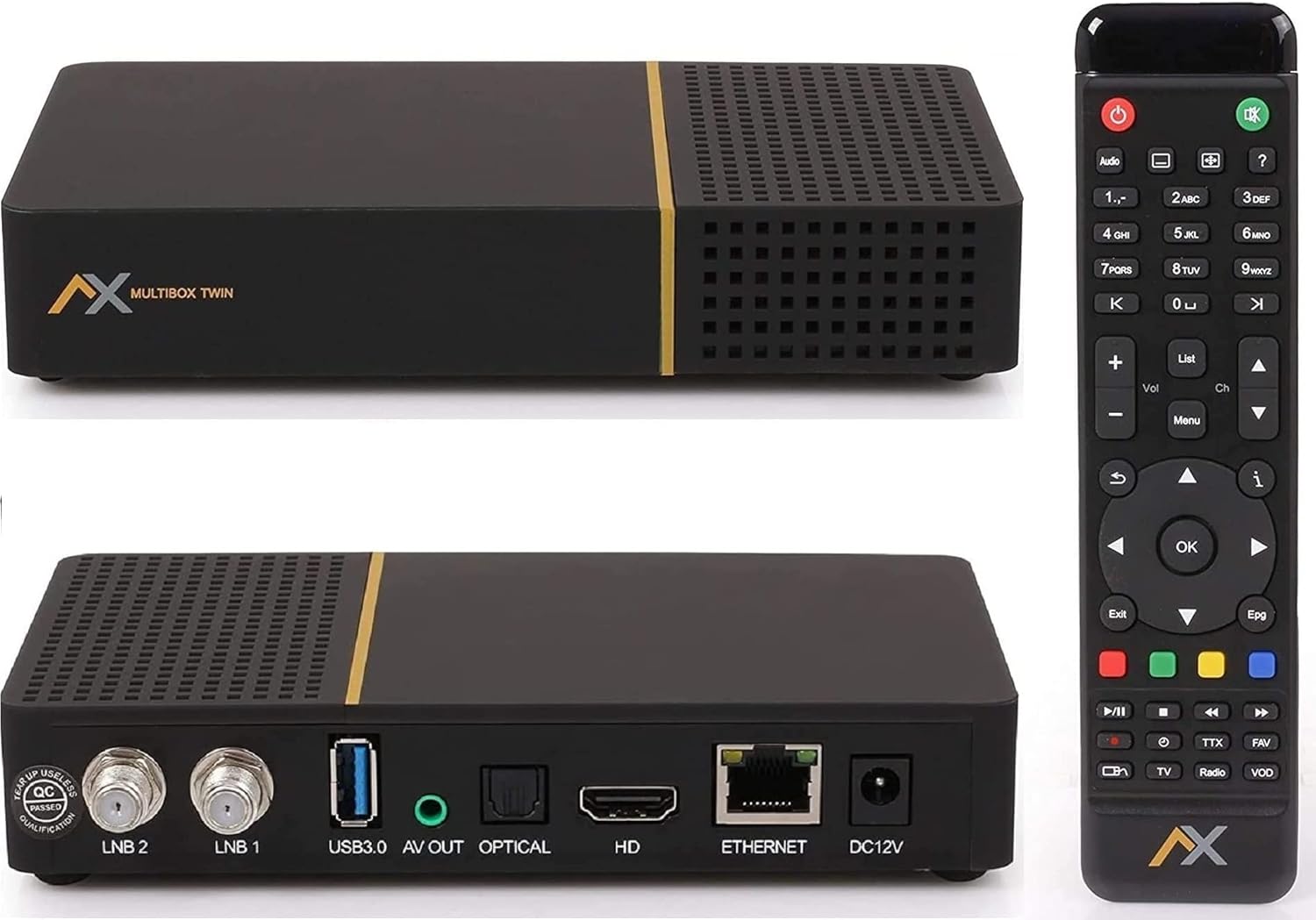 [تست: خیلی خوب *] گیرنده ماهوارهای لینوکس AX Multibox Twin SE (نسخه دوم با وایفای) 4K UHD E2 با قابلیت ضبط PVR، Timeshift، Unicable، USB، LAN، WLAN، HDMI، H.265 HDR، Astra Hotbird Sorted