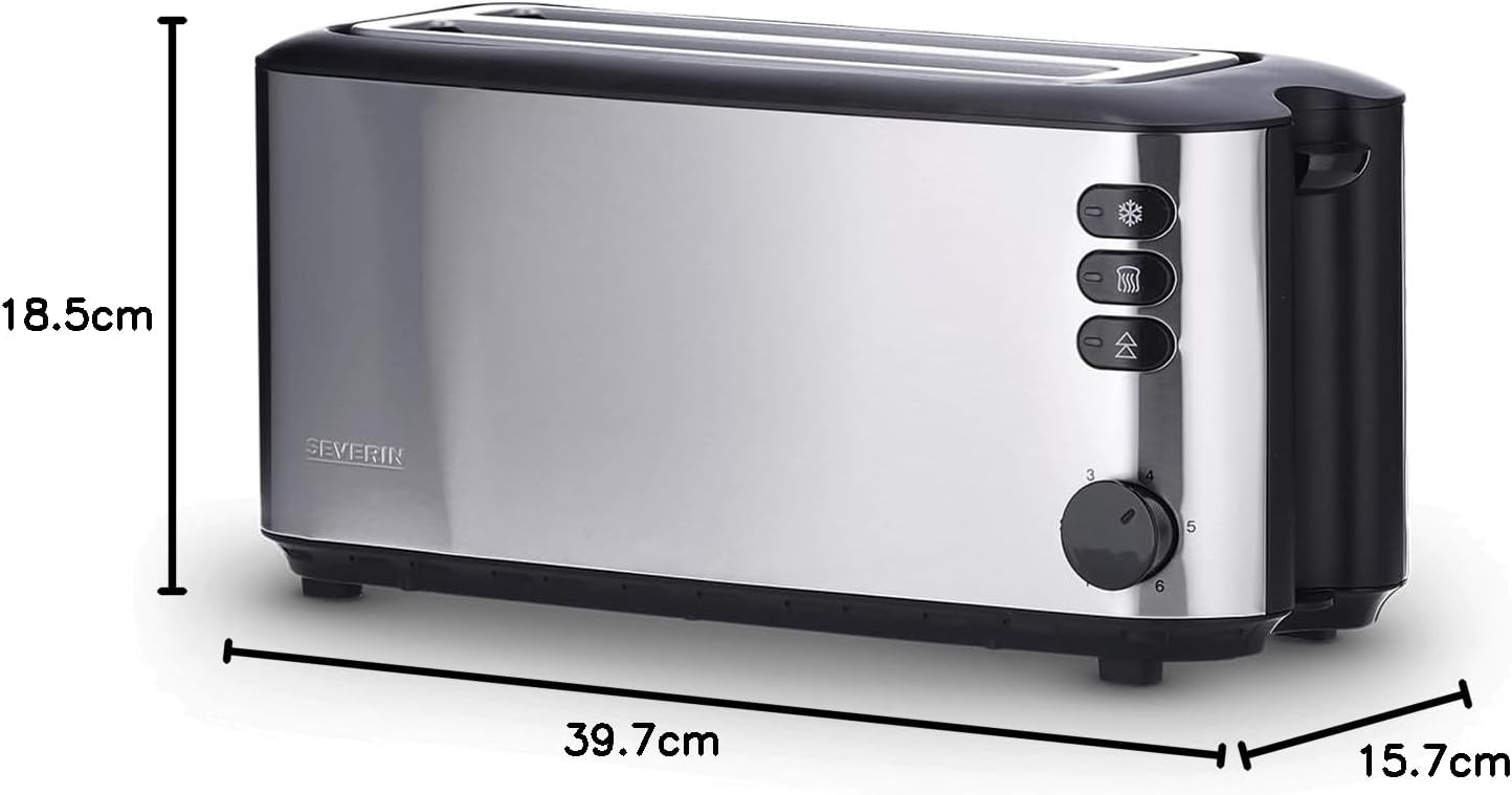 توستر اتوماتیک شیار بلند SEVERIN، توستر با گرمکن نان، توستر استیل ضد زنگ با کیفیت بالا با محفظه‌های بزرگ تست و قدرت ۱۴۰۰ وات، استیل ضد زنگ برس خورده/مشکی، محفظه استیل ضد زنگ AT 2509