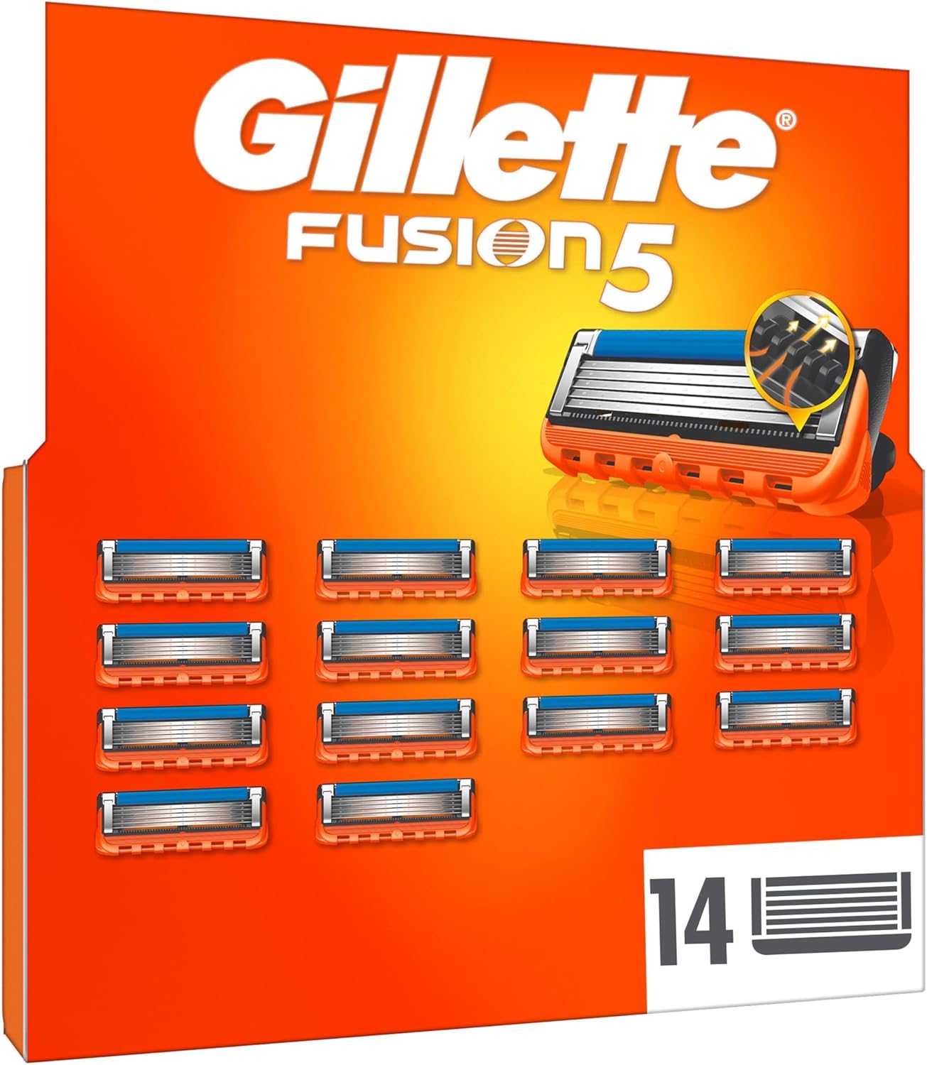 تیغهای ژیلت فیوژن ۵، ۱۴ تیغه جایگزین اصلی برای آقایان با نوار روانکننده بزرگتر برای حرکت روان و ۵ تیغه برای اصلاحی فوقالعاده نزدیک و راحت. ۱۴ تیغه