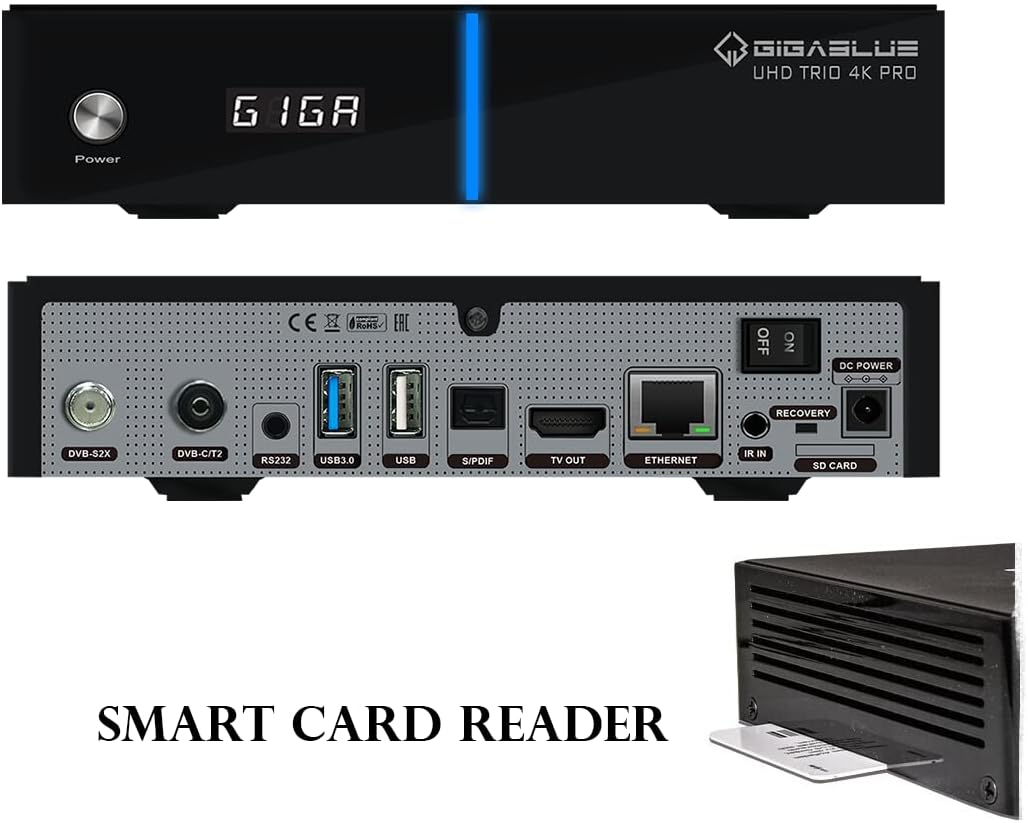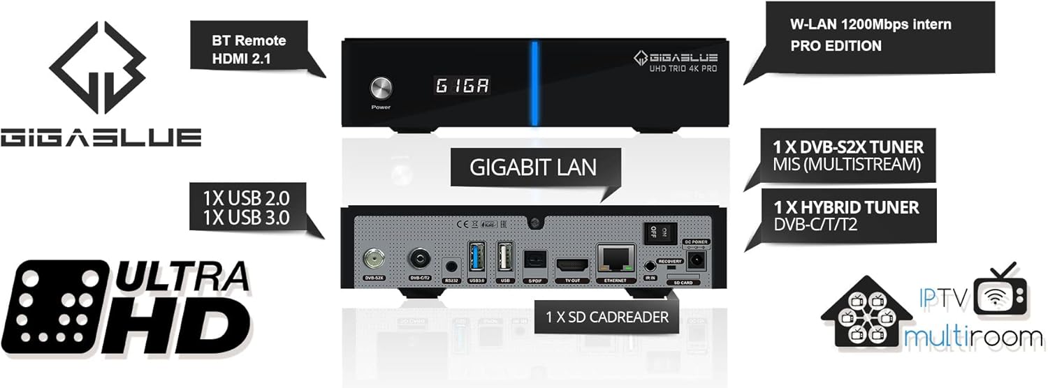 GigaBlue UHD Trio 4K PRO - Combo Tuner, W-LAN 1200Mbps, 1 x DVB-S2X Tuner, 1 x DVB-C/T2 Tuner, schwarz | قیمت یورویی 124€