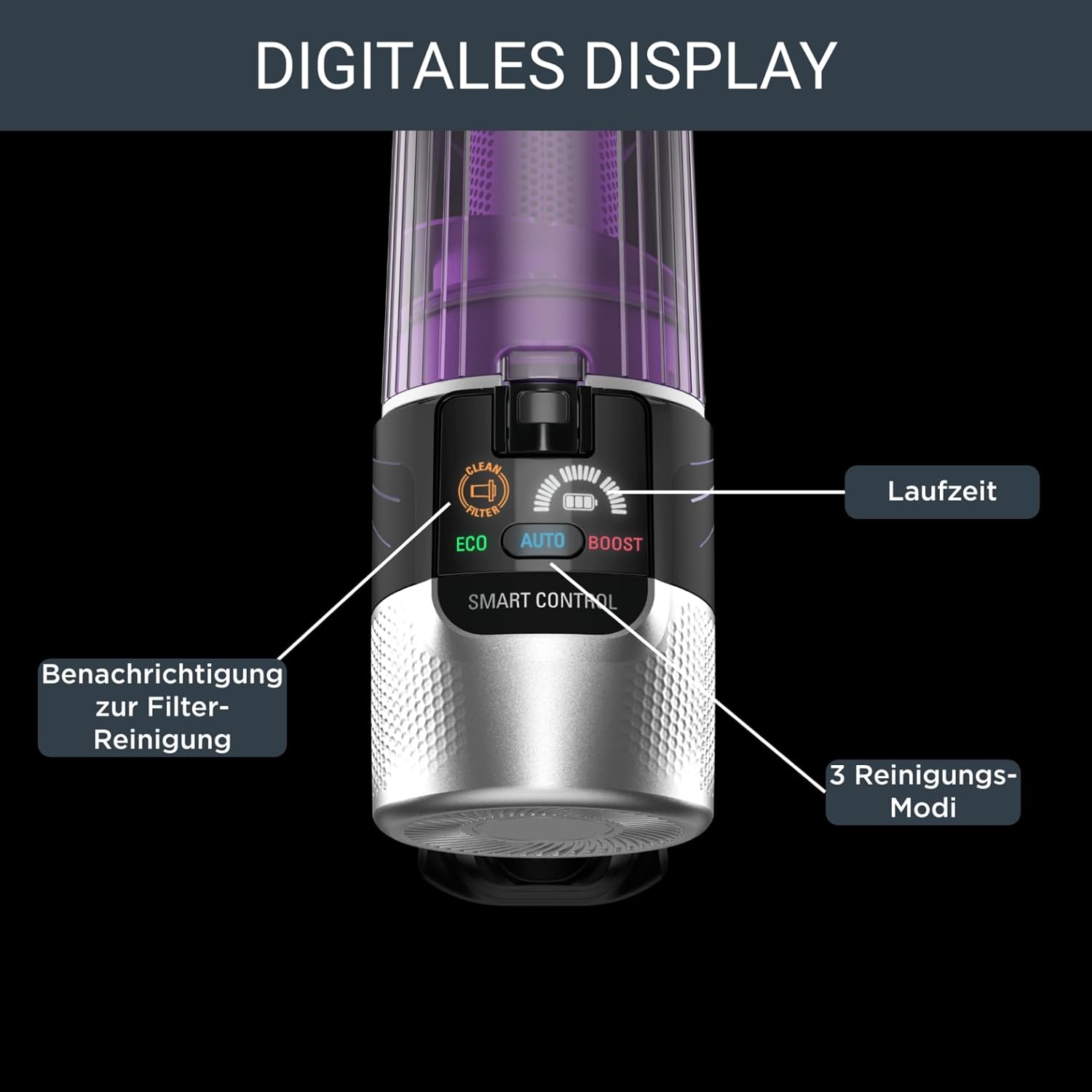 Leistungsstark: Ein Akkustaubsauger mit einer starken konstanten Saugkraft von bis zu 100 Air Watt* für eine langfristig maximale Effizienz (*Bei Nutzung der Boost-Funktion); lange Betriebsdauer: Der herausnehmbare 18,5 V-Akku sorgt für eine Laufzeit für bis zu 45 Minuten**, für eine tiefenwirksame Reinigung mit beeindruckender Autonomie (**bei Nutzung als Handstaubsauger im Eco-Modus) Ultra-leichtes Design: Schlankes und kompaktes Design für ultra-leichtes Reinigen - nur 1,1 kg als Handstaubsauger für den totalen Komfort; Reinigung überall: Durch das Flex-Gelenk reicht der Staubsauger bis tief unter die Möbel für eine vollständige Reinigung, die motorisierte LED-Düse sorgt für die Staubaufnahme in schwach beleuchteten Bereichen Smarte & optimierte Reinigung: Ein kabelloser Staubsauger mit Spitzentechnologie und automatischer Anpasssung der Saugkraft je nach Bodenart; Effizienz in Reichweite: Smart Control Display zeigt die verbleibende Laufzeit und den Alarm zur Filterreinigung an und ermöglicht das Einstellen der Programme Extreme Hygiene und Filterung: Ein erweitertes System, das 99,9% Feinstaub, Allergene und Staubmilben auffängt und für eine lange Luft/Staub-Trennung sorgt; hohes Fassungsvermögen: Der Staubbehälter mit einem hohen Fassungsvermögen für große Reinigungsflächen muss weniger geleert werden, ist leicht zu entnehmen und zu 100% waschbar Lieferumfang: Kabelloser Staubsauger, Ladestation, Fugendüse, Polsterbürste, Ladegerät und Leitfaden für den Schnellstart | قیمت یورویی : 211.72€