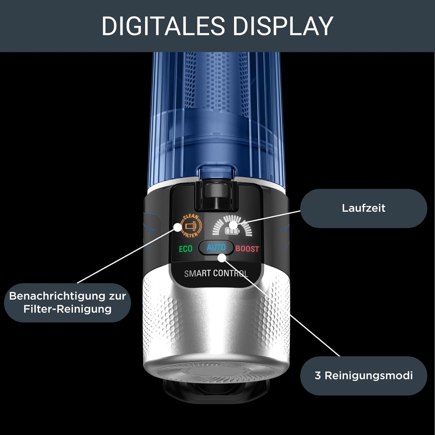 Leistungsstark: Ein Akkustaubsauger mit einer starken konstanten Saugkraft von bis zu 100 Air Watt* für eine langfristig maximale Effizienz (*Bei Nutzung der Boost-Funktion); lange Betriebsdauer: Der herausnehmbare 18 V-Akku sorgt für eine Laufzeit für bis zu 45 Minuten**, für eine tiefenwirksame Reinigung mit beeindruckender Autonomie (**bei Nutzung als Handstaubsauger im Eco-Modus) Ultra-leichtes Design: Schlankes und kompaktes Design für ultra-leichtes Reinigen - nur 1,1 kg als Handstaubsauger für den totalen Komfort; Reinigung überall: Durch das Flex-Gelenk reicht der Staubsauger bis tief unter die Möbel für eine vollständige Reinigung, die motorisierte LED-Düse sorgt für die Staubaufnahme in schwach beleuchteten Bereichen Smarte & optimierte Reinigung: Ein kabelloser Staubsauger mit Spitzentechnologie und automatischer Anpasssung der Saugkraft je nach Bodenart; Effizienz in Reichweite: Smart Control Display zeigt die verbleibende Laufzeit und den Alarm zur Filterreinigung an und ermöglicht das Einstellen der Programme Extreme Hygiene und Filterung: EPA Filter - effizienter Partikelfilter für grobe und feine Verschmutzung (99,9% Filterung); hohes Fassungsvermögen: Der Staubbehälter mit einem hohen Fassungsvermögen für große Reinigungsflächen muss weniger geleert werden, ist leicht zu entnehmen und zu 100% waschbar 2-in-1 Aqua-Technologie: Dank der inkludierten Aqua-Düse können Sie gleichzeitig Wischen und Saugen und erreichen eine hohe Sauberkeit in Ihrem Zuhause; Lieferumfang: Kabelloser Staubsauger, Ladestation, Aqua-Düse, Fugendüse, Polsterbürste, Möbelbürsten, zusätzlicher Filter, Ladegerät und Leitfaden für den Schnellstart | قیمت یورویی : 215.99€