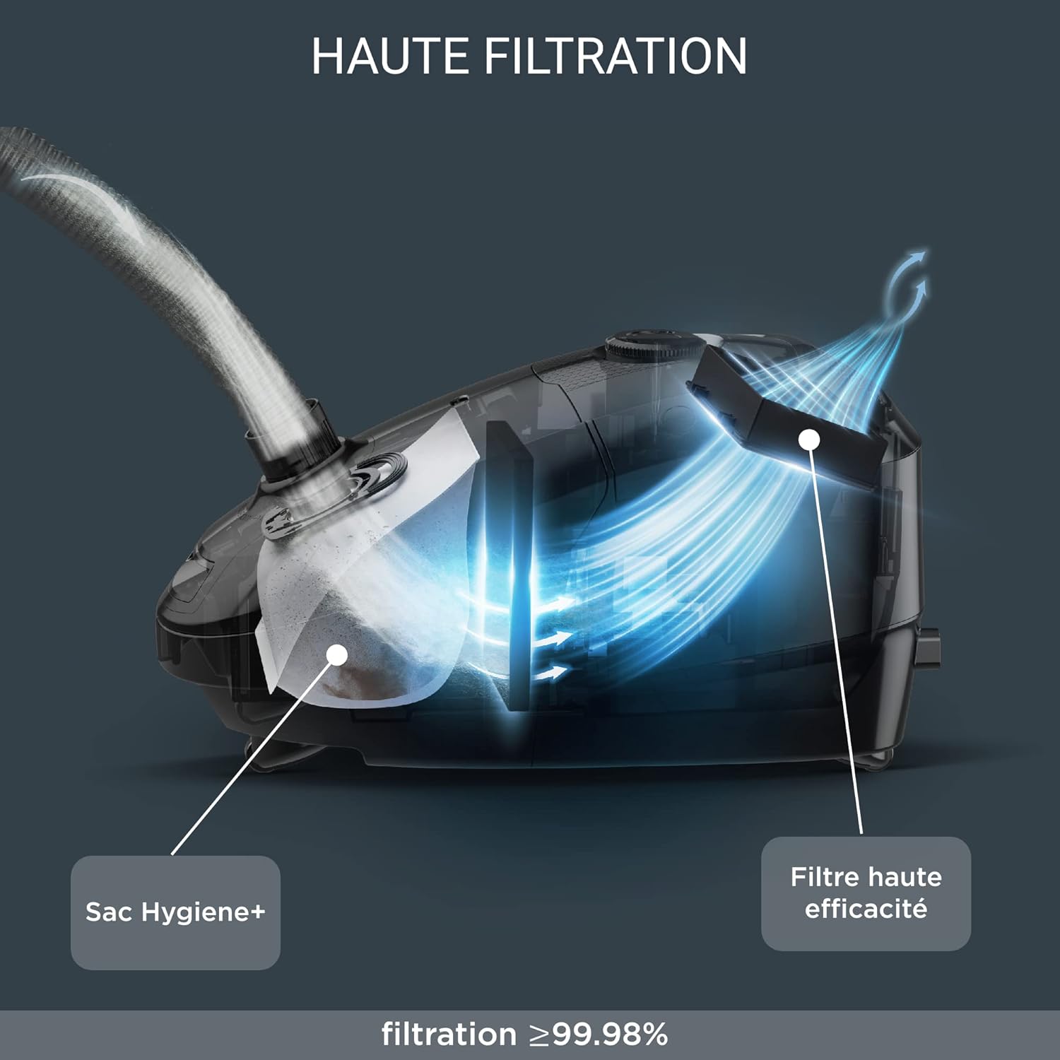 قدرتمند: موتور با حداکثر توان ۹۰۰ وات، تمیز کردن مطمئن انواع کف را بدون مصرف انرژی بیش از حد تضمین می‌کند. فیلتراسیون بالا: فیلتراسیون سه مرحله‌ای بیش از ۹۹.۹۸٪ ذرات گرد و غبار موجود در هوا را جذب می‌کند و محیطی سالم را برای زندگی تضمین می‌کند. پوشش وسیع مساحت: شعاع عملیاتی ۱۲ متر به شما این امکان را می‌دهد که فضاهای بزرگ را بدون نیاز به قطع برق جاروبرقی، جارو کنید. کیسه گرد و غبار XXL: این جاروبرقی کیسه‌ای ظرفیت زیادی برای جمع‌آوری تا ۴.۵ لیتر گرد و غبار دارد و به لطف سیستم تبادل بهداشتی، برای افراد مبتلا به آلرژی نیز مناسب است. لوازم جانبی گسترده: این جاروبرقی کیسه‌ای دارای یک نازل ۲ در ۱ برای تمیز کردن درزها، یک نازل مینی توربو برای جمع کردن موی حیوانات خانگی روی مبل، یک نازل مخصوص پارچه و یک نازل مخصوص پارکت است.