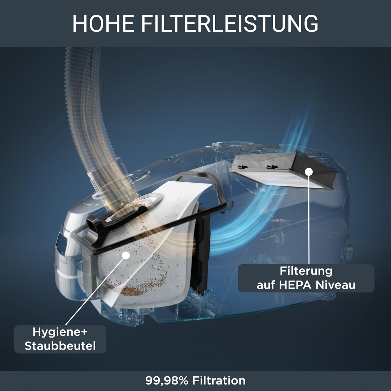 REINIGUNGSKRAFT: Leistungsstarker Staubsauger mit einem Motor von bis zu 900 W max für einen niedrigen Energieverbrauch* und eine sehr gute Saugkraft auf allen Bodenarten (*Gemäß (EU) Nr. 666/2013) LEISE: Besonders leise für angenehmes Reinigen, mit nur 65 dB(A) — ein Geräuschpegel, der leiser ist als ein normales Gespräch UNGLAUBLICHE FILTRIERUNG: HEPA-Filterung (min. 99,98 %) für reine Luftqualität, ideal für Familien und besonders staubempfindliche Personen TADELLOSE HYGIENE: Hygiene+ Beutelwechselsystem vermeidet den Kontakt mit Staub, für totale Hygiene ohne Probleme auch bei Allergien KOMPAKTES DESIGN: Kompaktes und ergonomisches Design für angenehme Anwendung und einfache Aufbewahrung Tadellose Hygiene: Entdecken Sie ein hygienischeres Wechselsystem für Staubbeutel, das jeden Kontakt mit Staub vermeidet, dank des Beutels Hygiene Plus, daher auch für Allergiker geeignet Wattage: 900.0 watts | قیمت یورویی : 153.62€