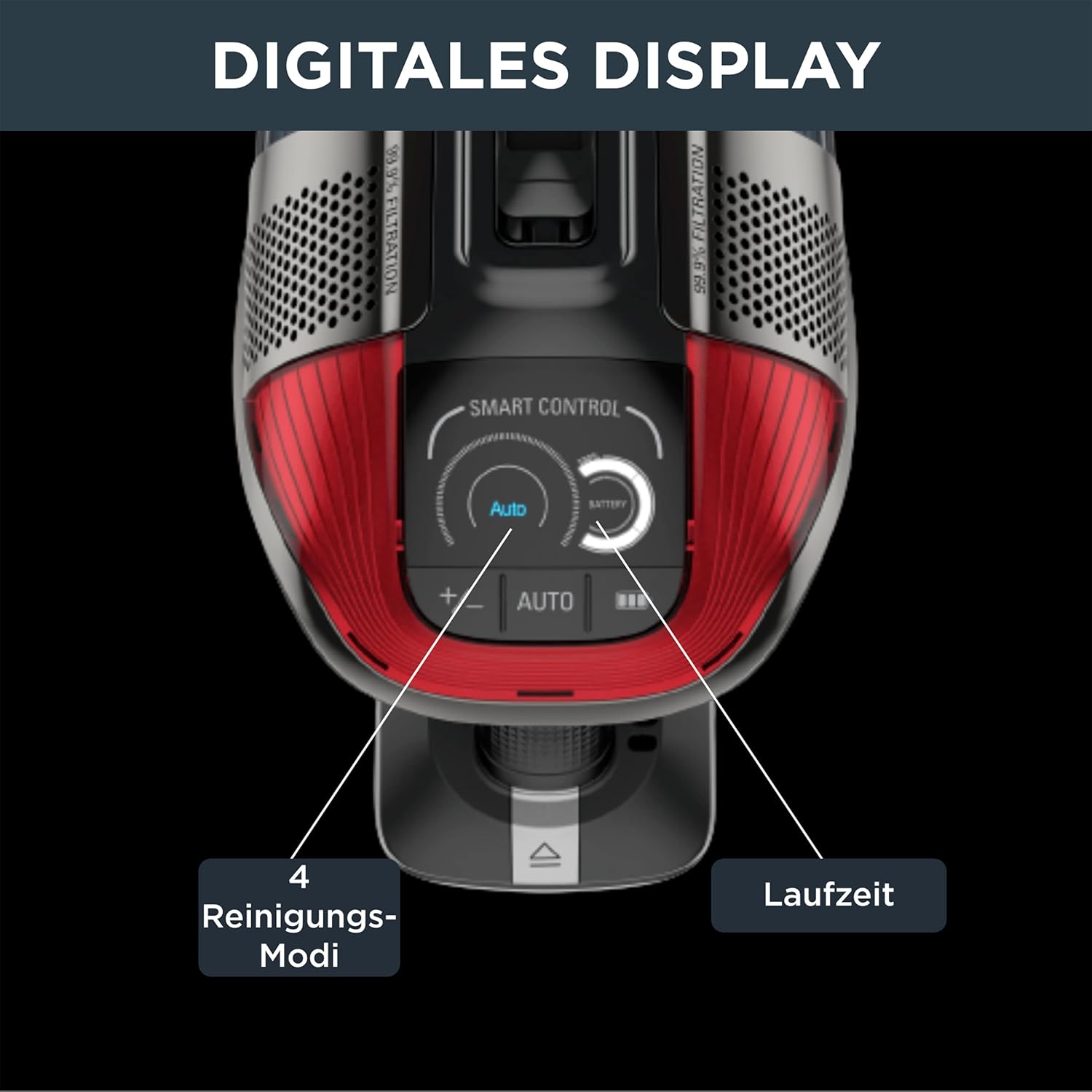 Leistungsstarke Saugkraft: Bis zu 150 Air Watt,* Akkuleistung bis zu 45 Minuten** und 99,9% Filtration von Feinstaub, Allergenen und Staubmilben für eine langanhaltende Luft/Staub-Trennung (*bei Verwendung der Boost-Funktion; **als Handstaubsauger in leistungsstarker Eco-Position) Smarte & optimierte Reinigung: Ein kabelloser Staubsauger mit Spitzentechnologie und automatischer Anpasssung der Saugkraft je nach Bodenart für stets optimierte Reinigungsergebnisse Reinigung überall: Durch das Flex-Gelenk reicht der Staubsauger bis tief unter die Möbel für eine vollständige Reinigung, ohne sich bücken zu müssen, die motorisierte LED-Düse sorgt für die Staubaufnahme in schwach beleuchteten Bereichen Effizienz in Reichweite: Ein Smart Digital Control Display zeigt die verbleibende Laufzeit an und ermöglicht es Ihnen, die Leistung mit 4 verschiedenen Stufen und einem Boost-Auslöser Ihren Anforderungen anzupassen; hohes Fassungsvermögen: Unbeschwerte Reinigungsarbeiten mit dem 0,9 L-Staubbehälter - der sich einfach leeren lässt, mit einer Trennvorrichtung und einem Filter, der zu 100% waschbar ist Tierhaarzubehör: Reinigen überall, wo es nötig ist, nicht nur Böden, um auch in die hinterste Ecke zu gelangen — zusammen mit einer speziellen Animal Turbo-Bürste für die Ansprüche von Haustierbesitzern; Lieferumfang: Kabelloser Staubsauger, Ladestation, einfache Bürste, Filter, Fugendüse, Polsterbürste, Animal Turbo-Bürste, Ladevorrichtung und Schnellstartanleitung | قیمت یورویی : 272.03€
