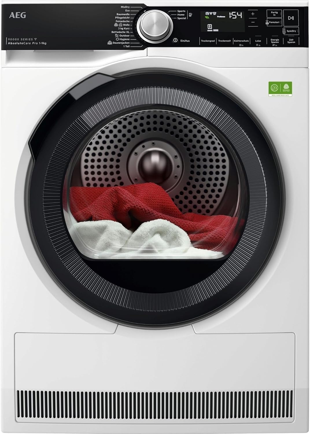 WÄSCHETROCKNER DER SERIE 9000X MIT ABSOLUTECARE Pro - beste Pflege und sparen Zeit und Energie. Der 3DScan-Sensor erkennt die Feuchtigkeit in Textilien und sorgt für eine präzise und vollständige Trocknung SMARTDRY - effiziente vollständige Trocknung. Aktiviere die Zeit- oder Energiespar-Option vor dem Trocknungsvorgang und spare bis zu 50 Minuten oder bis zu 20 % Energie PERSONALISIERTE WÄSCHEPFLEGE MIT DER AEG APP - Ob personalisierte Trockenprogramme, persönliche Pflegetipps oder die smarte Steuerung des Gerätes per Smartphone und Google Assistant – individuell anpassbar KEIN VORSORTIEREN - MixDry trocknet Ihre Kleidungsstücke aus Synthetik und Baumwolle sorgfältig, gleichmäßig und mit der exakt richtigen Temperatur – nicht zu trocken, nicht zu feucht. Ganz ohne Vorsortieren. Die Wärmepumpentechnologie sorgt für das exakte Maß an Temperatur und spart dabei noch Energie SPART ZEIT UND ENERGIE - Die ProSense-Feuchtigkeitssensoren sparen Zeit und bis zu 40% Energie. Sie passen den für das Trocknen benötigten Zeitaufwand und Energieverbrauch an die Wäschemenge an - Die richtige Pflege Ihrer Wäsche bei jedem Trockenvorgang | قیمت یورویی : 1214.99€