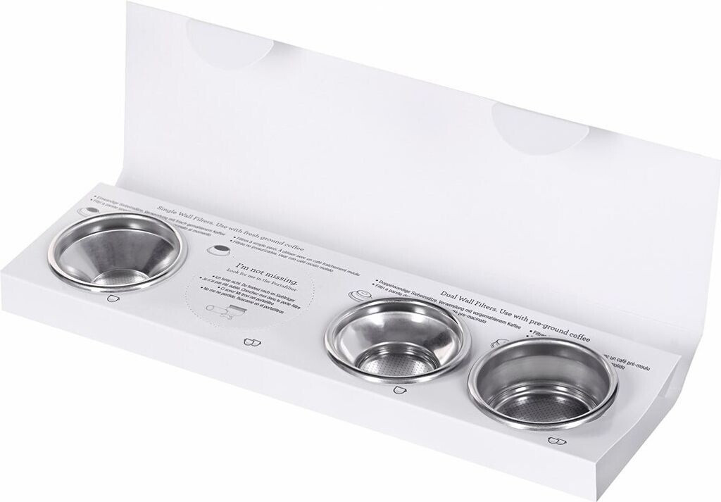 محتویات بسته: دستگاه اسپرسو ساز، آسیاب داخلی بهبود یافته، فیلتر قهوه، دفترچه راهنما، ابزار تمیزکاری