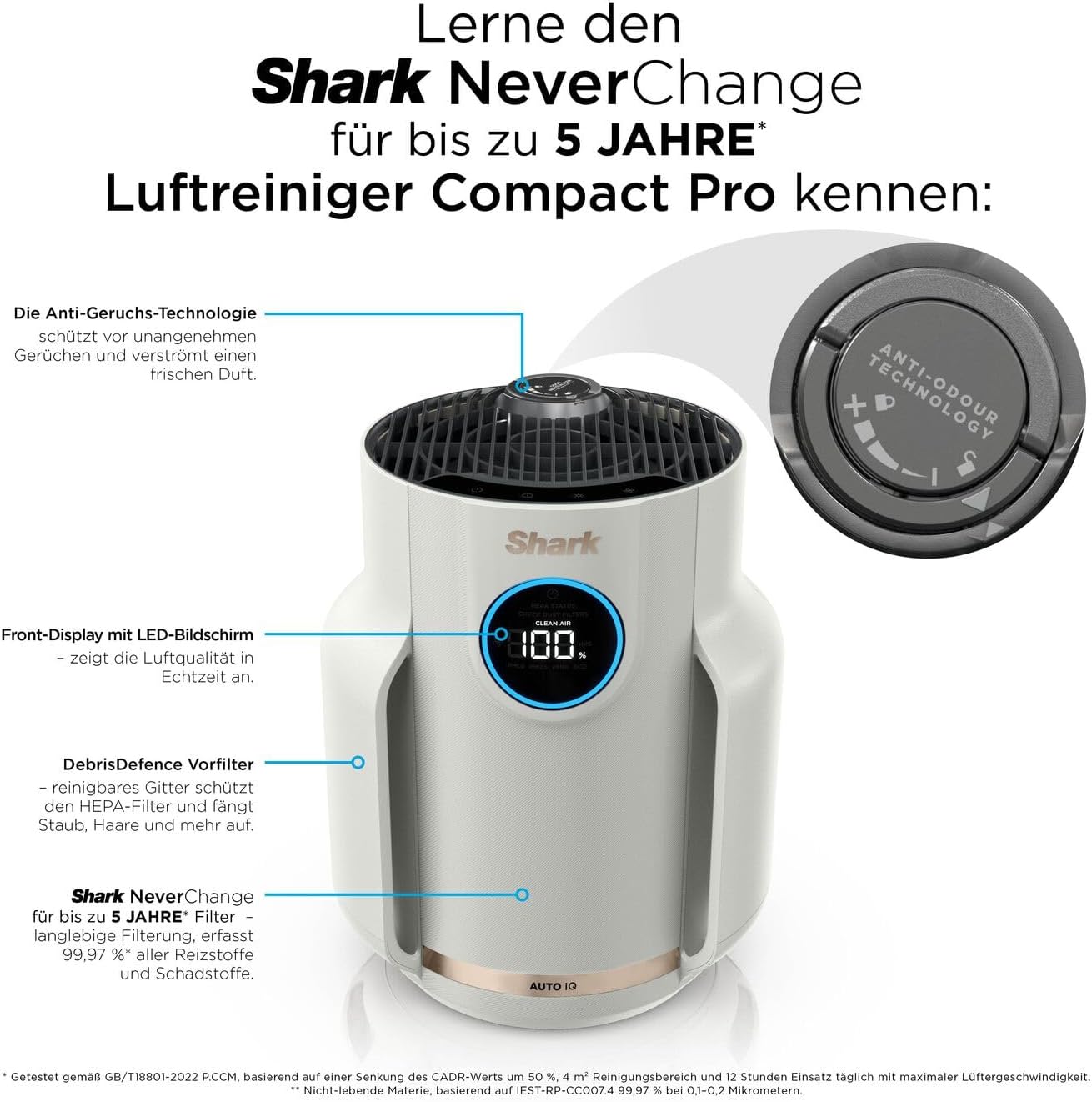 دستگاه تصفیه هوای Shark NeverChange، تا ۵ سال دوام میآورد، برای استفاده خانگی، پوشش اتاق ۲۳ متر مربع، دستگاه تصفیه هوای جمع و جور، فیلتر HEPA، ۹۹.۹۷٪ از آلرژنها مانند گرد و غبار را جذب میکند، عملکرد بیصدا، صفحه نمایش LED، Dove HP072EU برای اتاق ۲۳ متر مربعی