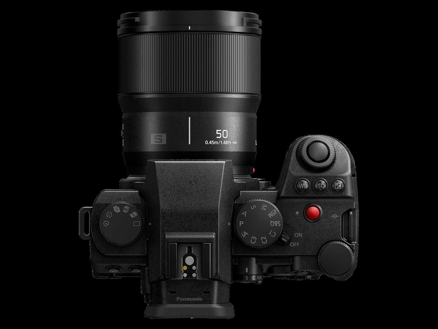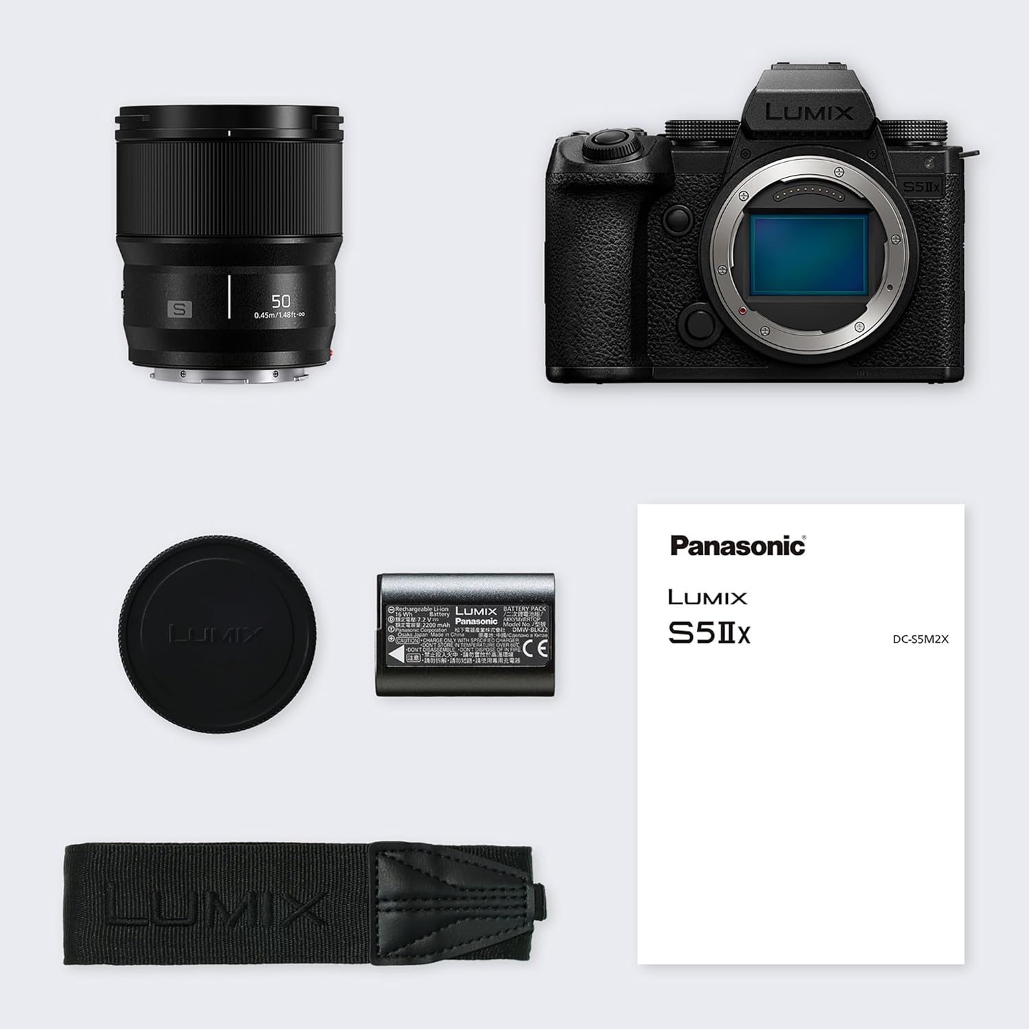دوربین بدون آینه فول فریم پاناسونیک LUMIX DC-S5M2XCE با لنز S 50mm F1.8، فیلمبرداری 4K با سرعت 60 فریم بر ثانیه و 6K با سرعت 30 فریم بر ثانیه با قابلیت ضبط نامحدود، صفحه نمایش چرخان، وای فای، فوکوس خودکار هیبریدی تشخیص فاز، سیستم لرزشگیر فعال، باتری DMW-BLK22، مشکی با لنز LUMIX 50mm