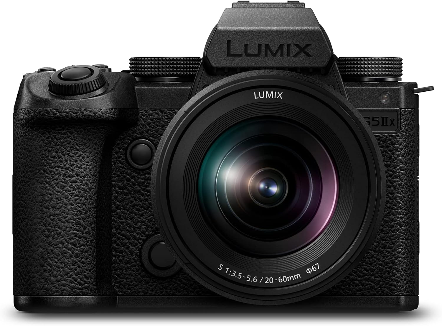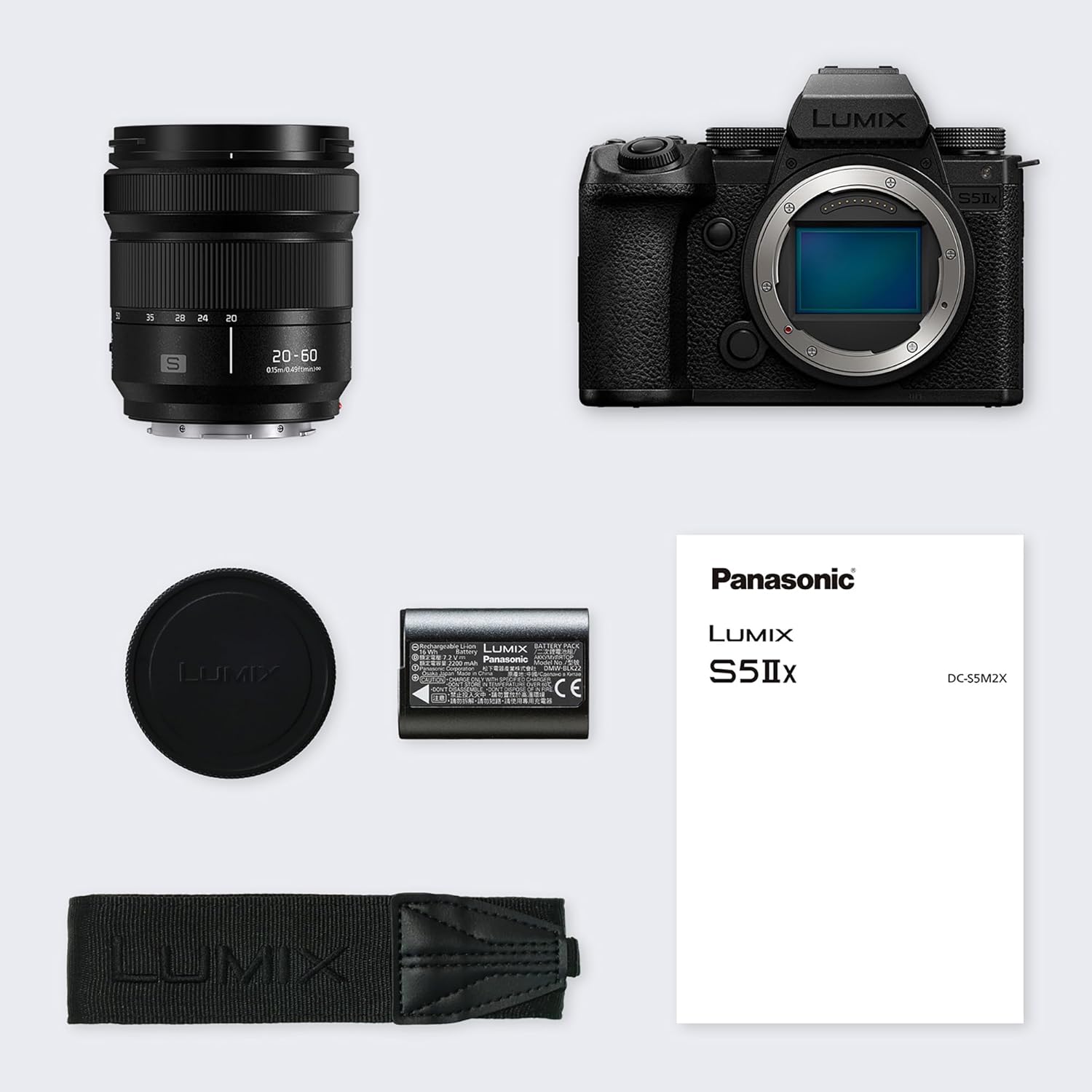 دوربین بدون آینه فول فریم پاناسونیک LUMIX DC-S5M2XKE با لنز LUMIX S-R2060 20-60mm F3.5-5.6، ضبط نامحدود 4K 60p و 6K 30p، صفحه نمایش تاشو، وای فای، فوکوس خودکار تشخیص فاز هیبریدی، باتری DMW-BLK22، مشکی با لنز LUMIX 20-60mm