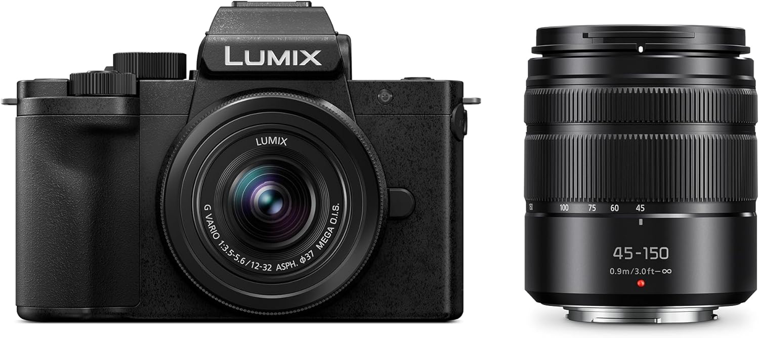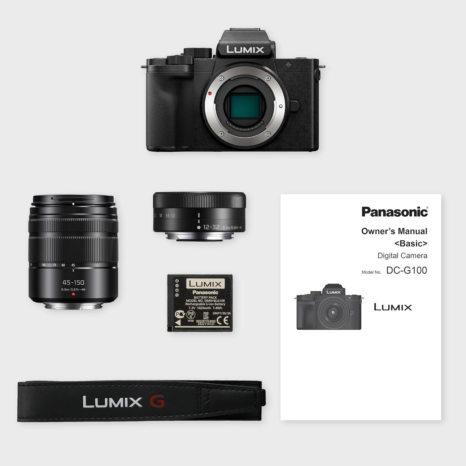 دوربین بدون آینه میکرو چهار سوم پاناسونیک لومیکس DC-G100DWEGK، لنزهای لومیکس G Vario 12-32 میلیمتری F3.5-5.6 و 35-100 میلیمتری F4-5.6، 20.3 مگاپیکسل، فیلمبرداری 4K 30p/FHD 60 فریم بر ثانیه، مانیتور با زاویه دید آزاد، شارژ USB-C، مشکی. لومیکس G100D با لنزهای H-FS12032 و H-FS45150E