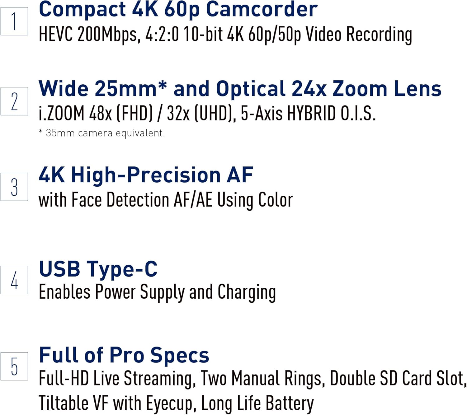 4K/60P HOHE MOBILITÄT: Filmreife 4K/60p-Aufnahmen mit diesem leichten, kompakten Camcorder mit 25mm-Weitwinkelobjektiv, für Dreharbeiten, Events, Sport und Vlogging. 24-FACHER OPTISCHER ZOOM: Starke Nahaufnahmen dieser Vlogging-Kamera dank 24-fachem optischen Zoomobjektiv (25-600 mm) bzw. 48x i.ZOOM für größere Reichweite ohne Qualitätsverlust OPTISCHER BILDSTABILISATOR: Der Camcorder liefert ruhige Aufnahmen dank des 5-Achsen-Hybrid-Bildstabilisators, der Verwacklungen und Rotationsunschärfe erkennt und korrigiert. PRÄZISER AUTOFOKUS: Schnelle und zuverlässige Fokussiergeschwindigkeit dank 4K/AF-Technologie, einschließlich Gesichtserkennung, Fokusassistent und AF-Funktionen auf Knopfdruck. VIELSEITIGE AUFNAHMEN: Nehmen sie hochwertiges Filmmaterial in 4K 60p 4:2:0 10 Bit, 4K 30p 4:2:2 10 Bit oder Zeitlupe in FHD mit 120p auf mit diesem professionellen Camcorder und kontrollieren sie Ihre Aufnahmen mit dem 1,8 MP OLED Sucher oder auf dem 8,8cm (3,5-Zoll) LCD Monitor (2,8 MP). DUAL SD & LANGLEBIGER AKKU: Ununterbrochene Aufnahmen dank doppelten SD-Kartensteckplätzen für Relay-Aufnahmen und einem langlebigen Akku, der für ganztägige Shootings ausgelegt ist. KONNEKTIVITÄT & STREAMING: Stets verbunden dank integriertem WLAN, der USB-PD-Schnellladung und den Live-Streaming-Funktionen (RTMP/RTMPS). | قیمت یورویی : 1479.01€
