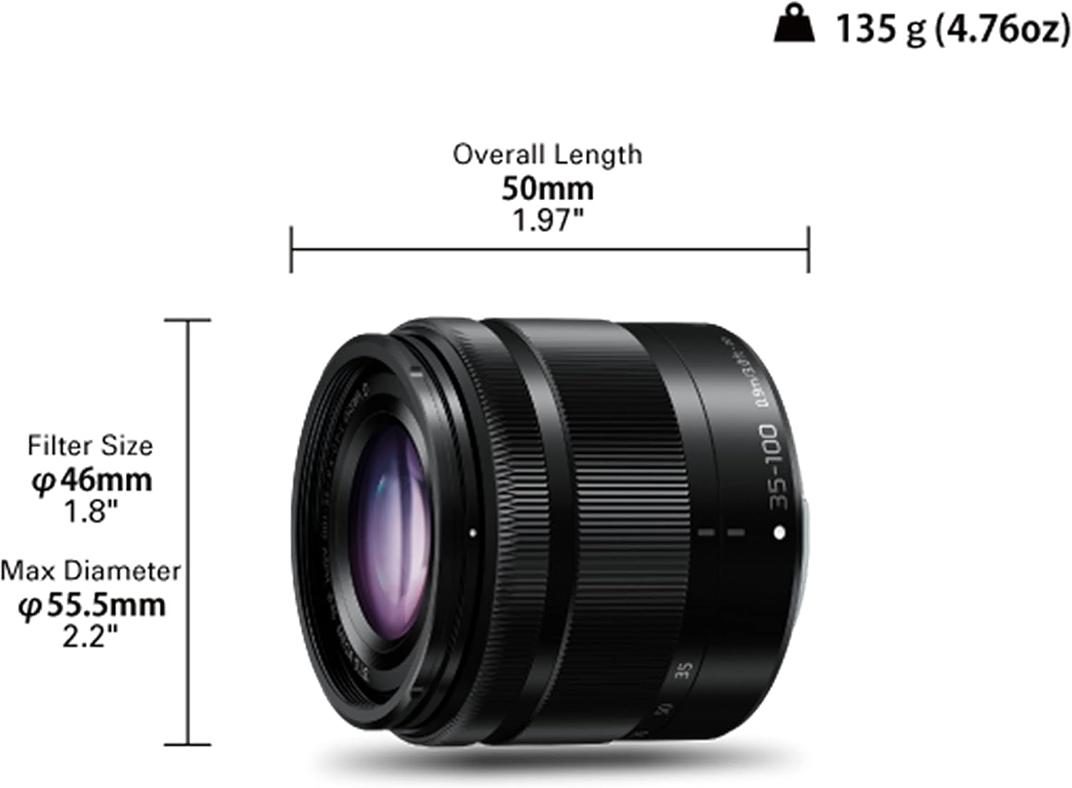 Panasonic H-FS35100E LUMIX G Vario Telezoom 35-100 mm F4.0-5.6 ASPH. Objektiv (70-200 mm KB, O.I.S. Bildstabilisator) schwarz لینک آمازون : https://www.amazon.de/dp/B00NN6J7AW?th=1&psc=1 فاصله کانونی ۳۵-۱۰۰ میلیمتر (معادل ۷۰-۲۰۰ میلیمتر در فرمت ۳۵ میلیمتری) دیافراگم F4.0 (زاویه باز) - F5.6 (تله فوتو) اندازه فیلتر Ø ۴۶ میلیمتر محتویات جعبه: لنز زوم تلهفوتو LUMIX G VARIO H-FS35100E-K (مشکی)؛ درپوش لنز؛ درپوش پشتی؛ کیف زاویه دید: ۳۴ درجه (غربی) تا ۱۲ درجه (ارتفاعی)