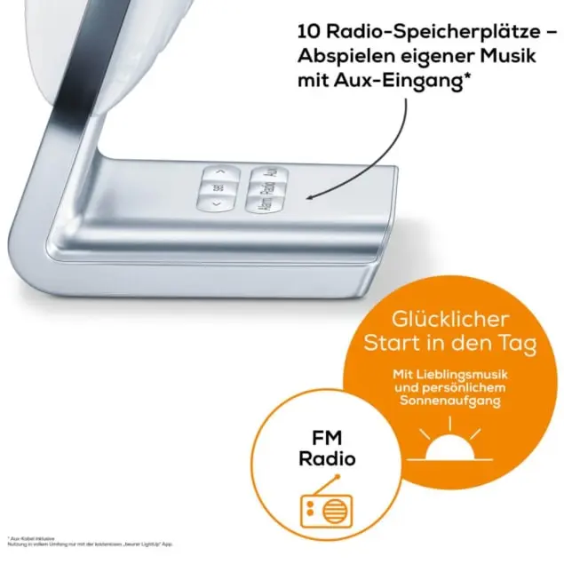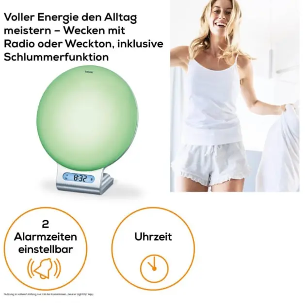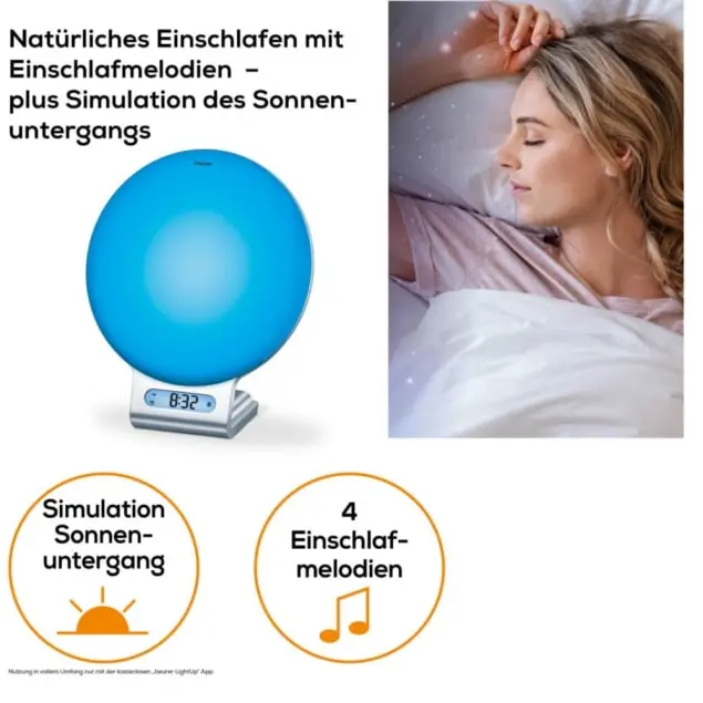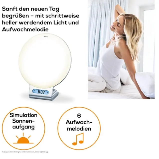 به طور طبیعی به خواب بروید و با شبیه‌سازی‌های رنگارنگ طلوع و غروب خورشید به آرامی از خواب بیدار شوید.با رادیو، صدای زنگ هشدار یا 6 ملودی بیدارباش از خواب بیدار شوید.نور حالت‌دهنده با انتخاب رنگ و قابلیت تنظیم تایمر از طریق برنامه "Beurer LightUp".