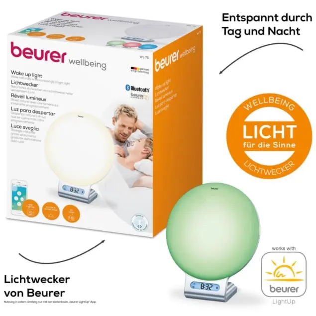 با شبیه‌سازی نور خورشید، به طور طبیعی به خواب بروید و به آرامی از خواب بیدار شوید - با ساعت زنگ‌دار WL 75 Light از Beurer و برنامه همراه "Beurer LightUp"، می‌توانید روز جدید را با آرامش در صبح آغاز کنید.