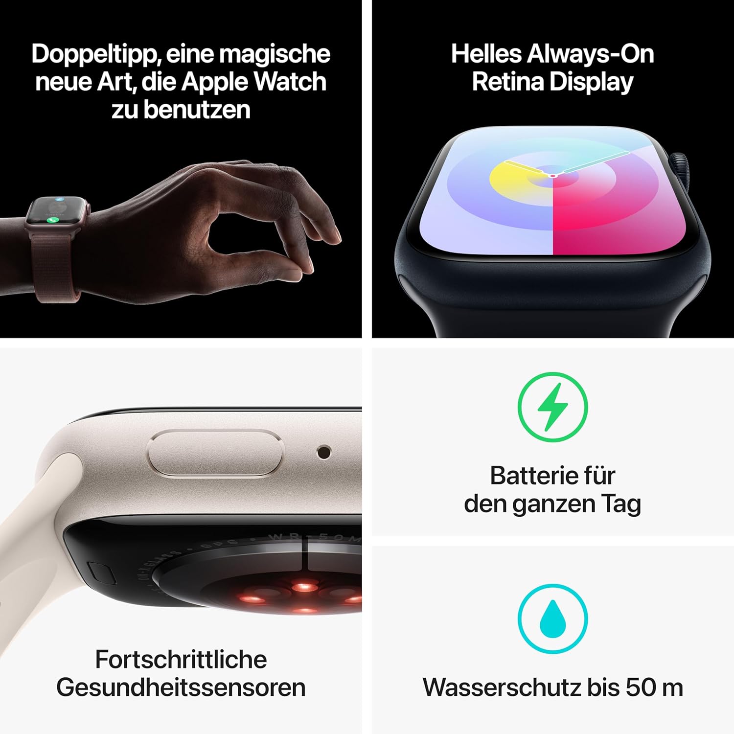 WARUM APPLE WATCH SERIES 9 – Das ultimative Tool für ein gesundes Leben kann jetzt noch mehr. Der S9 Chip ermöglicht ein superhelles Display und eine magische neue Geste, um schnell und einfach mit deiner Apple Watch zu interagieren, ohne das Display zu berühren. Fortschrittliche Features für Gesundheit, Sicherheit und Aktivität liefern wichtige Einblicke und rufen Hilfe, wenn du sie brauchst. Und überarbeitete Apps in watchOS geben dir mehr Infos auf einen Blick. FORTSCHRITTLICHE GESUNDHEITSFEATURES – Behalte deinen Blutsauerstoff im Blick. Mach jederzeit ein EKG. Erhalte Mitteilungen bei unregelmäßigem Herzrhythmus. Sieh mit dem Schlafphasen Feature, wie lange du in REM , Kern oder Tiefschlafphasen warst. Die Temperaturerkennung gibt dir Einblicke in deine allgemeine Gesundheit und deinen Zyklus. Protokolliere deinen Gemütszustand, um mehr Bewusstsein für Emotionen und mehr Resilienz aufzubauen. STARK FÜR DEINE FITNESS – Die Trainingsapp bringt dir verschiedene Trainings und fortschrittliche Messwerte für mehr Informationen über deine Workout-Performance. Und mit der Apple Watch bekommst du 3 Monate Apple Fitness+ kostenlos. INNOVATIVE SICHERHEITSFEATURES – Unfallerkennung und Sturzerkennung können bei einem schweren Autounfall oder Sturz einen Notdienst benachrichtigen. Und mit Notruf SOS reicht ein Knopfdruck, um Hilfe zu rufen. EINFACH KOMPATIBEL – Sie funktioniert nahtlos mit deinen Apple Geräten und Services. Entsperre deinen Mac automatisch. Lass dir mit der Genauen Suche auf unterstützten iPhone Modellen die ungefähre Entfernung und Richtung zu deinem iPhone anzeigen. Bezahle mit Apple Pay. Die Apple Watch Series 9 erfordert ein iPhone XS oder neuer mit iOS 17 oder neuer. EINFACH PERSONALISIERBAR – Pass deine Watch an deine Stimmung oder den Moment an. Mit Armbändern in einer Vielzahl von Stilen, Materialien und Farben und stylischen, funktionalen Zifferblättern mit Komplikationen für alles, was dich interessiert. UNGLAUBLICHE LANGLEBIGKEIT – Hart, aber härter. Sie ist bruchgeschützt, nach IP6X staubgeschützt und schwimmfest mit 50 m Wasserschutz. BLEIB IN VERBINDUNG – Sende unterwegs eine Textnachricht, mach einen Anruf, hör Musik und Podcasts, verwende Siri und erhalte Mitteilungen. Die Apple Watch Series 9 (GPS) funktioniert mit deinem iPhone und im WLAN, damit du in Verbindung bleibst. | قیمت یورویی : 349.26€