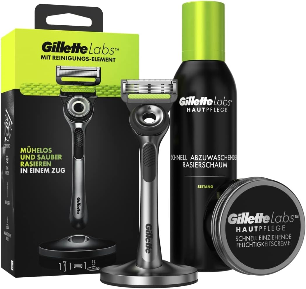 Gillette Labs Rasierer für Männer: Für eine mühelose und saubere Rasur mit dem Nassrasierer in jedem Zug, auch als Intimrasierer für den Mann geeigent Gillette Nassrasierer mit integriertem Reinigungs-Element entfernt Schmutz und Ablagerungen bevor die Klingen über die Haut fahren; Die 2D-Flexdisc passt sich an dein Gesicht an, um Komfort und Kontakt bei jedem Zug zu gewährleisten Die ultraleichte Feuchtigkeitscreme für das Gesicht zieht schnell ein, ohne dass sich deine Haut klebrig oder fettig anfühlt; Angereichert mit Niacinamide (Vitamin B3), versorgt sie deine Haut sofort mit Feuchtigkeit und stärkt die Feuchtigkeitsbarriere im Laufe der Zeit Der Rasierschaum mit Seetang hat eine leichte Formel, die sich schnell und einfach abwaschen lässt, sorgt für müheloses Gleiten des Rasierers und schützt deine Haut während der Rasur Atmungsaktives Gefühl: Feuchtigkeitscreme + Rasierschaum mit besonderem Fokus auf die Haut entwickelt, ohne Alkohol und Farbstoffe hergestellt; Zedernholz und Orangenschale schaffen einen eleganten und maskulinen Duft | قیمت یورویی : 33.78€