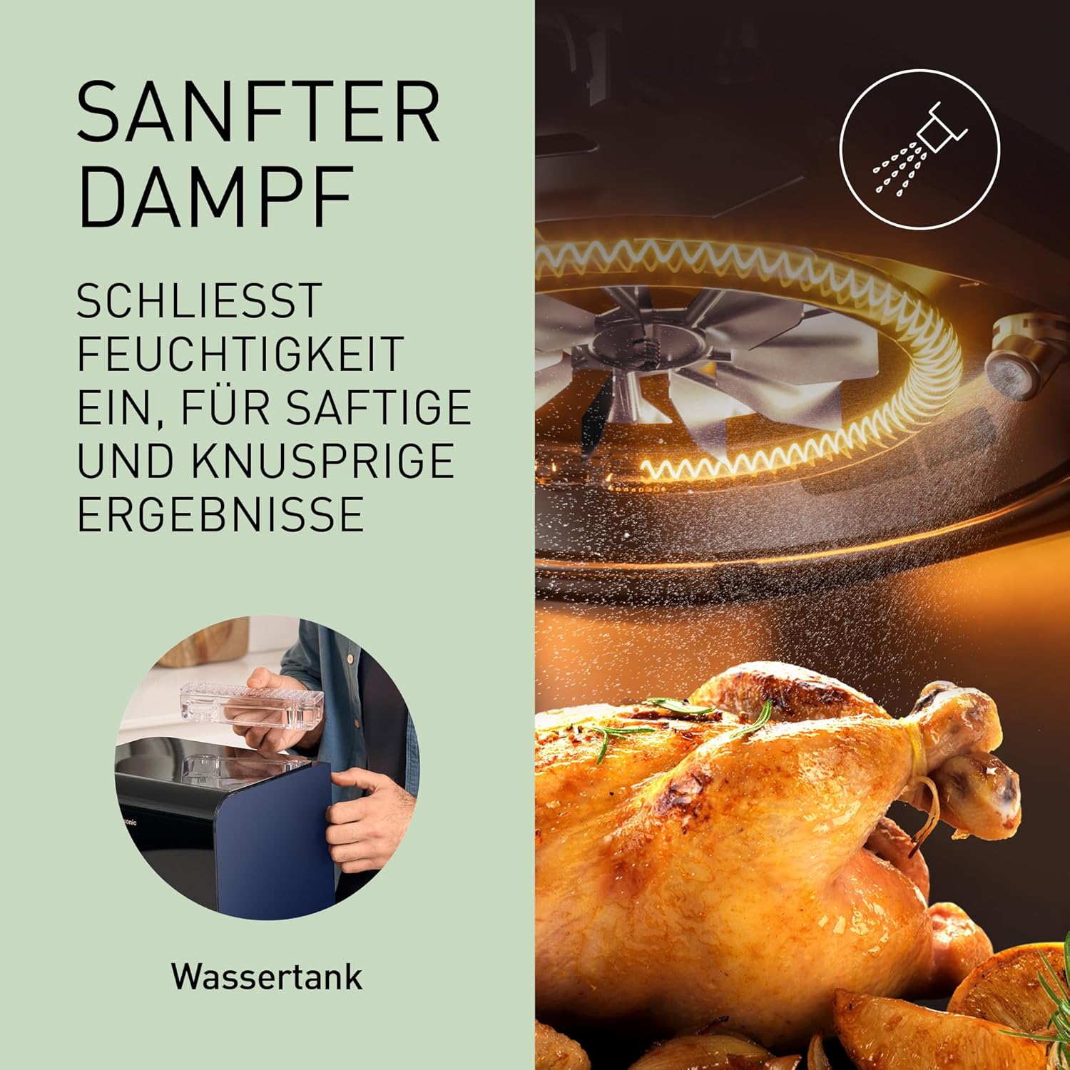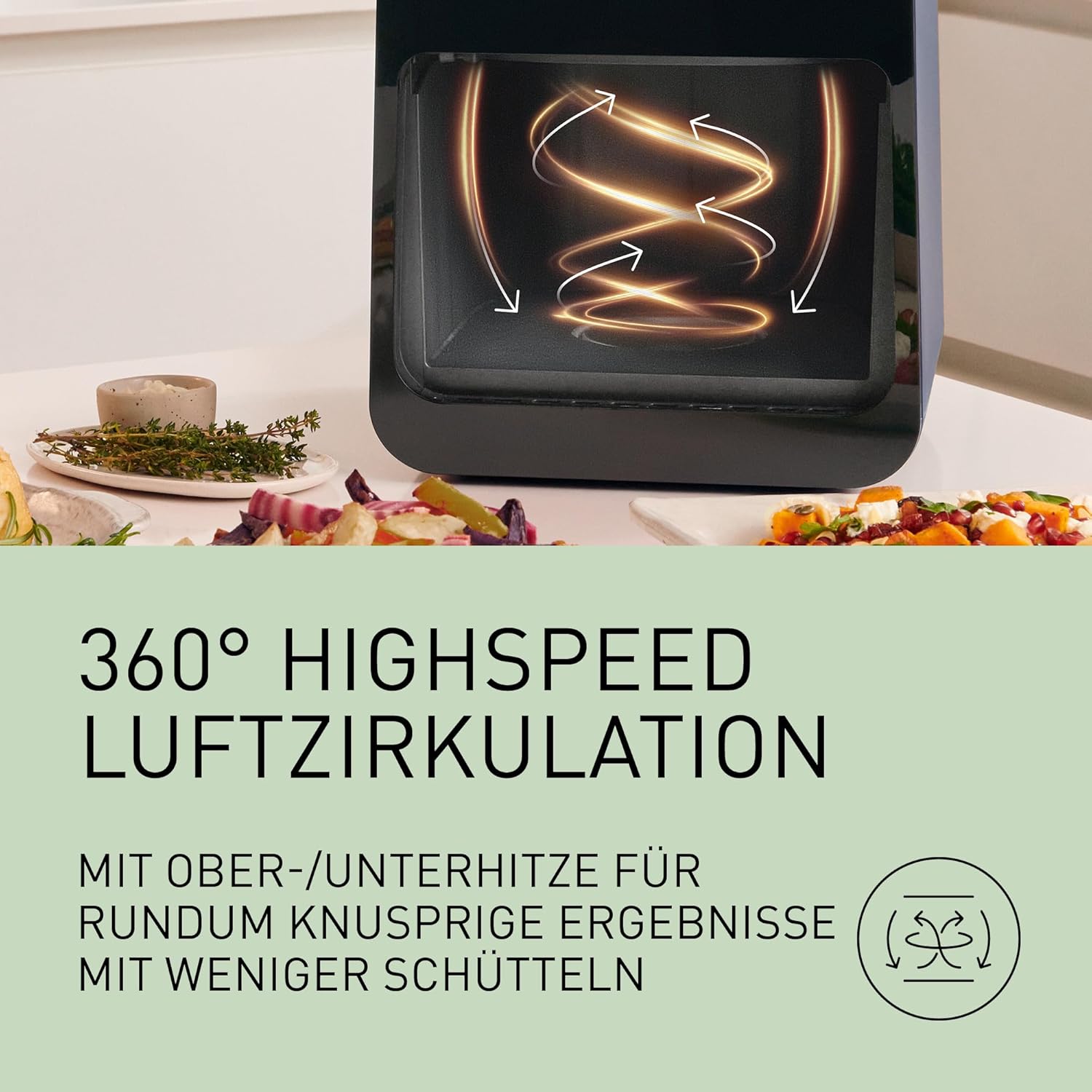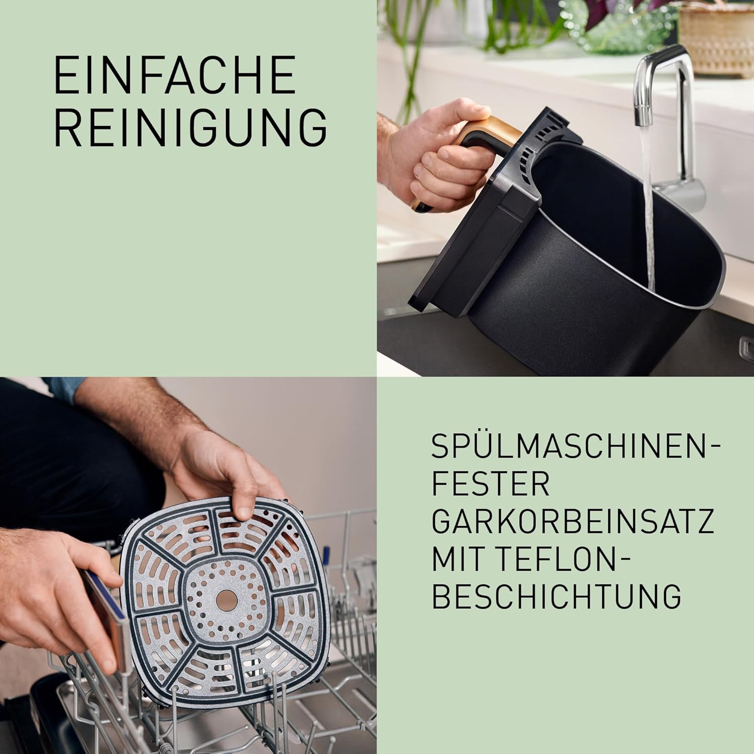 SANFTE DAMPFZUGABE: Saftige, krosse Mahlzeiten, die dank der Dampfzugabe innen saftig und außen knusprig bleiben SICHTFENSTER & LICHT: Mit dem Sichtfenster aus gehärtetem Glas und dem LED-Licht haben Sie Ihre Speisen im Auge, ohne den Garkorb zu öffnen. Das spart Energie und Wärme, während das Design zu jeder Inneneinrichtung passt 11 VOREINGESTELLTE MENÜS: Auf dem digitalen LED-Panel können 11 Menüs ausgewählt werden, darunter Pommes, Hühnchen, Fisch, Meeresfrüchte, Steaks, Würstchen, Gemüse, Kartoffeln, Pizza, Kuchen und Toast 360° HIGHSPEED LUFTZIRKULATION: Krosse Mahlzeiten wie vom Grill und ein schnelles, gleichmäßiges Garen mit doppelter Ober- und Unterhitze und starkem Ventilator, sodass kein Schütteln oder Wenden mehr nötig ist, für fettarme, gesunde Mahlzeiten wie aus dem Ofen GESÜNDERES FRITTIEREN: Gesündere, knusprigere Gerichte mit wenig bis gar keinem Öl, während der teflonbeschichtete Garkorbeinsatz überschüssiges Öl ableitet und somit Gerüche reduziert EINFACHE REINIGUNG: Sparen Sie Zeit beim Reinigen dank Antihaftbeschichtung und abnehmbaren Teilen, einschließlich teflonbeschichtetem, spülmaschinenfestem Garkorbeinsatz und einem Garkorb, der sich leicht mit Spülmittel und Wasser ausspülen lässt | قیمت یورویی : 99.99€