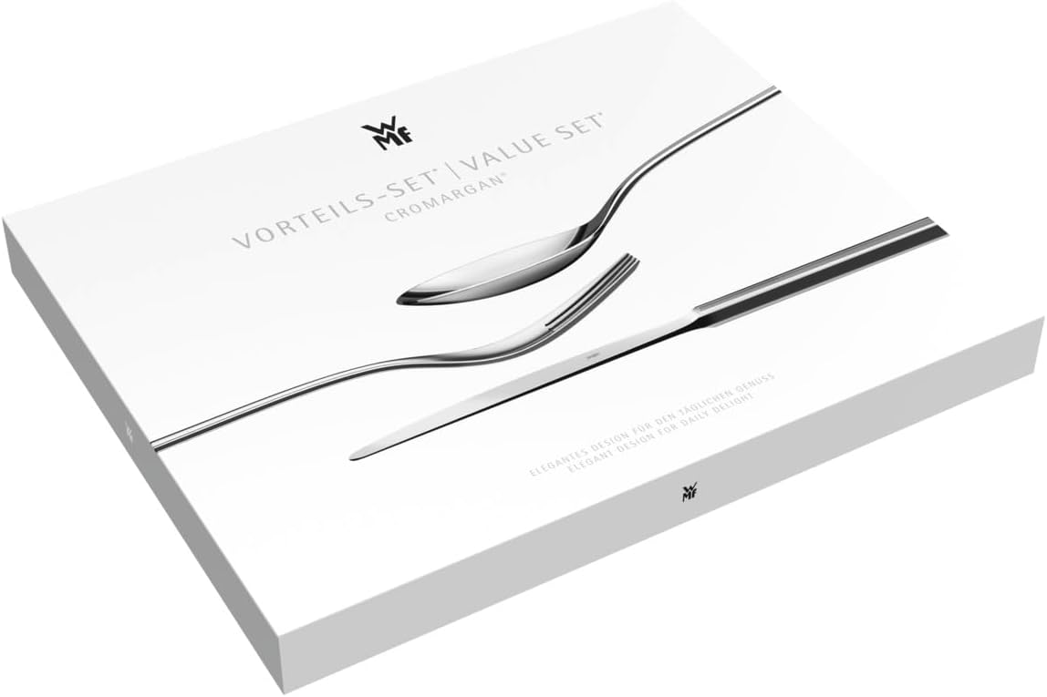 Inhalt: Besteckset 12 Person (60 Teile): je 12 Gabeln, TafelMesser Monobloc, Löffel, Kuchengabeln, Tee-/ Kaffeelöffel - Artikelnummer: 1224009000 Material: Cromargan Edelstahl 18/10, poliert (glänzend). Für außergewöhnliche Langlebigkeit und Hygiene. Farbecht, pflegeleicht, geschmacksneutral und beständig gegen Speisesäuren Das Monoblocmesser liegt gut in der Hand und hat ein ausgewogenes Gewicht. Die Messer werden aus einem Stück rostfreien Klingenstahls geschmiedet und dann gehärtet. Zusätzlich sorgt ein speziell entwickelter Wellenschliff für lang anhaltende, optimale Schärfe Auffällige Hammerschlagoptik, charmant geschwungene, ausgewogene Linien, jedes Besteckteil ein Statement hochwertigen Designs – so begeistert Sitello von WMF auf jedem Tisch Ein Genuss im täglichen Gebrauch: WMF Besteck verbindet einzigartiges Design mit höchster Qualität. Jedes Stück bietet eine angenehme Haptik und liegt perfekt in der Hand WMF Bestecke sind mit viel Sorgfalt in höchster Qualität gefertigt und zur mühelosen Reinigung spülmaschinenfest. Das Besteck-Set wird in einem hochwertigen Besteckkasten geliefert, der eine sichere und praktische Aufbewahrung ermöglicht | قیمت یورویی : 240.86€